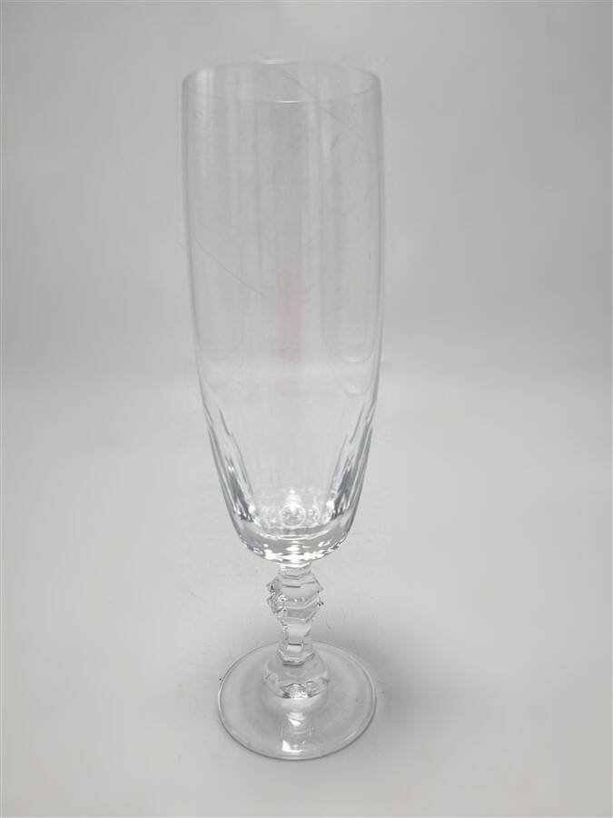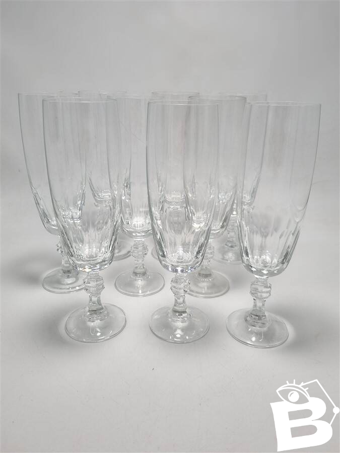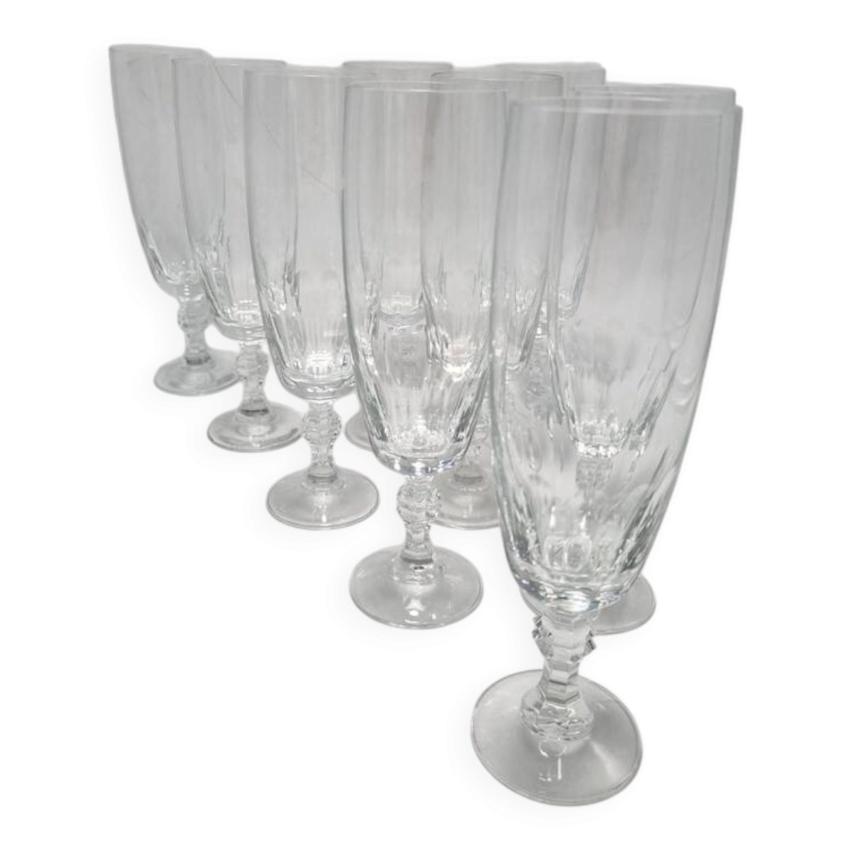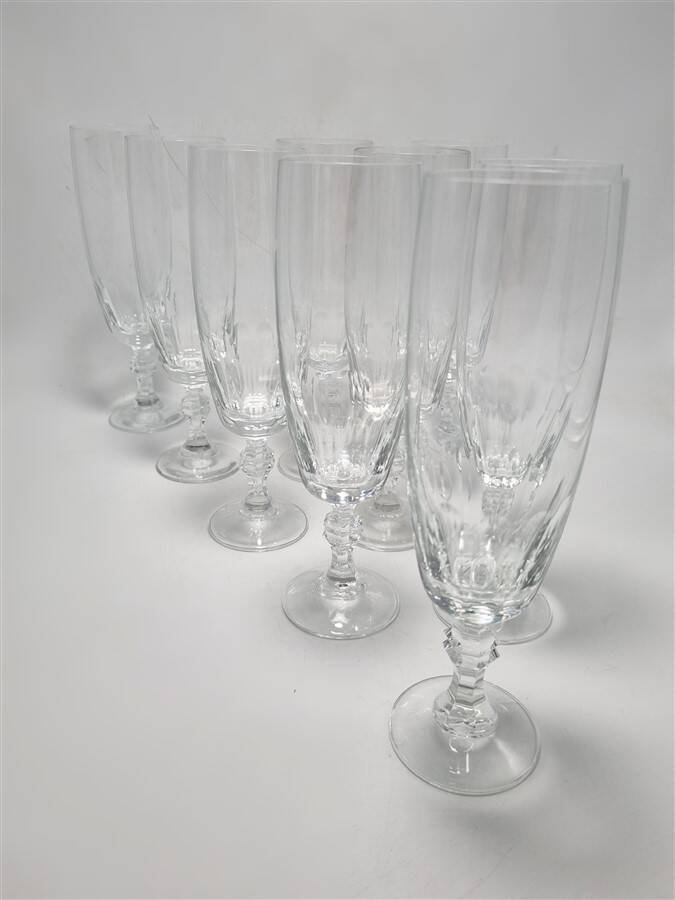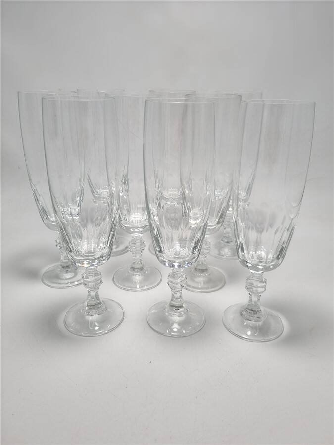 9 flûtes à champagne, en cristal non signé.Dimensions : 19.3 x 5.5 cm (profondeur : 12.5 cm)Poids moyen du lot : 1.3 kg