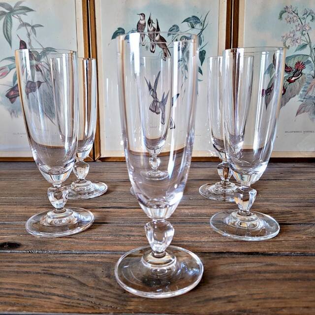 Ces flûtes à champagne en cristal vintage offrent une présence douce et élégante sur la table.Le cristal capte la lumière avec subtilité, faisant danser les bulles à chaque mouvement.Ces flûtes évoquent les tables conviviales, les célébrations simples mais sincères, où l’on partage un moment sans ostentation, avec le plaisir des belles choses.Elles ont été utilisées, elles sont en bel état, avec de légères traces d’usage comme de petites griffures au pied.?diamètre 5, 4 cm environ X hauteur 17, 5 cm environ.Poids des 6 flûtes: environ 1300 gr.