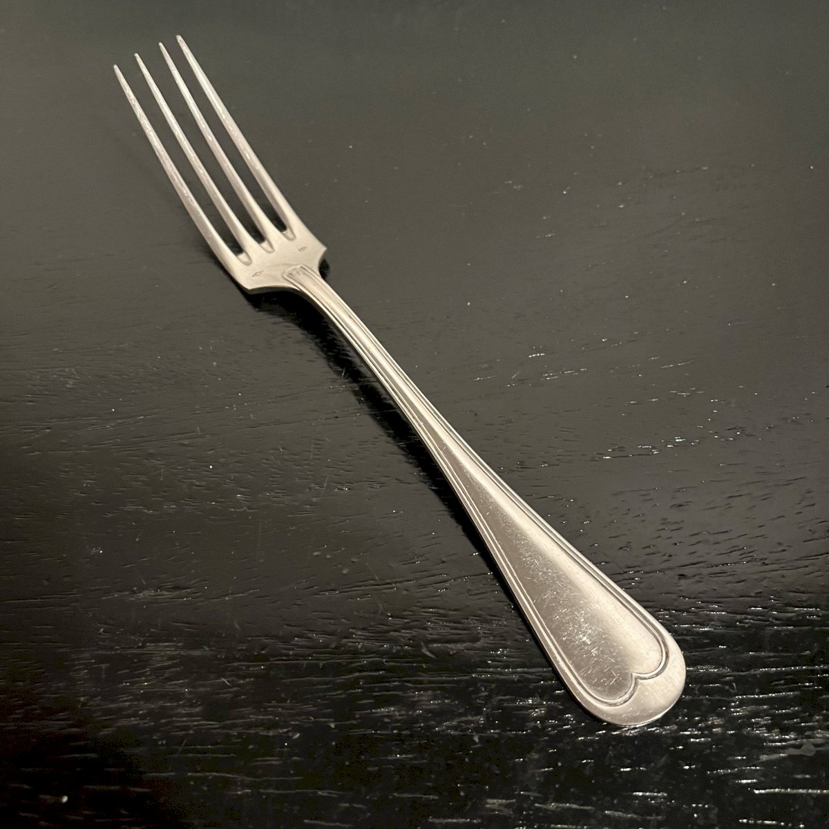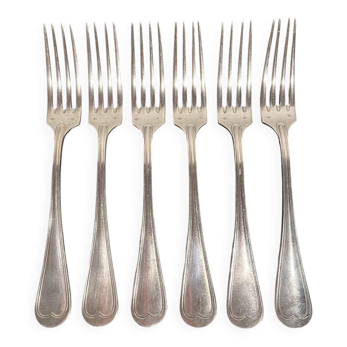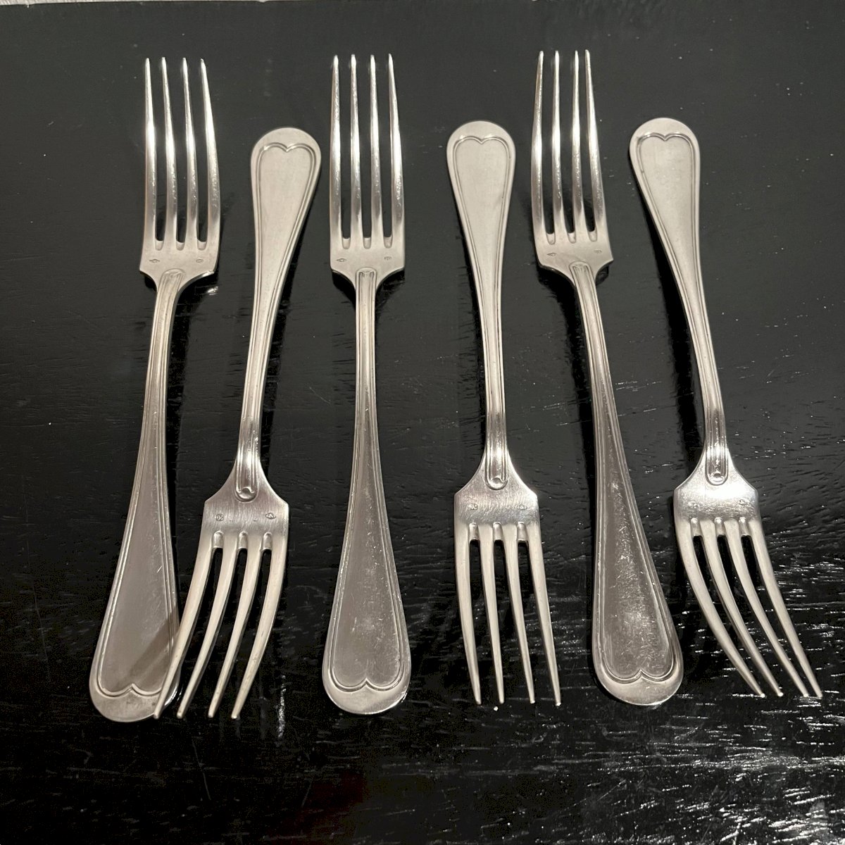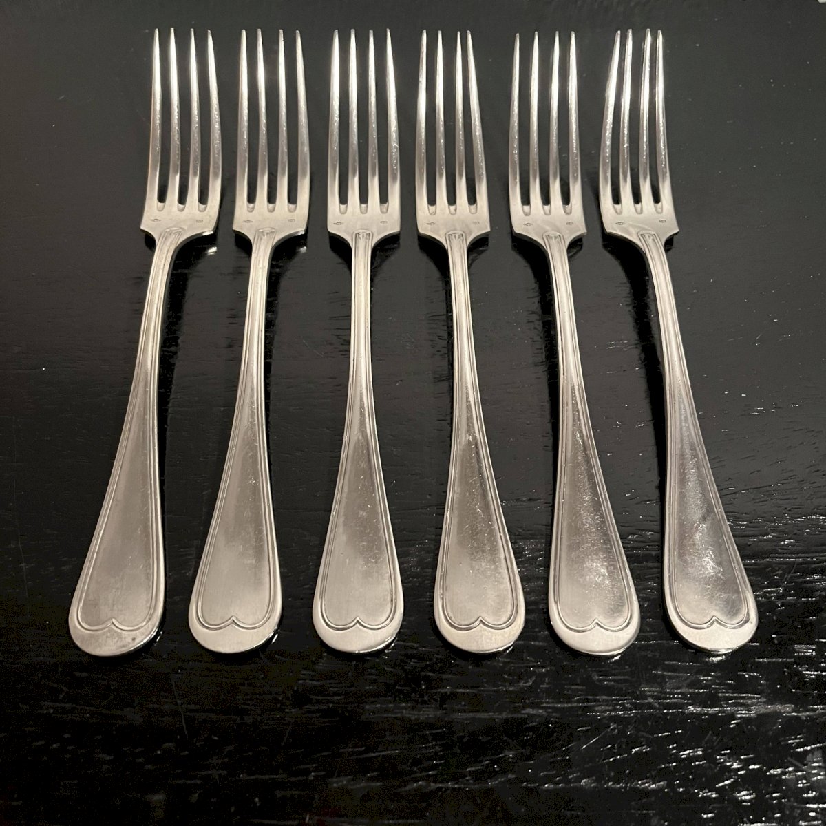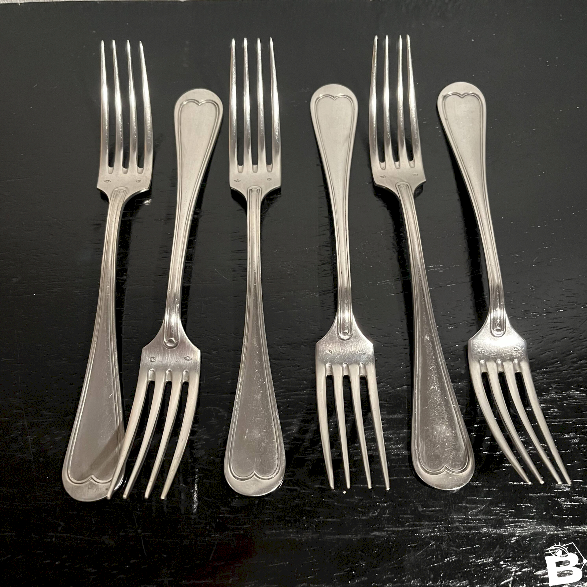Lot de 6 fourchettes en métal argenté modèle filet.Longueur: 21 cm.Cuillères à soupe assorties (n'hésitez pas à regrouper vos achats pour réduire les frais d'expédition).