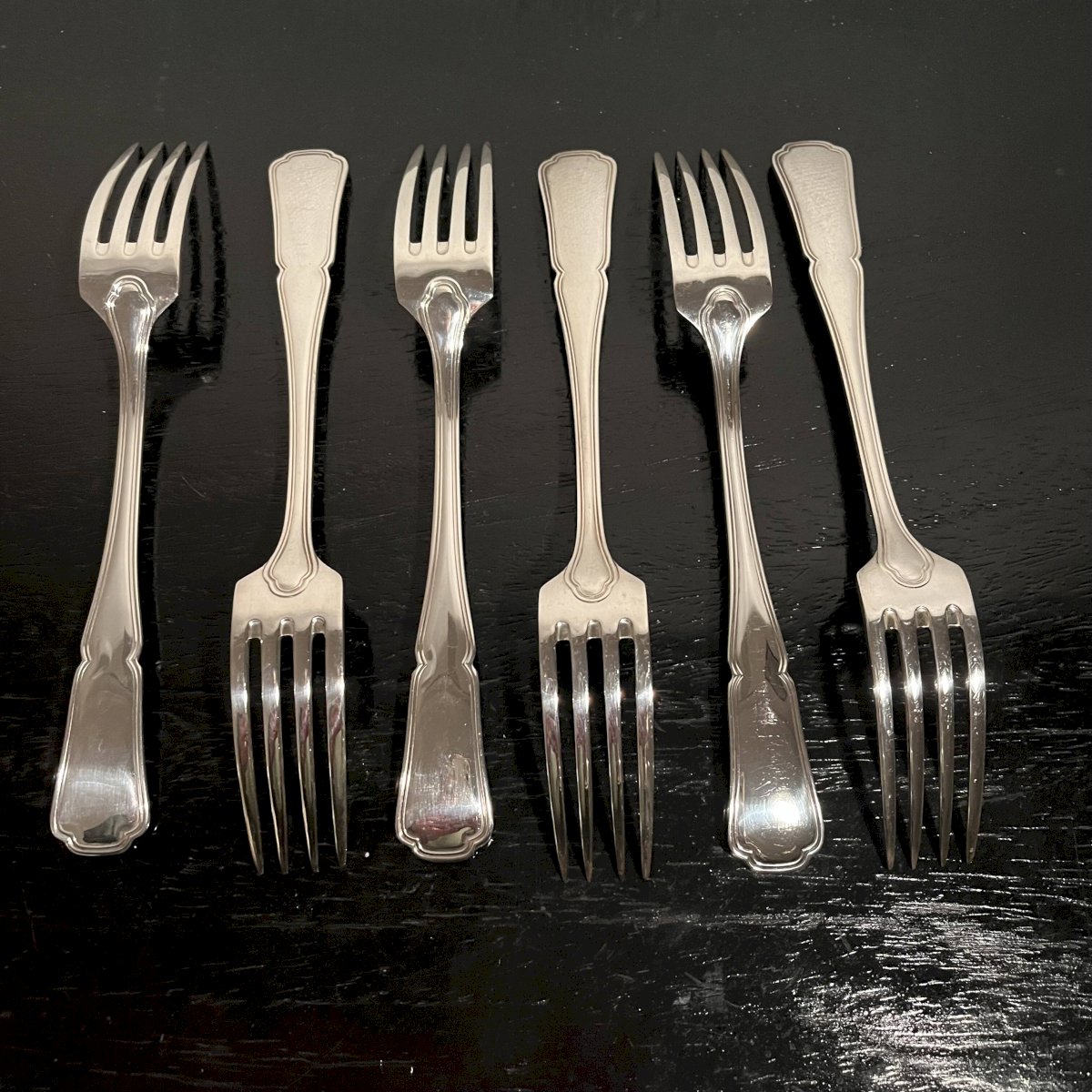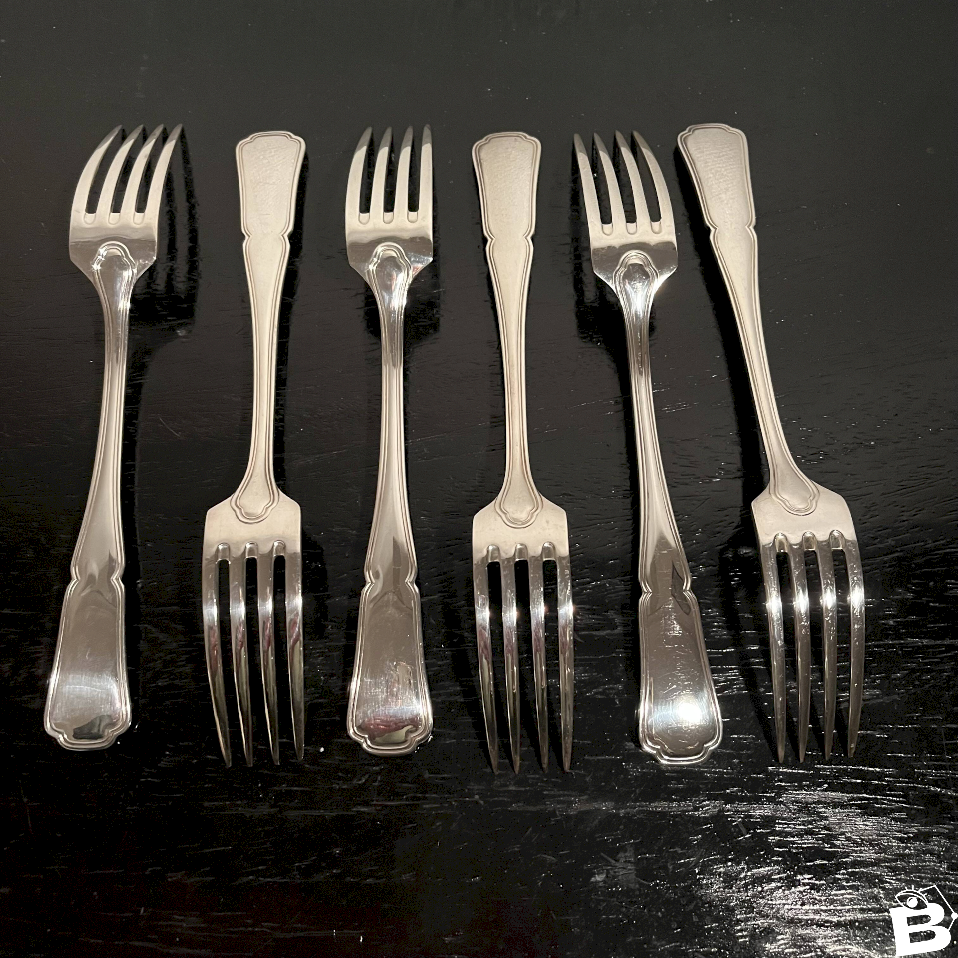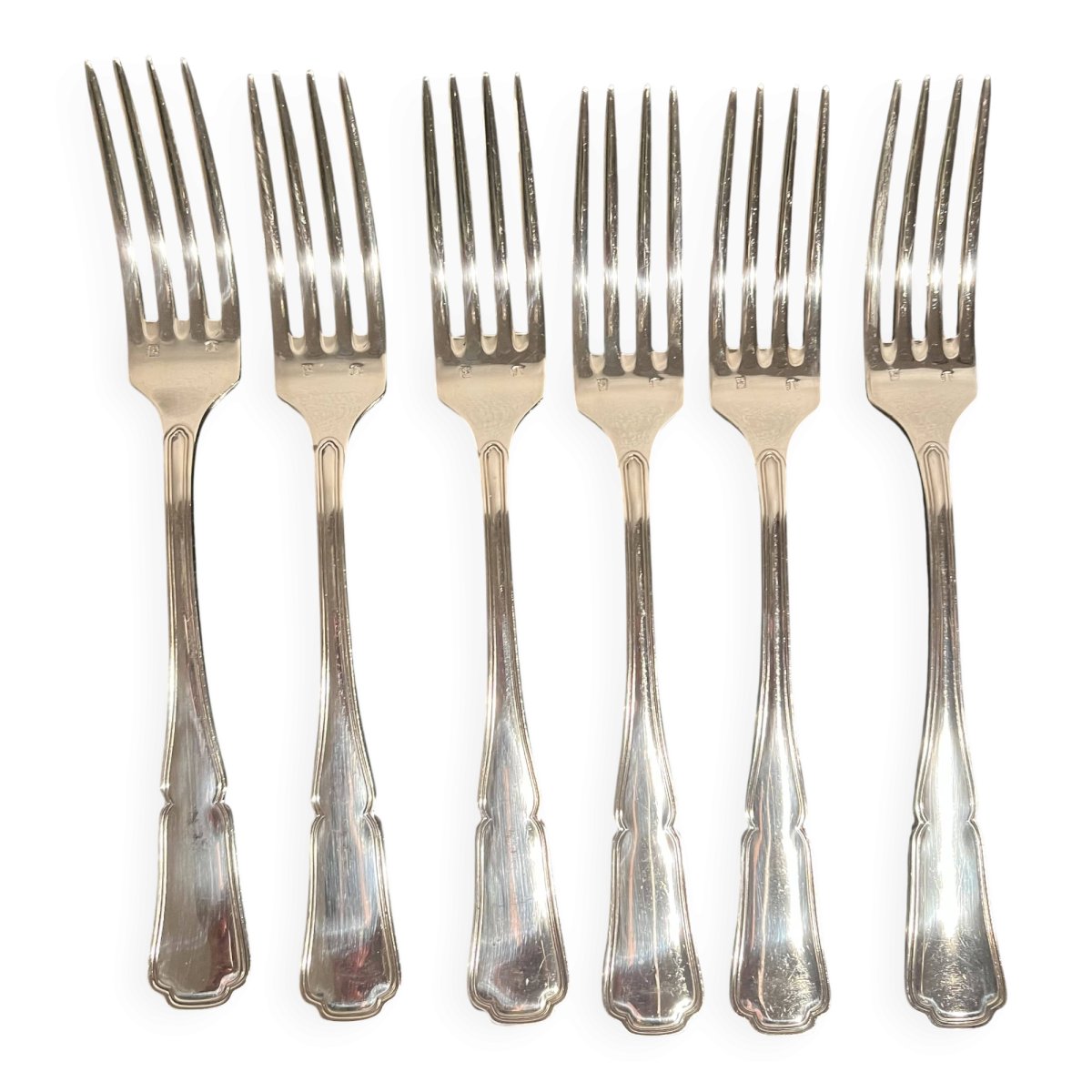Lot de 6 fourchettes en métal argenté.Manufacture NC Noel Collet.Longueur: 20 cm.