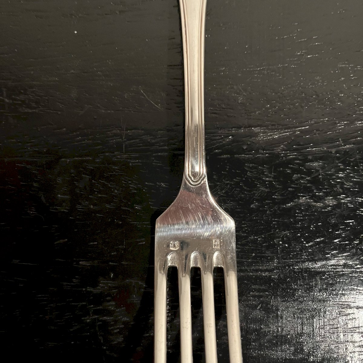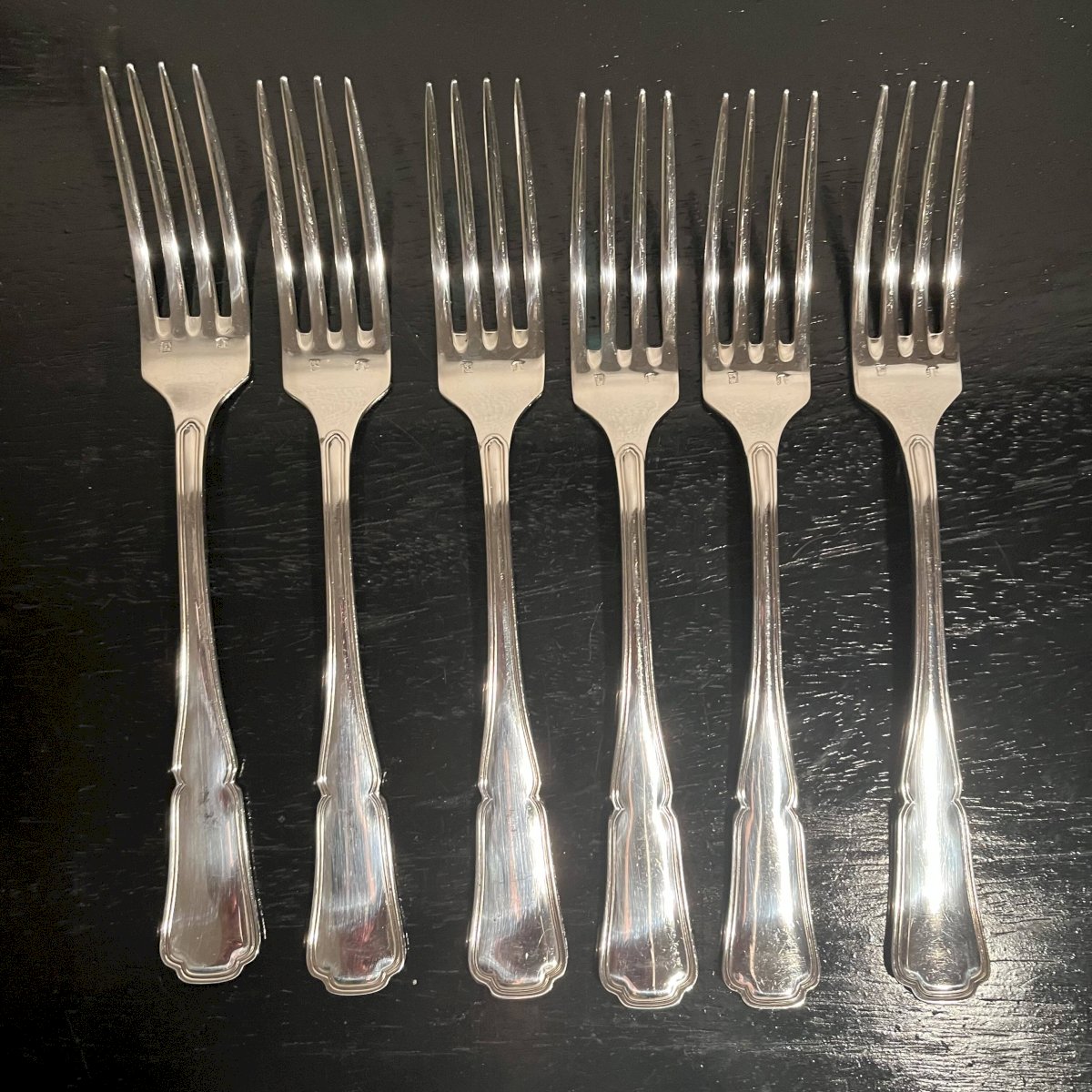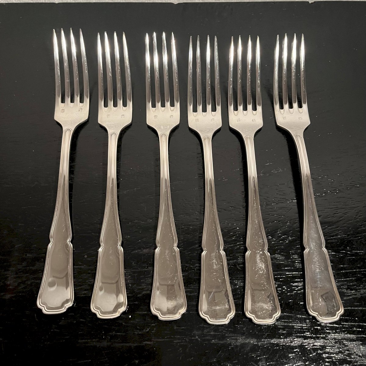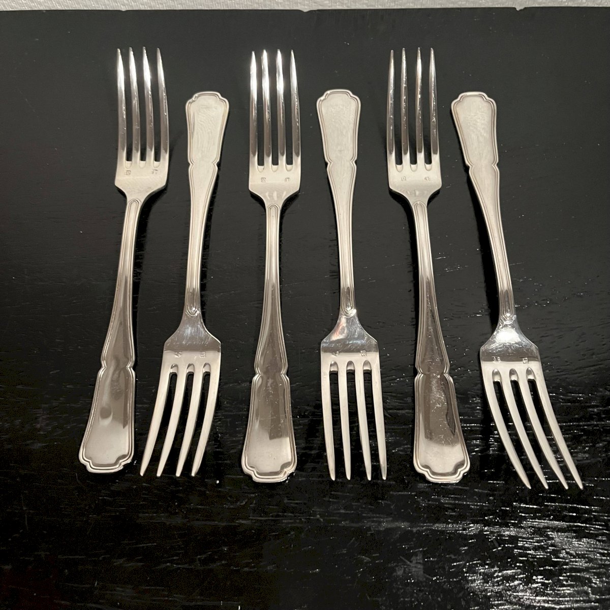 Lot de 6 fourchettes en métal argenté.Manufacture NC Noel Collet.Longueur: 20 cm.