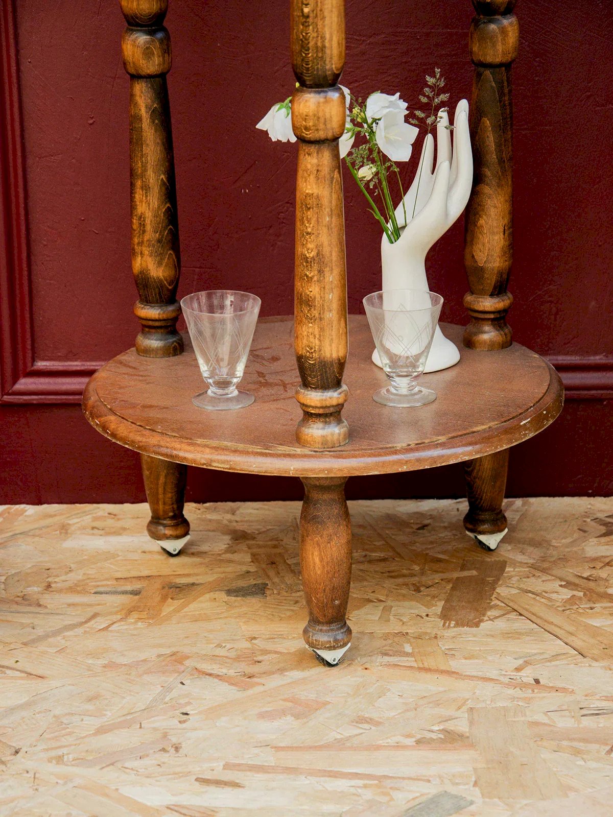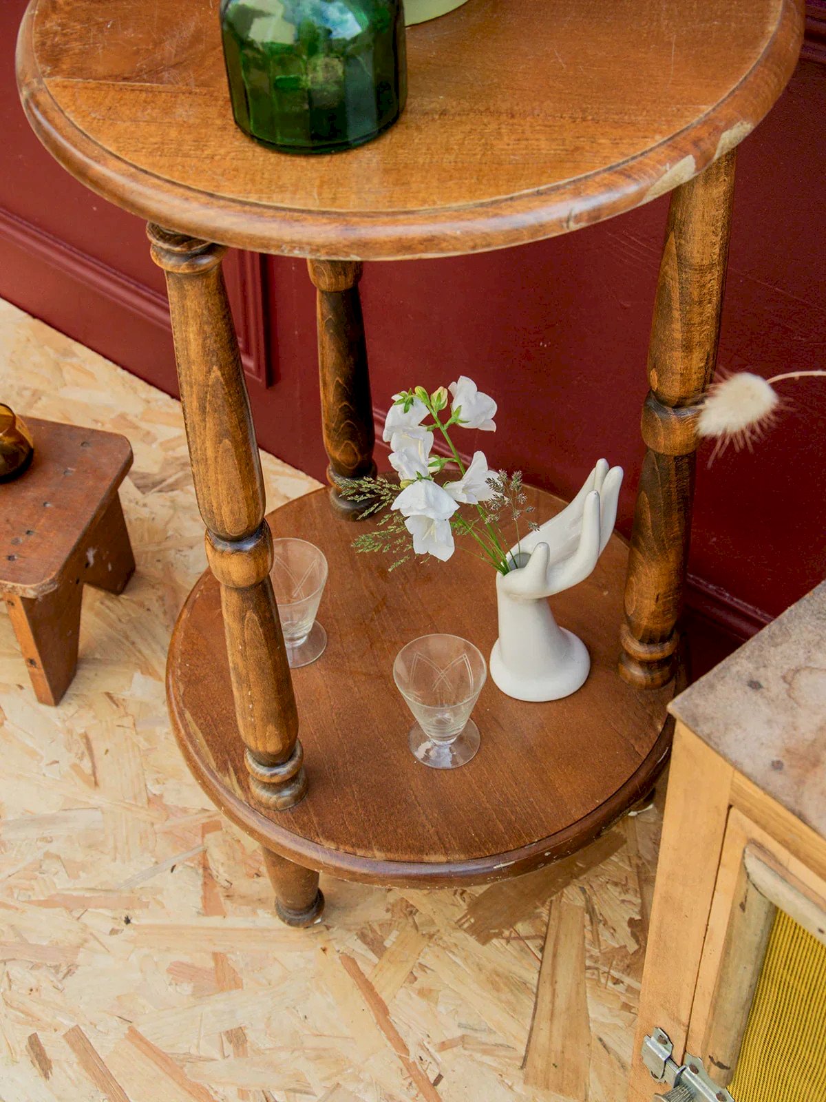 Découvrez cette élégante table d’appoint, vintage et ronde sur trois pieds, dotée de mini roulettes pour une mobilité optimale. Son design et sa finition soignée lui permettent de s’intégrer avec élégance dans tous les styles d’intérieur. Idéale pour un salon ou une chambre, elle apporte une touche de charme tout en offrant un espace pratique pour vos boissons, livres ou objets du quotidien. Un parfait équilibre entre style et fonctionnalité pour sublimer votre décoration. Hauteur : 69 cm Diamètre : 38 cm État:Occasion: Objet ayant été utilisé. Objet présentant quelques marques d'usure superficielle, ...Occasion: Objet ayant été utilisé. Objet présentant quelques marques d'usure superficielle, entièrement opérationnel et fonctionnant correctement. Il peut s'agir d'un modèle de démonstration ou d'un objet retourné en magasin après une courte période d'utilisation. les éventuelles imperfections. Marque:Debongout Type:Produit chiné Matériau:Bois Style:Campagne Personnalisé:Tables d'appoint