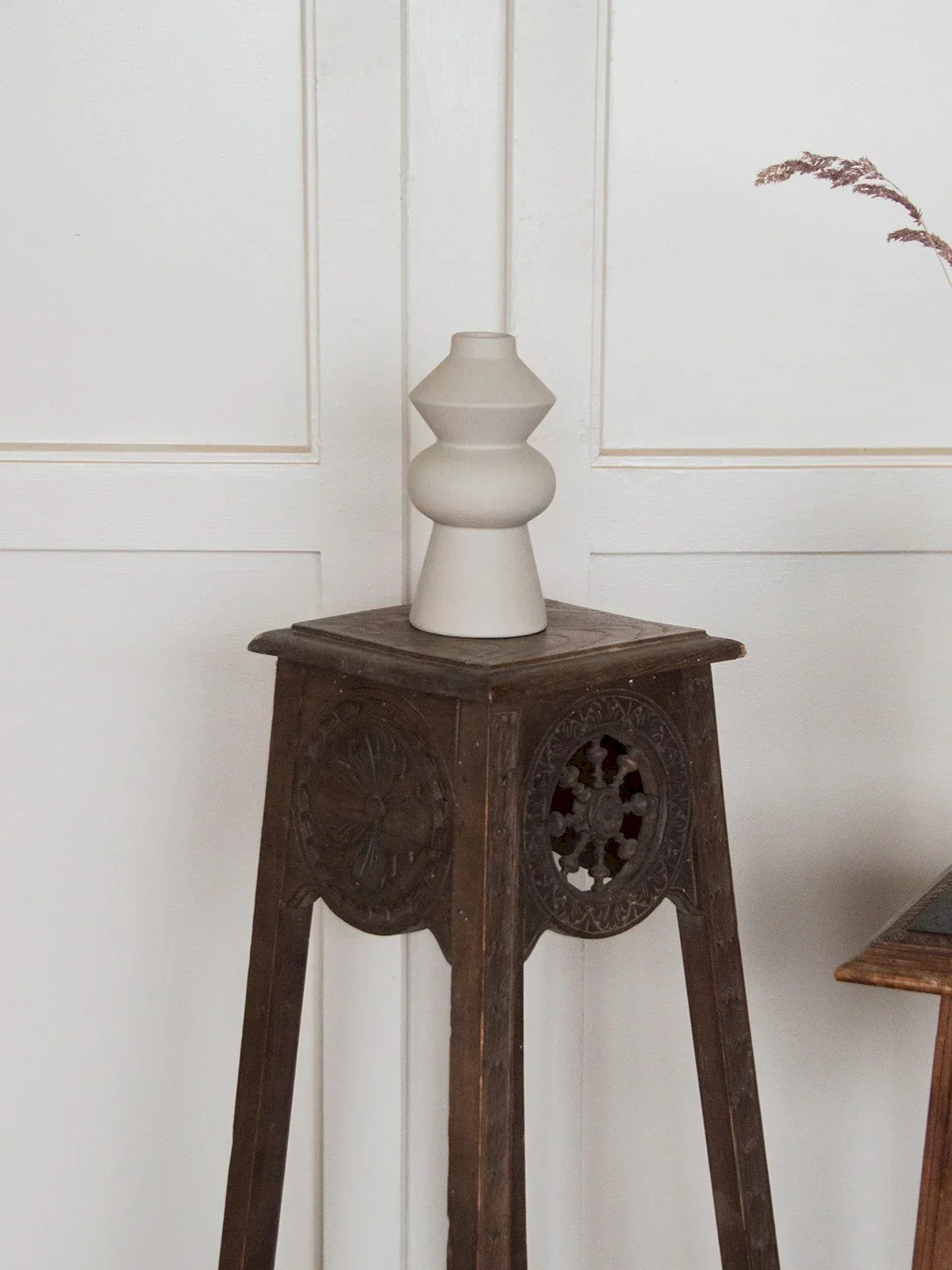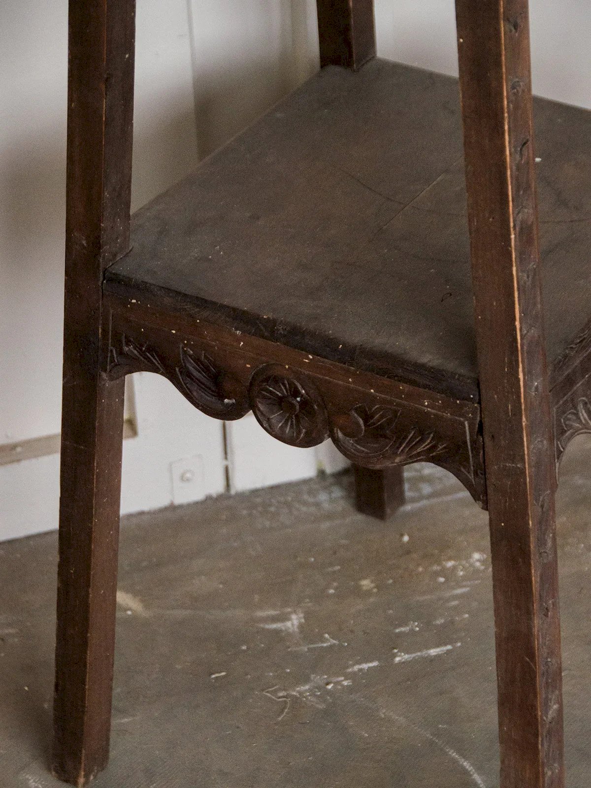 Offrez vous une table d'appoint haute en bois foncé, alliant élégance et fonctionnalité. Dotée d'une étagère pratique, elle offre un espace de rangement supplémentaire exposant ses magnifiques détails sculptés dans le bois. Parfaite pour apporter une touche raffinée à votre intérieur, cette table s'intègre harmonieusement dans tous les styles de décoration. Ajoutez une note d'originalité à votre espace de vie pour mettre en valeur vos objets préférés ! Exclusivité web, la rencontre se fera chez vous ! Longueur : 24 cm Largeur : 25 cm Hauteur : 115 cm État:Occasion: Objet ayant été utilisé. Objet présentant quelques marques d'usure superficielle, ...Occasion: Objet ayant été utilisé. Objet présentant quelques marques d'usure superficielle, entièrement opérationnel et fonctionnant correctement. Il peut s'agir d'un modèle de démonstration ou d'un objet retourné en magasin après une courte période d'utilisation. les éventuelles imperfections. Marque:Debongout Type:Produit chiné Matériau:Bois Style:Campagne Personnalisé:Tables d'appoint
