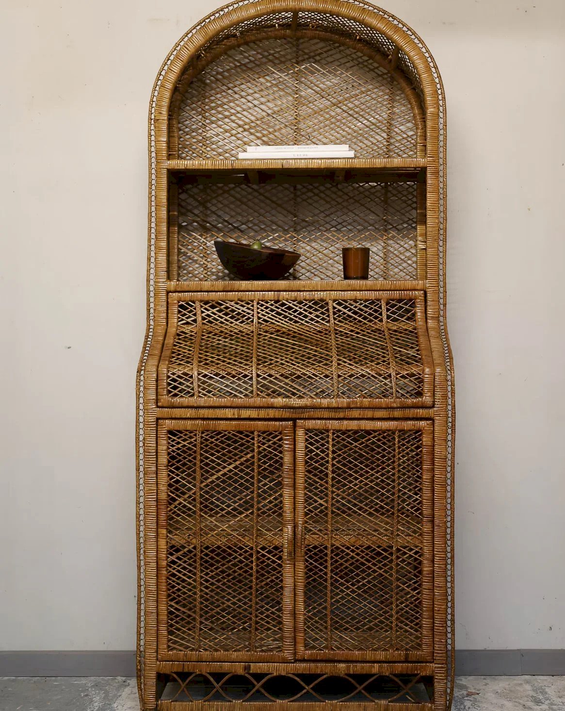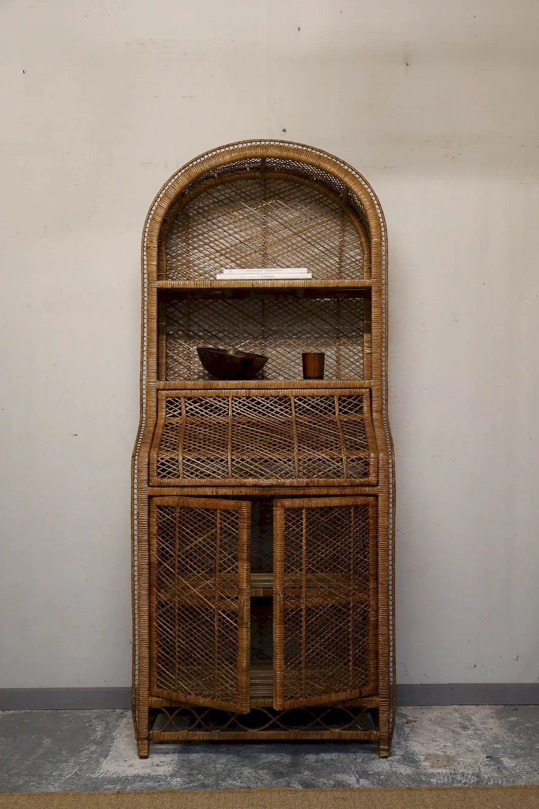 Invitez une atmosphère de jardin d'hiver avec cette grande étagère italienne en rotin tressé, vintage des années 1970, au beau travail artisanal. Ses proportions généreuses et sa structure robuste offrent un bel équilibre entre présentation et rangement, avec une partie basse ouvrante à deux portes pour les objets volumineux et des compartiments supérieurs, dont un abattant, pour exposer livres et plantes. Le tressage délicat diffuse une ambiance chaleureuse et déco. Quelques traces du temps présentes. Longueur : 78 cm Largeur : 46 cm Hauteur : 198 cm Hauteur partie abattant intérieur : 29 cm Hauteur partie haute : 29 cm Hauteur sous la voute : 42 cm État:Occasion: Objet ayant été utilisé. Objet présentant quelques marques d'usure superficielle, ...Occasion: Objet ayant été utilisé. Objet présentant quelques marques d'usure superficielle, entièrement opérationnel et fonctionnant correctement. Il peut s'agir d'un modèle de démonstration ou d'un objet retourné en magasin après une courte période d'utilisation. les éventuelles imperfections. Marque:Debongout Type:Produit chiné Matériau:Rotin Style:Campagne Personnalisé:Etagères