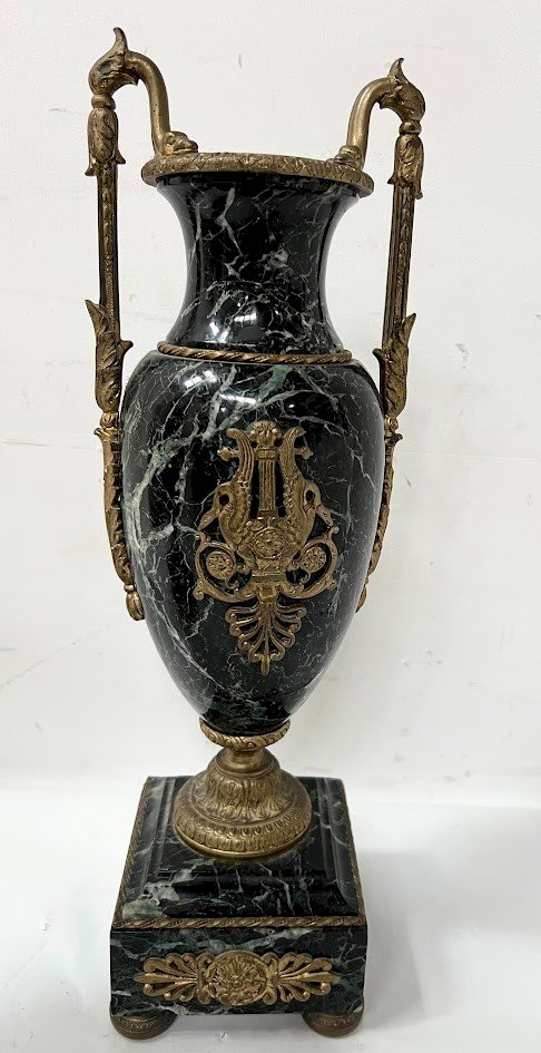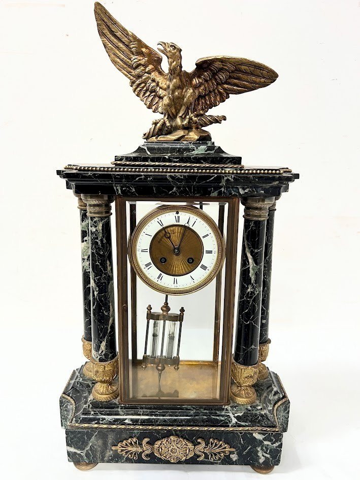 Garniture de cheminée de style Empire en marbre et bronze Pendule cage a colonnes surmonté de l'aigle impérial Deux vases urnes en marbre vert de mer Marbre vert de mer orné de bronze ciselé doré Cadran en chiffre romain et balancier au mercure Bon état Dimension Pendule H 61 x L 37 x16 cm Vases H 44 x L 12 x 12 cm Epoque XIX siècle Origine:France Pays d'origine:France Hauteur:61 Matière:Marbre Style:Napoléon III Longueur:37 Largeur:16