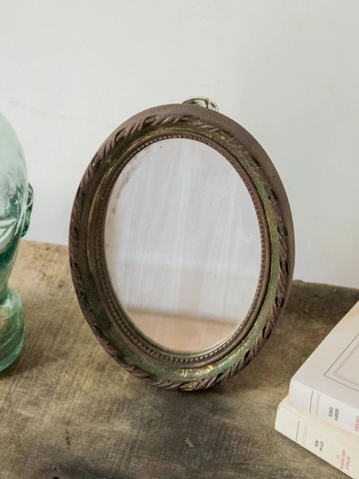Ce miroir ovale se pare d’une délicate frise, mêlant élégance et charme discret. Les petites traces d’usure sur sa surface racontent son histoire et apportent une authenticité chaleureuse à votre intérieur. Facile à accrocher, il sublime vos murs ou accompagne votre quotidien avec poésie, offrant une note raffinée et intemporelle à votre décor. Largeur : 15,5 cm Hauteur : 20,5 cm Profondeur : 3 cm État:Occasion: Objet ayant été utilisé. Objet présentant quelques marques d'usure superficielle, ...Occasion: Objet ayant été utilisé. Objet présentant quelques marques d'usure superficielle, entièrement opérationnel et fonctionnant correctement. Il peut s'agir d'un modèle de démonstration ou d'un objet retourné en magasin après une courte période d'utilisation. les éventuelles imperfections. Marque:Debongout Type:Produit chiné Matériau:Verre, Bois Style:Campagne