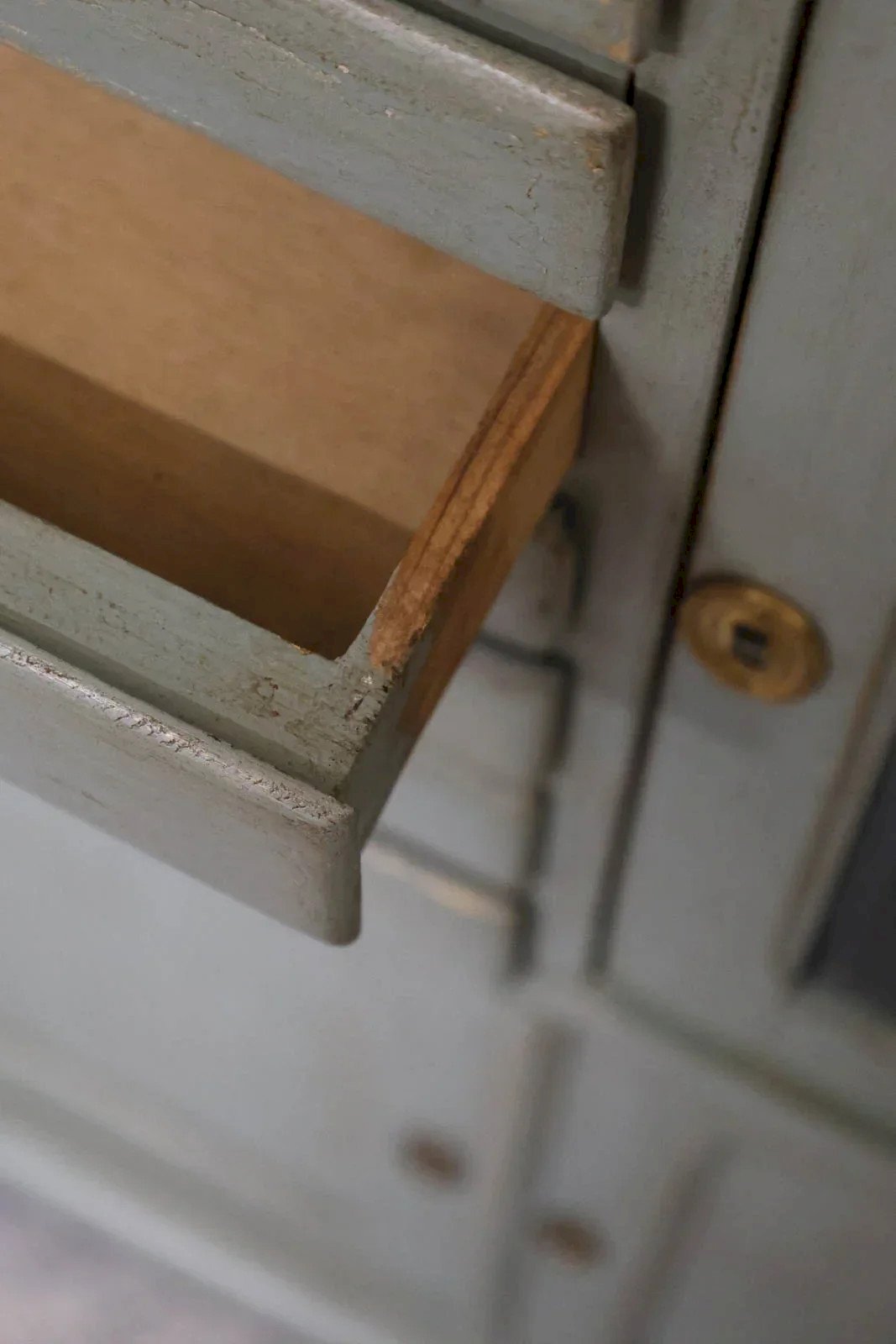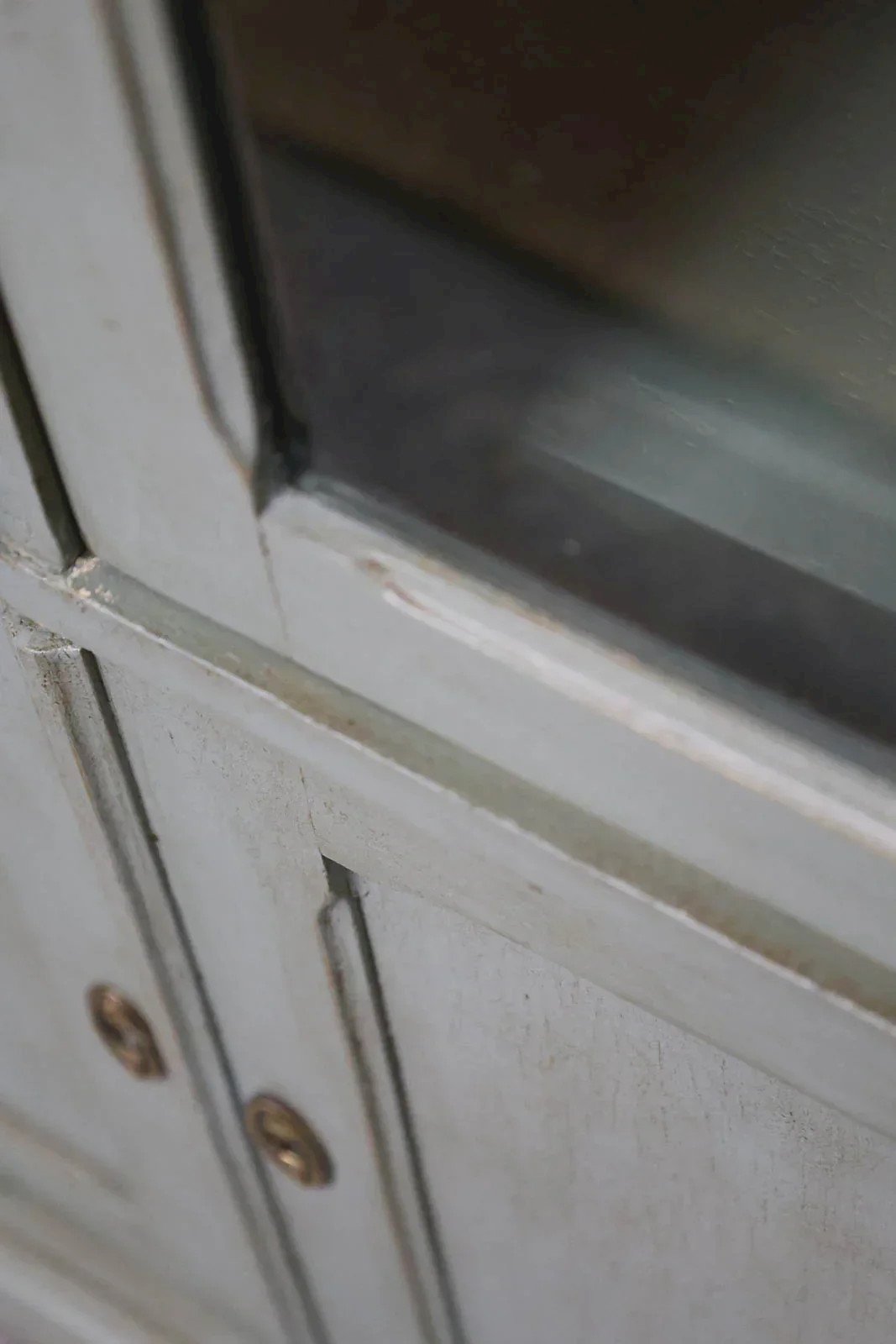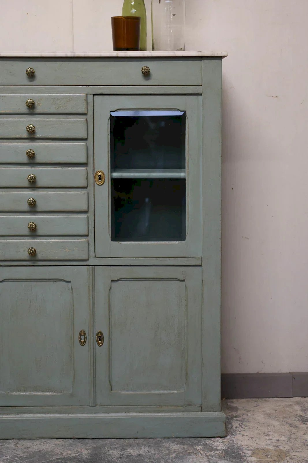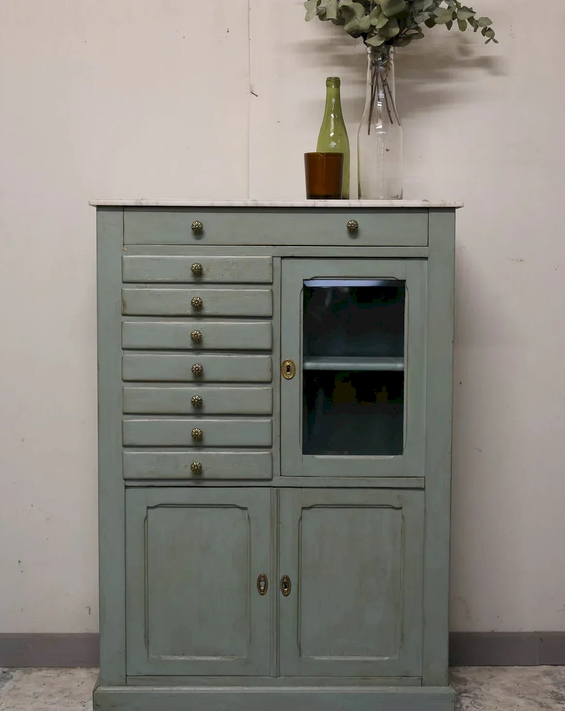 Adoptez ce charmant meuble de dentiste des années 1900 en bois peint vert, doté d’un plateau en marbre blanc et d’ornements en bronze et laiton d’origine. Sa composition soigneuse et ses proportions étroites offrent une solution de rangement idéale pour la salle de bain ou un atelier, avec petits tiroirs et tiroir supérieur qui glissent parfaitement. La porte vitrée et les vantaux bas ferment à clef, soulignant son esthétique fonctionnelle et cabinet d’époque. Meuble entièrement restauré ; la partie marbre présente des traces d'usage et un ancien recollage en son milieu. Longueur : 68 cm Largeur : 32 cm Hauteur : 97 cm Longueur petits tiroirs : 25 cm Profondeur petits tiroirs : 24 cm Hauteur petits tiroirs : 3 cm Longueur tiroir du haut : 53 cm Profondeur tiroir du haut : 24 cm Hauteur tiroir du haut : 5,5 cm État:Occasion: Objet ayant été utilisé. Objet présentant quelques marques d'usure superficielle, ...Occasion: Objet ayant été utilisé. Objet présentant quelques marques d'usure superficielle, entièrement opérationnel et fonctionnant correctement. Il peut s'agir d'un modèle de démonstration ou d'un objet retourné en magasin après une courte période d'utilisation. les éventuelles imperfections. Marque:Debongout Type:Produit chiné Matériau:Bois, Marbre, Verre Style:Campagne Personnalisé:Buffets