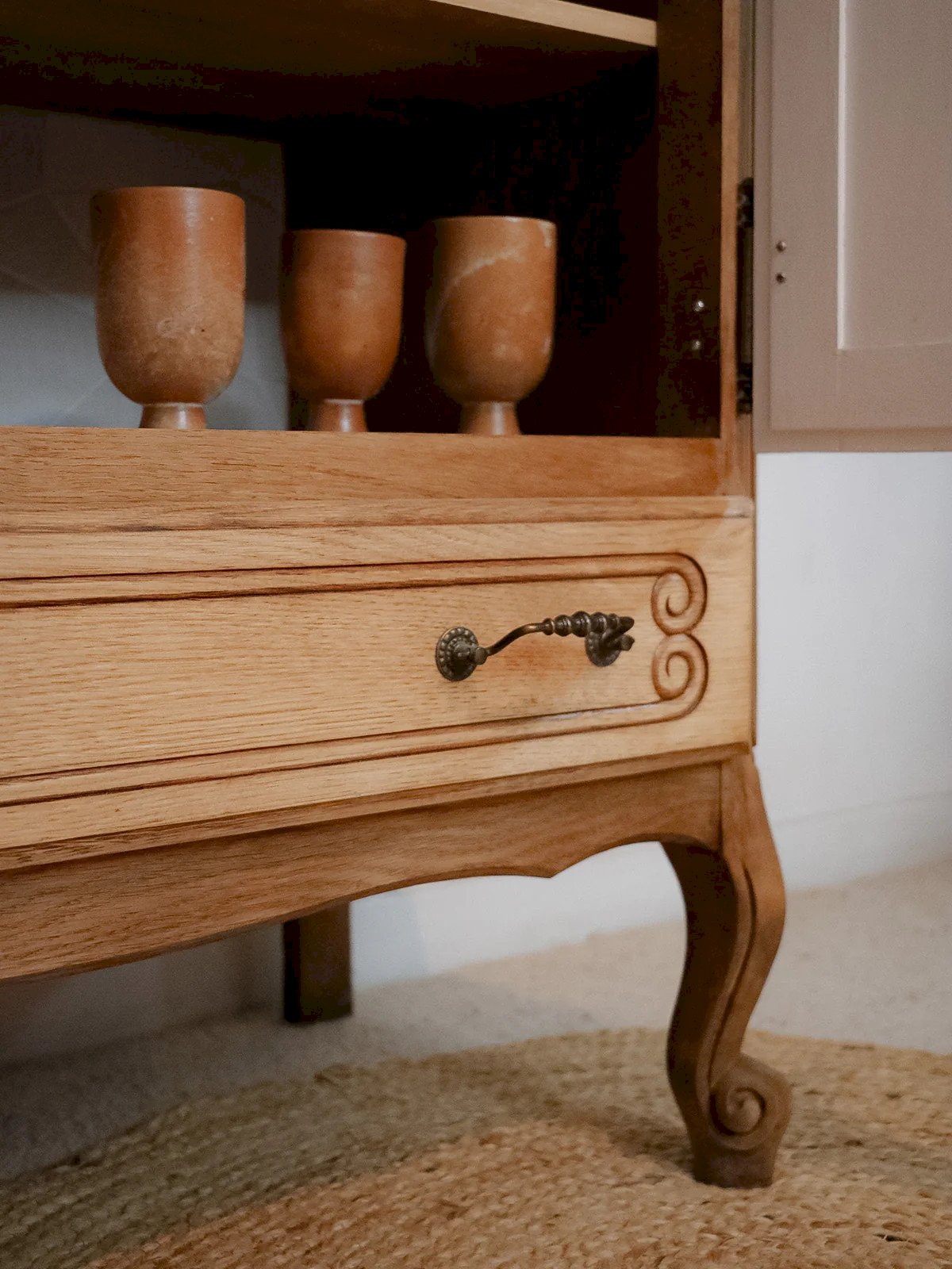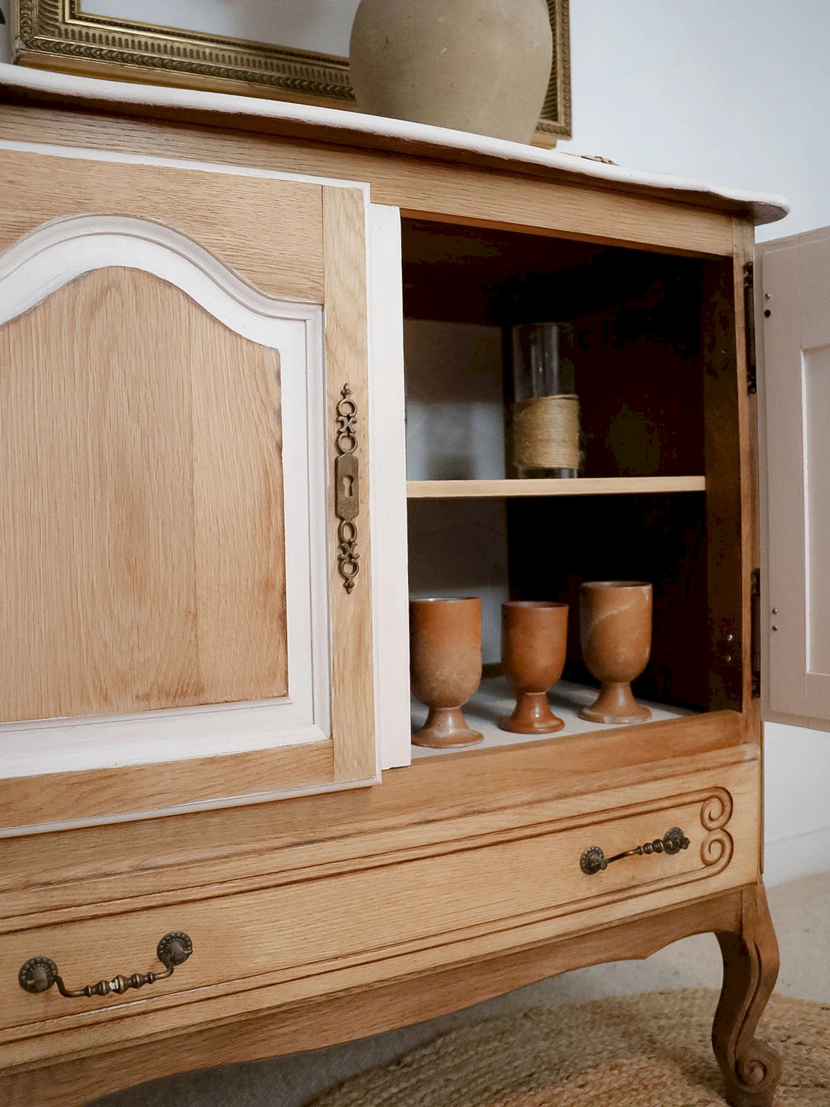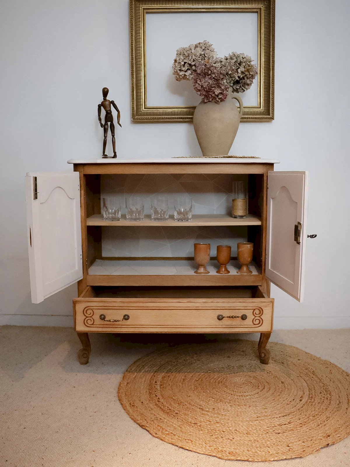 Apportez une touche vintage et lumineuse avec ce buffet des années 70/80 en chêne et plaquage, associé à une finition blanche et à de délicates moulures. Ses deux portes et son tiroir offrent un rangement modulable, idéal pour la vaisselle, le linge de table ou les objets du quotidien, et structureront un coin repas ou un salon. Le contraste du bois et du blanc installe une ambiance chaleureuse et élégante, subtilement rétro. Longueur : 83 cm Largeur : 43 cm Hauteur : 85,5 cm Hauteur tiroir : 12,5 cm Hauteur des étagères : 19 cm et 21,5 cm État:Occasion: Objet ayant été utilisé. Objet présentant quelques marques d'usure superficielle, ...Occasion: Objet ayant été utilisé. Objet présentant quelques marques d'usure superficielle, entièrement opérationnel et fonctionnant correctement. Il peut s'agir d'un modèle de démonstration ou d'un objet retourné en magasin après une courte période d'utilisation. les éventuelles imperfections. Marque:Debongout Type:Produit chiné Matériau:Chêne, Bois Style:Campagne Personnalisé:Buffets