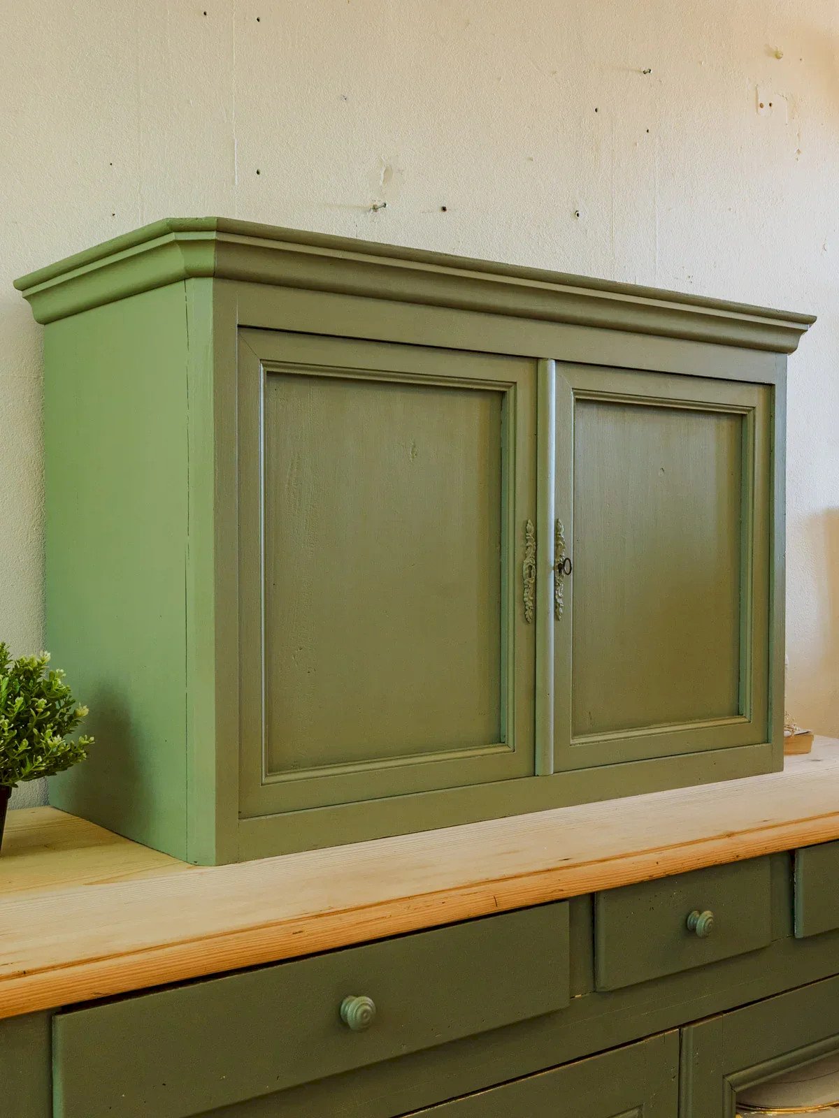 Apportez une touche d'élégance à votre intérieur avec ce dessus de meuble vintage en pin, soigneusement repeint en vert. Doté de deux portes et d'une étagère, il allie fonctionnalité et esthétique. Ses détails en bois sculpté ajoutent un charme intemporel, parfait pour sublimer votre décoration. Idéal à poser dans un salon ou une chambre, ce meuble apportera une note de caractère à votre espace. Longueur : 97 cm Largeur : 41 cm Hauteur : 61 cm État:Occasion: Objet ayant été utilisé. Objet présentant quelques marques d'usure superficielle, ...Occasion: Objet ayant été utilisé. Objet présentant quelques marques d'usure superficielle, entièrement opérationnel et fonctionnant correctement. Il peut s'agir d'un modèle de démonstration ou d'un objet retourné en magasin après une courte période d'utilisation. les éventuelles imperfections. Marque:Debongout Type:Produit chiné Matériau:Pin Style:Campagne Personnalisé:Buffets