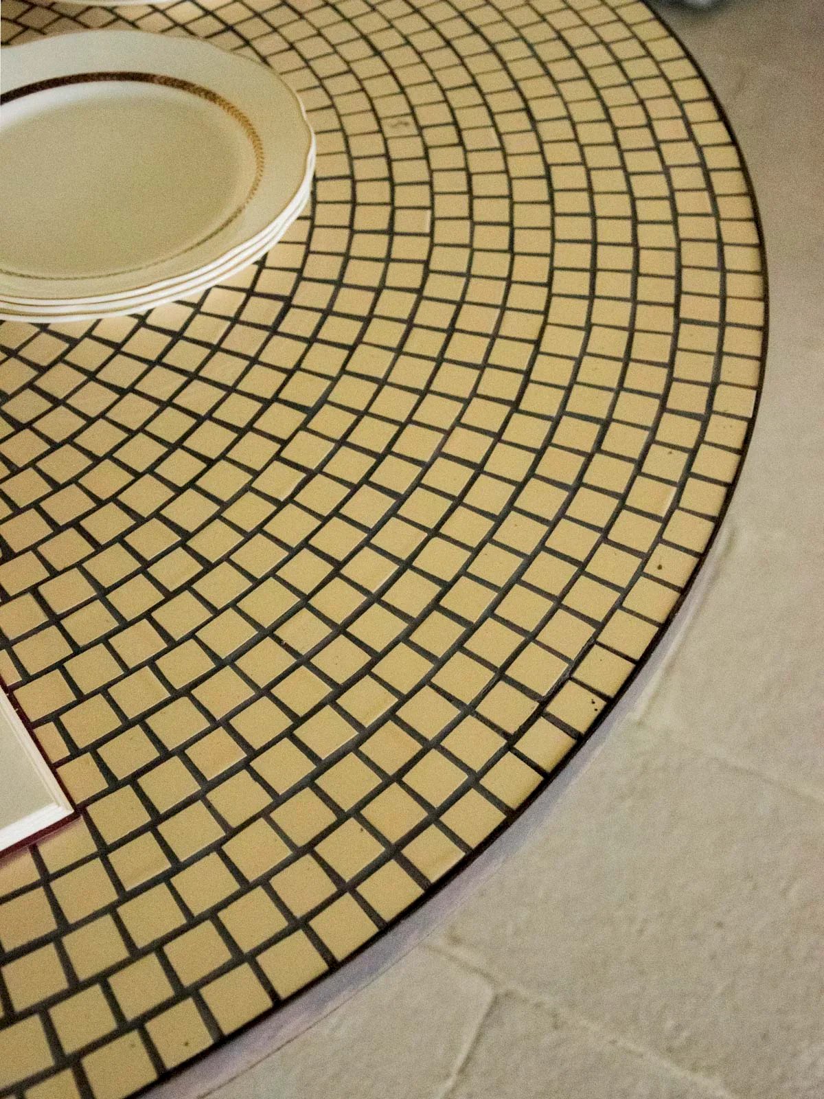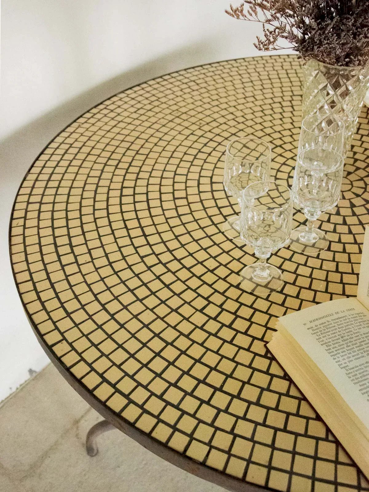 Invitez la convivialité dans votre jardin avec cette table pour six personnes, coiffée d'un plateau en mosaïque qui apporte une note graphique et colorée. Les pieds en métal assurent une assise stable et moderne, idéale pour les repas en extérieur, apéritifs et soirées d'été entre amis. Son allure artisanale s'intègre aussi bien sur une terrasse qu'au bord d'une piscine, créant une atmosphère chaleureuse et élégante propice aux moments partagés. Hauteur : 75,5 cm Hauteur sous plateau : 65 cm Diamètre : 110 cm État:Occasion: Objet ayant été utilisé. Objet présentant quelques marques d'usure superficielle, ...Occasion: Objet ayant été utilisé. Objet présentant quelques marques d'usure superficielle, entièrement opérationnel et fonctionnant correctement. Il peut s'agir d'un modèle de démonstration ou d'un objet retourné en magasin après une courte période d'utilisation. les éventuelles imperfections. Couleur:Multicouleur Hauteur:Métal, Céramique, Mosaïque Largeur:Chaises Marque:Debongout Type:Produit chiné Matériau:Métal, Céramique, Mosaïque Style:Contemporain