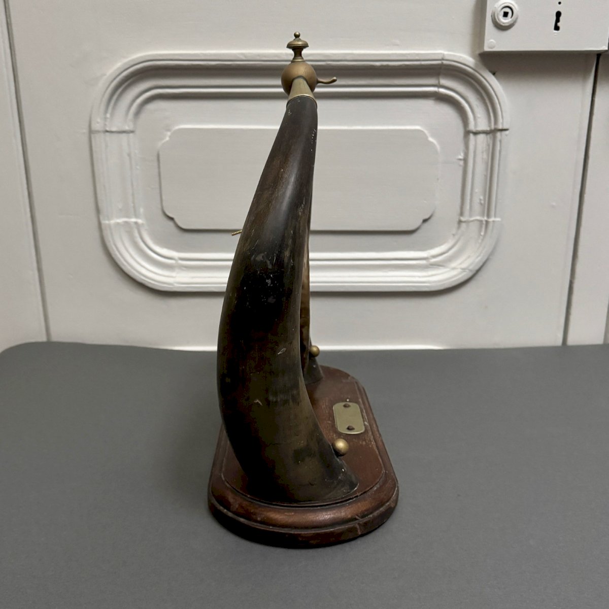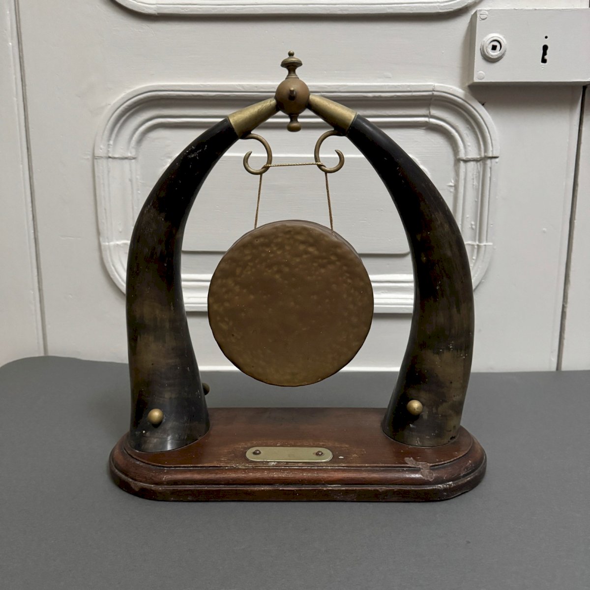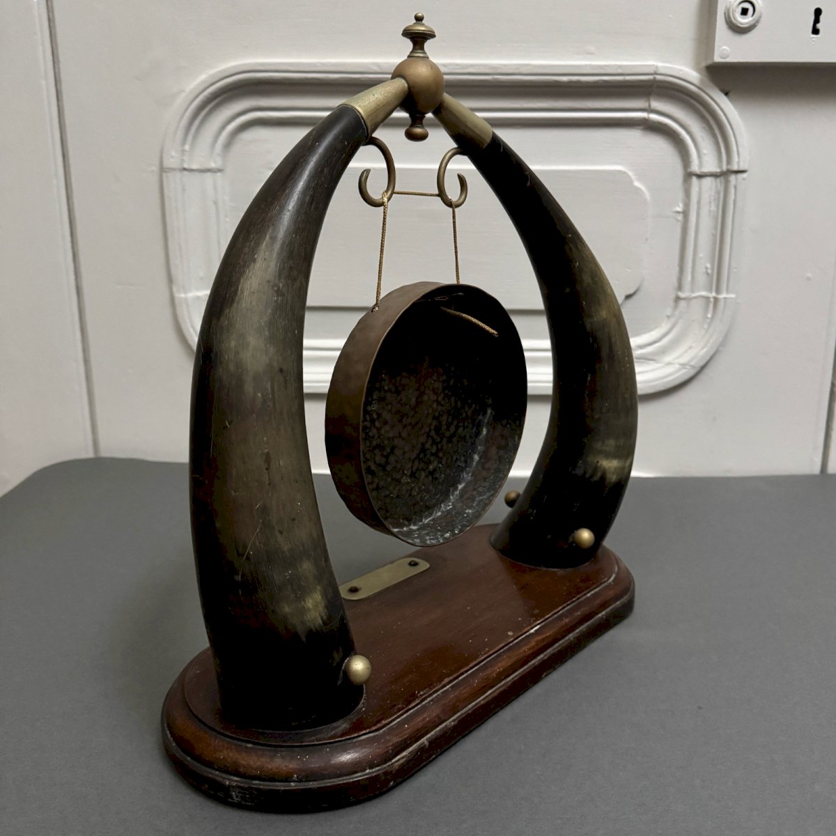 Gong de table anglais en métal et cuivre XIXe M3944 Ce gong de table est un travail du XIXe, de belle facture. Il est composé de deux cornes. Pour l'état, notons des traces d'usure et de frottements. Le tout reste cependant dans un état général tout à fait convenable. Nos photos vous permettent d'apprécier la qualité de l'objet. Merci de bien détailler les photos. N'hésitez pas à zoomer . Les photos font partie intégrante de la description. Dimensions : Hauteur : 36 cm Largeur : 33,8 cm Profondeur : 15,2 cm - Gong Diamètre : 14,8 cm P :  1681387   Je reste à votre disposition pour toute question. Type:Art de la table, Cuisine Origine:Angleterre Pays d'origine:Royaume-Uni Sous-type:Gong de table Hauteur:36 cm Matière:Cuivre Longueur:cm Largeur:33,8 cm