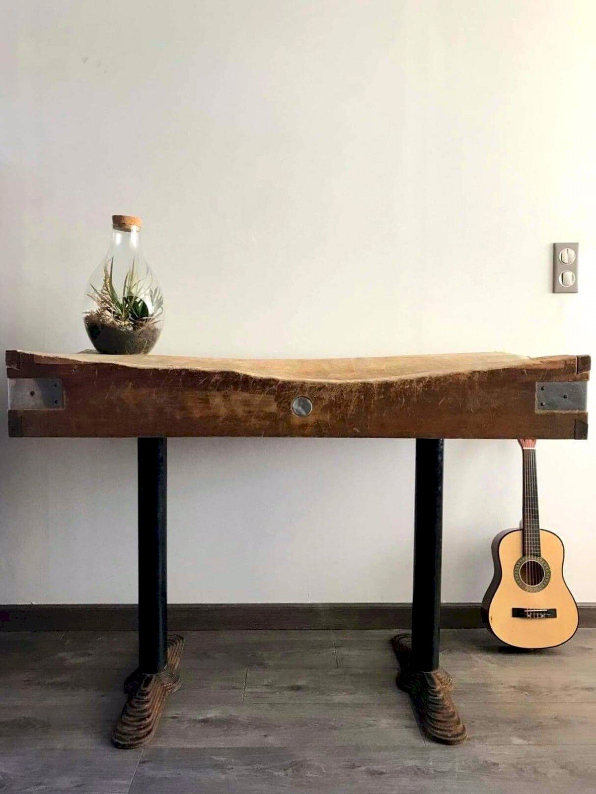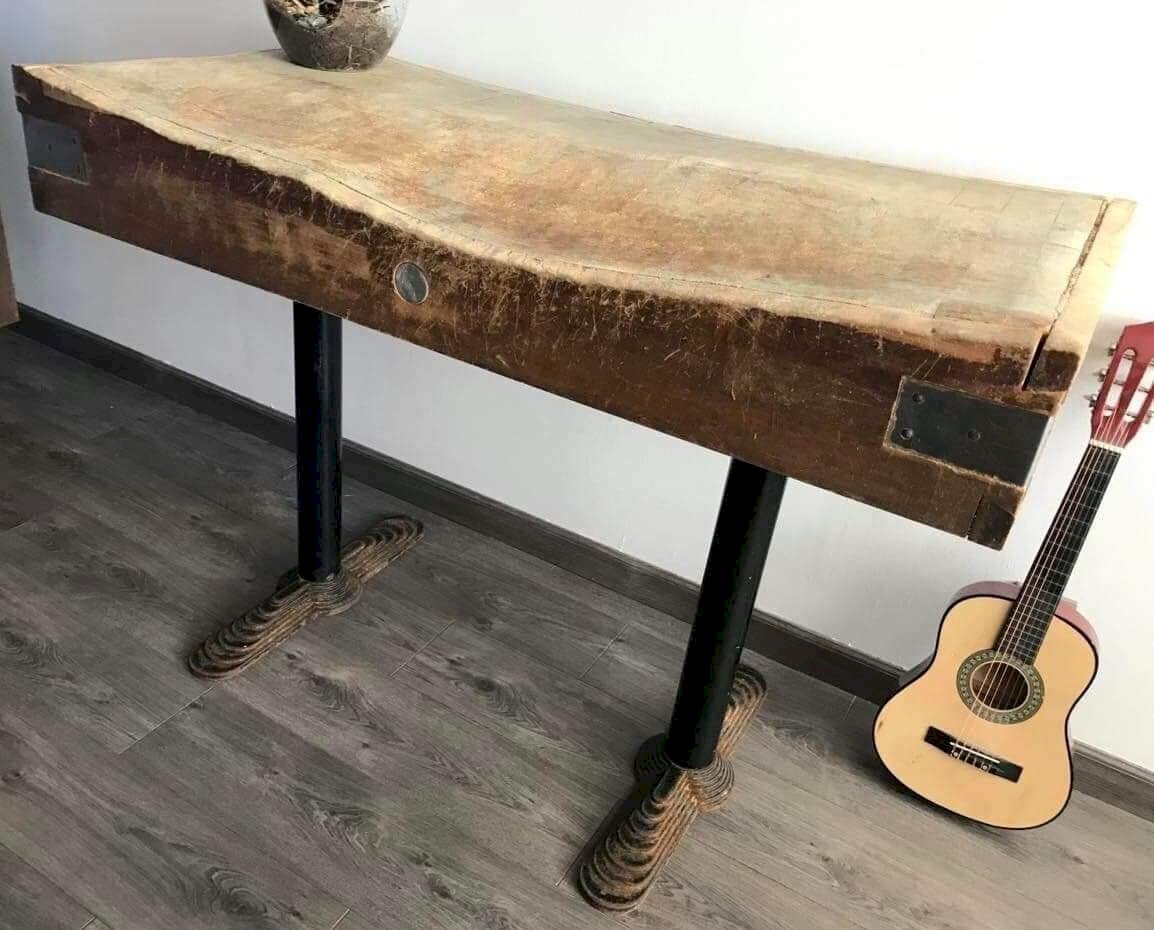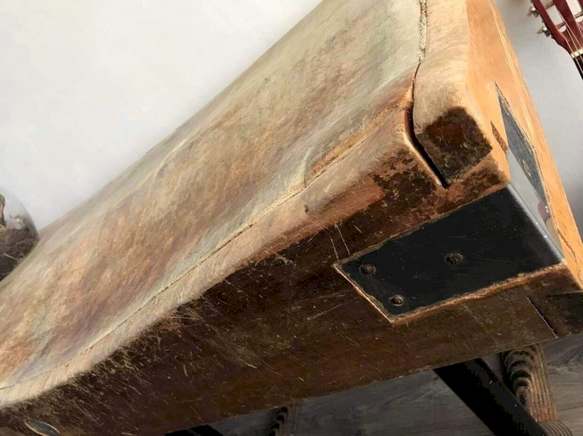 Grand Billot De Boucher, Meuble De Metier Ancien. Dans son jus, inimitable patine du temps et heures de travail : craquelé, creusé, coloré, etc. Mais bon état général et magnifique rendu. Possibilité de fixer les pieds (dans leur jus également, traces d’oxydation et d’usage) en fonte pour qui le souhaite (par vos soins): le billot n’est pas fixé dessus. Dimensions 131x60,5xh90cm, épaisseur au plus large 18cm. Très très lourd. À recycler en comptoir, îlot de cuisine, bureau ou meuble vasque. Meuble de métier authentique! Livraison possible par transporteur (ex 80€ vers Paris et région parisienne). Prévoir de l’aider car la plupart des livreurs sont seuls. Les délais de livraison de 3 à 5 jours sont imposés par et sont donc donnés à titre purement indicatif.