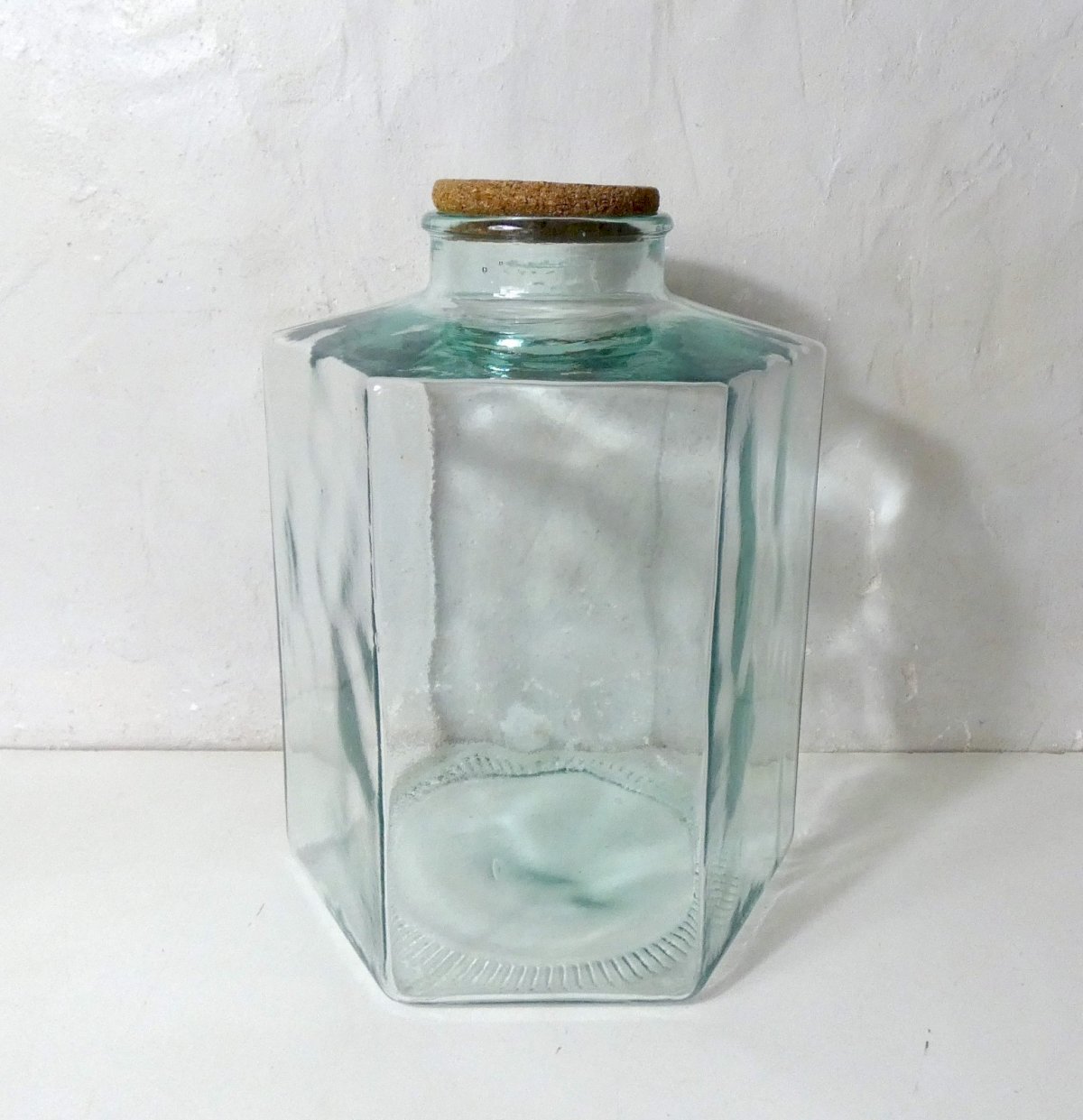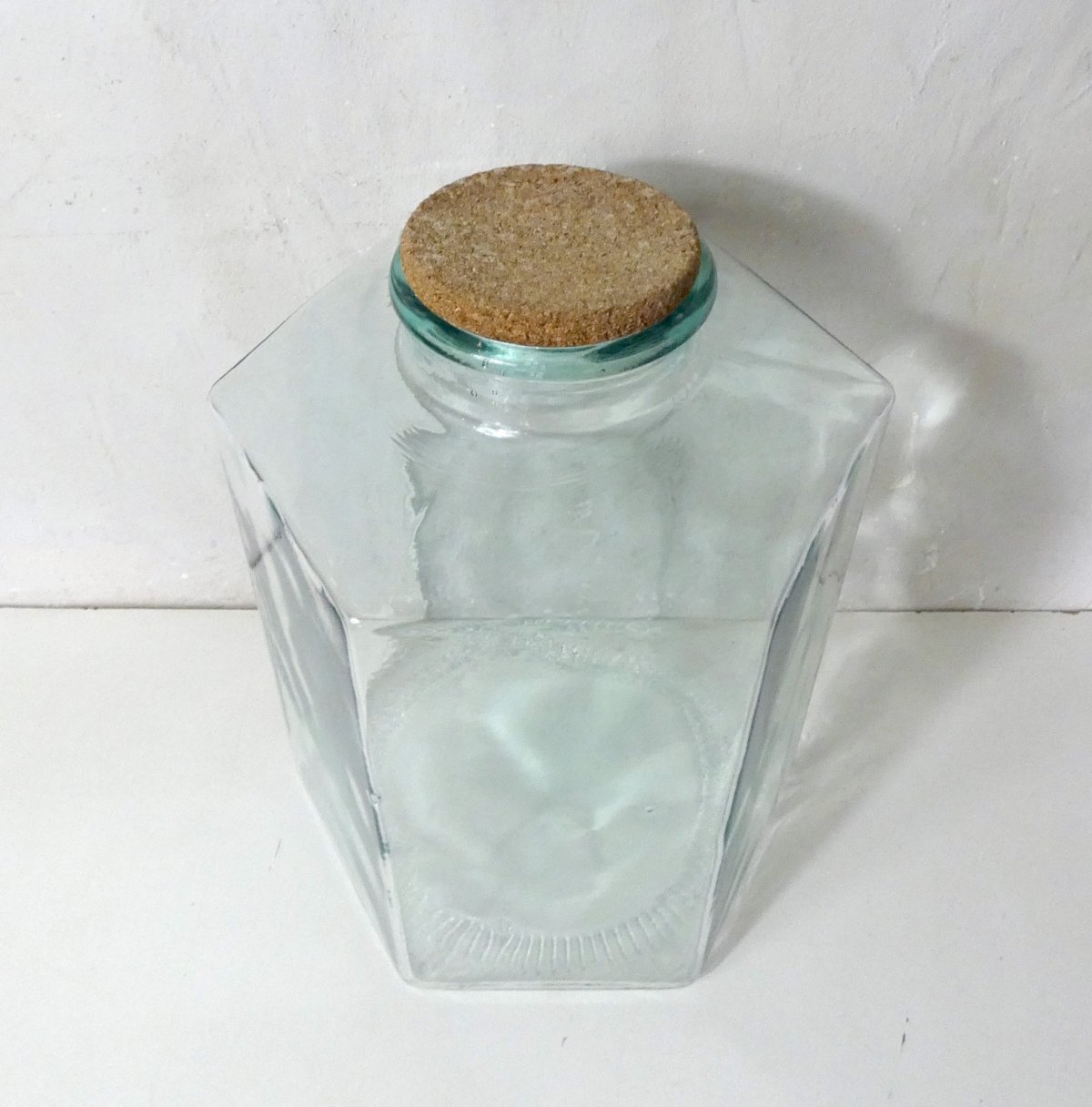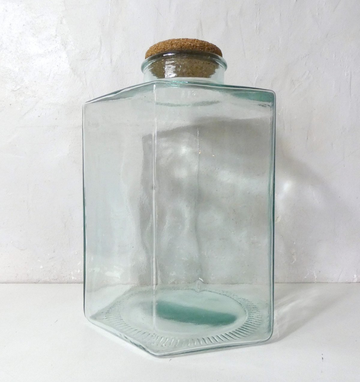Ancien grand bocal en verre, avec couvercle en liège. Hauteur: 42 cm. Diamètre: 31,5 cm. Diamètre de l'ouverture: 12 cm. Rare grand format pour conserver les aliments secs, les plantes séchées, ou en déco pour faire de magnifiques bouquets champêtres. Il peut aussi servir de terrarium avec des plantes succulentes, des cactées, ou avec des lichens, des mousses et une guirlande lumineuse dedans, pour les périodes de fêtes hivernales. En très bon état.