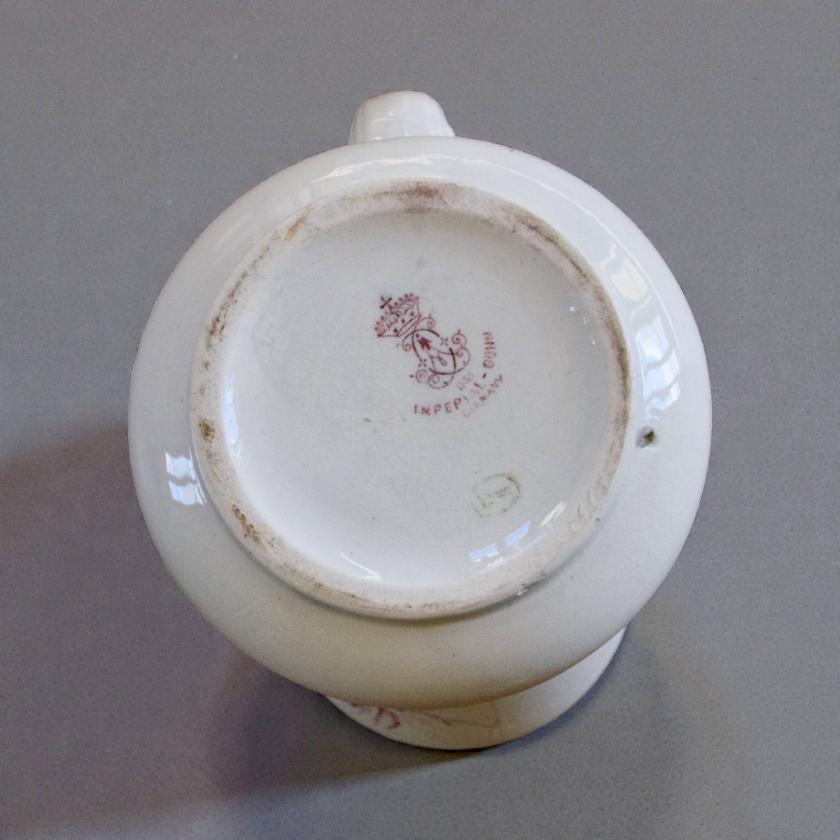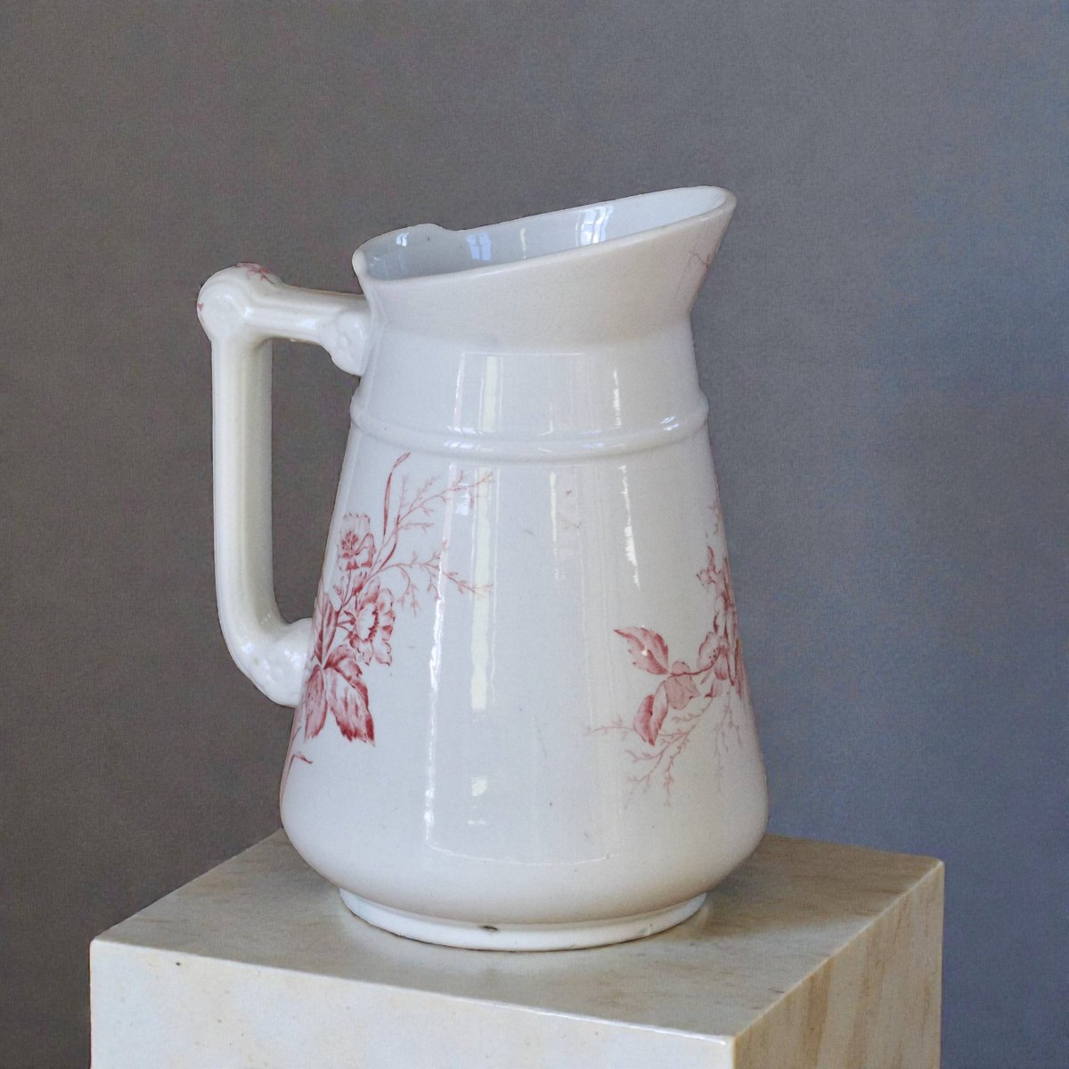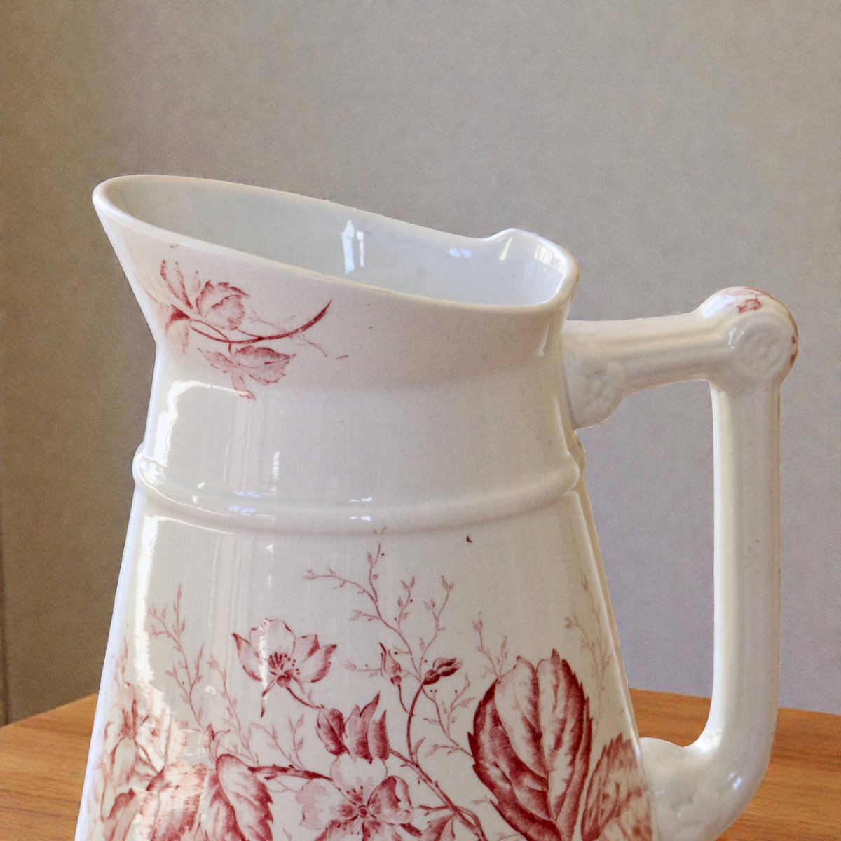 Grand broc de toilette ancien datant du XIXe siècle, terre de fer rose, de la faïencerie Imperial Bonn (Allemagne).Faïencerie fondée en 1755.Joli décor végétal tout en finesse dans de douces nuances de rose / rouge.À détourer en joli vase pour vos plus belles fleurs, par exemple.Il est en bon état, pas d’ébréchure, quelques traces d’usage conformes à son âge et un fil au bec.