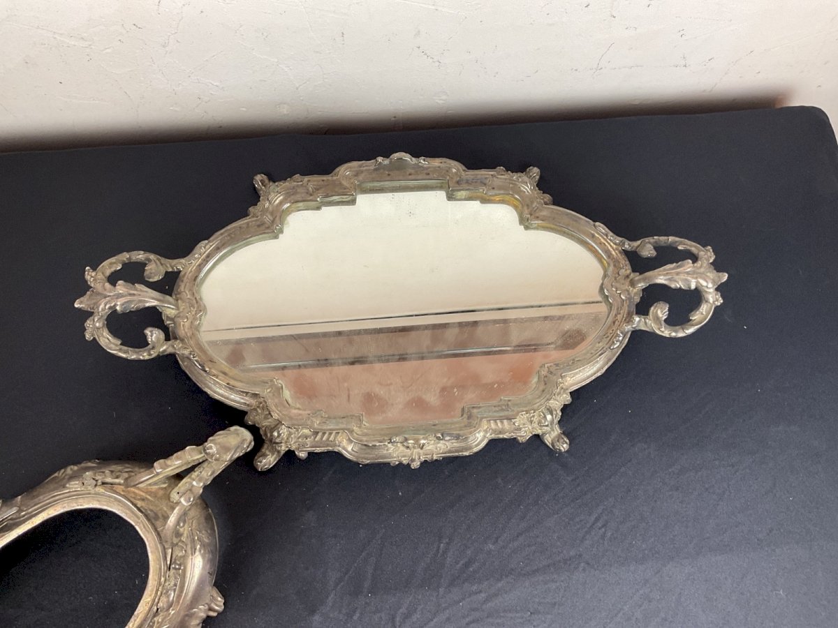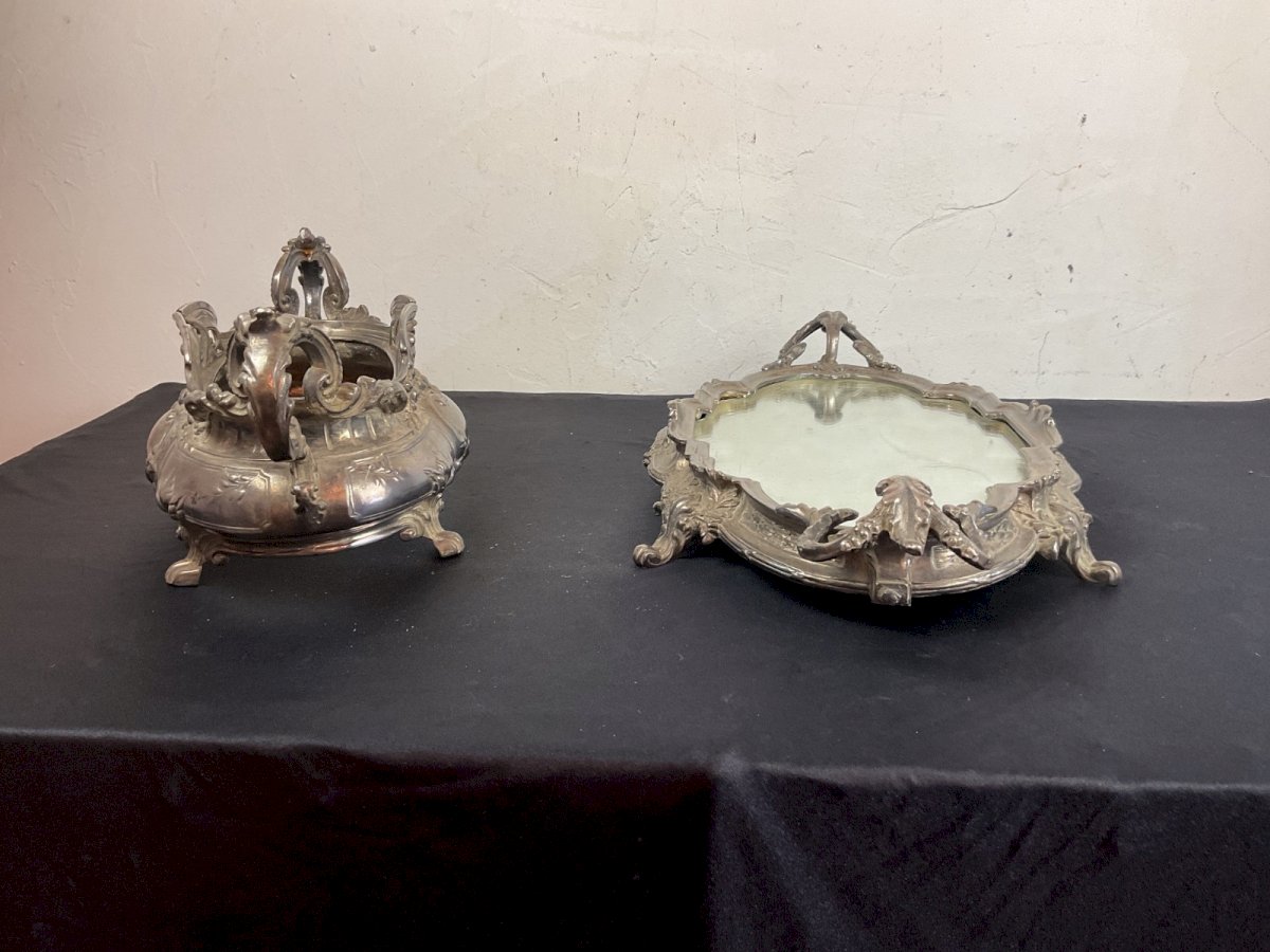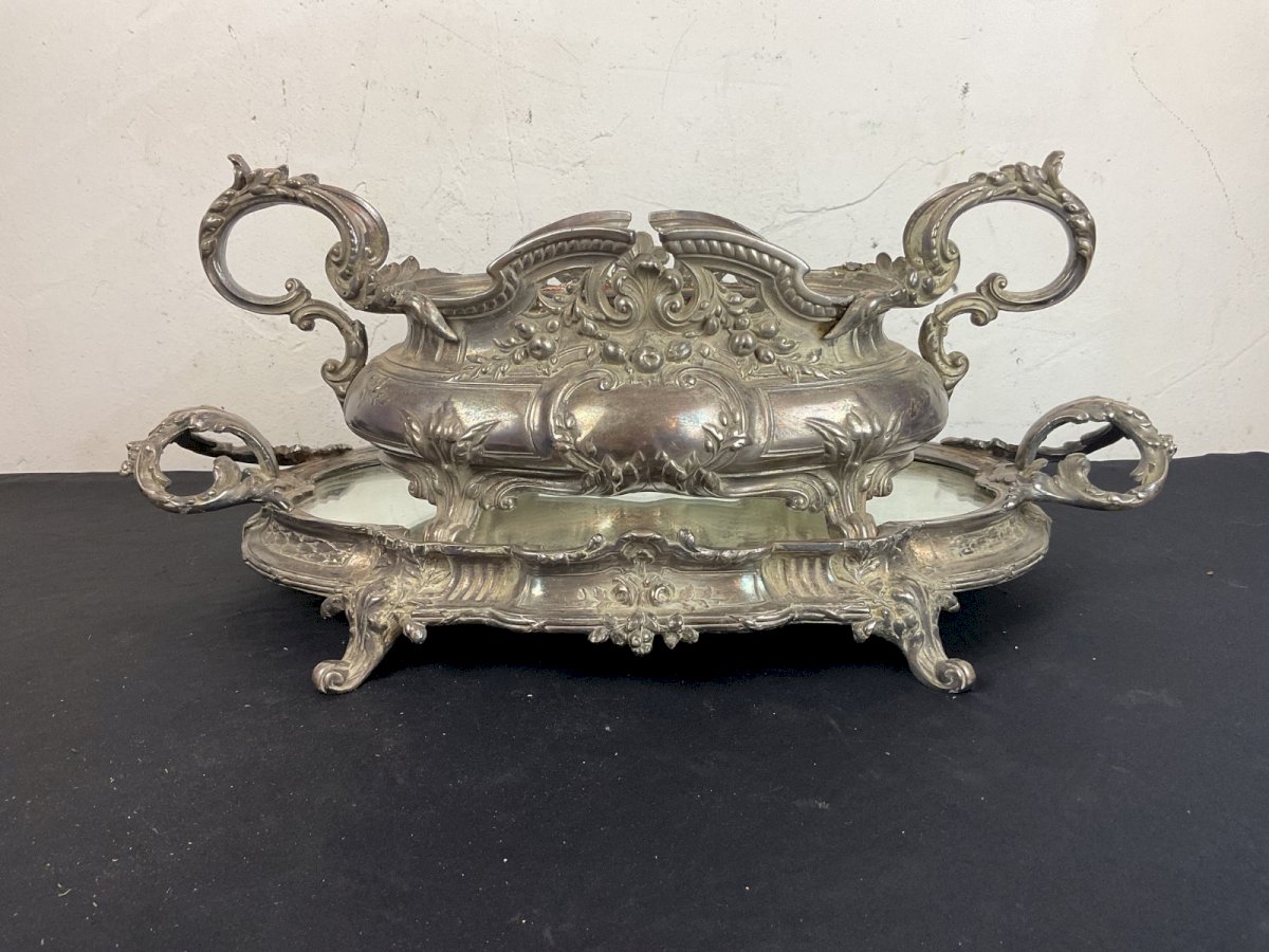 Grand centre de table surtout avec sa jardinière style Louis XVI ROCAILLE Bronze argenté  Manque le centre de la jardinerie  Dimension du surtout 49 x 25 cm Dimension de la jardinière 38 x 18 cm Hauteur total 19,5 cm Dimension pour le récipient manquant Max 21 x 11 cm Couleur:Argenté Type:Coupelle, Vide-poche Matière:Métal