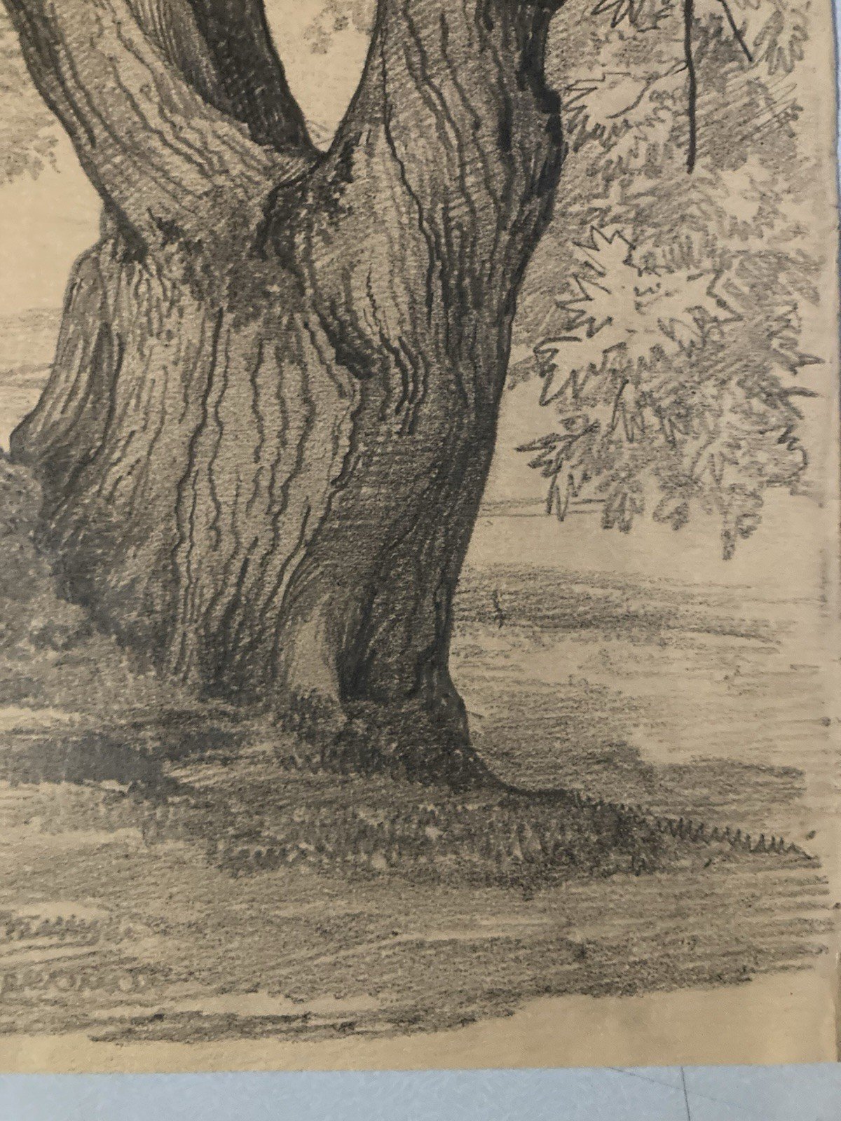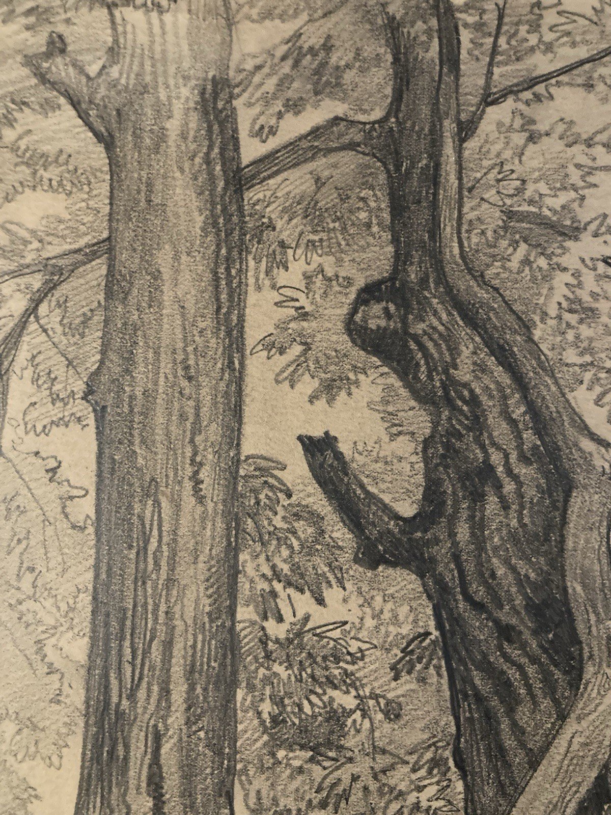 Grand Dessin XIXe 1888 crayon Feuille Branche Romantisme Arbre Ancien Tronc Art