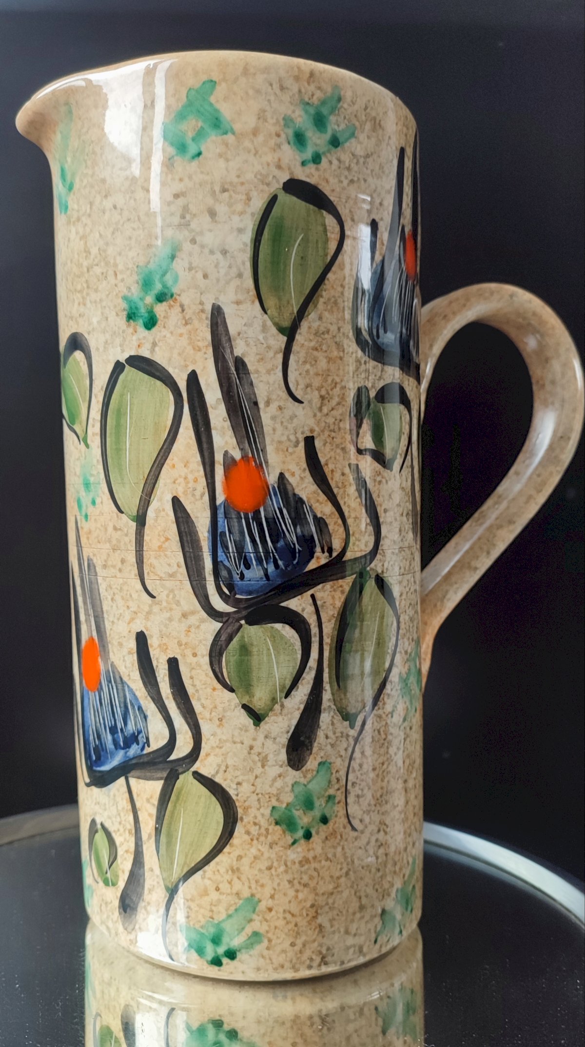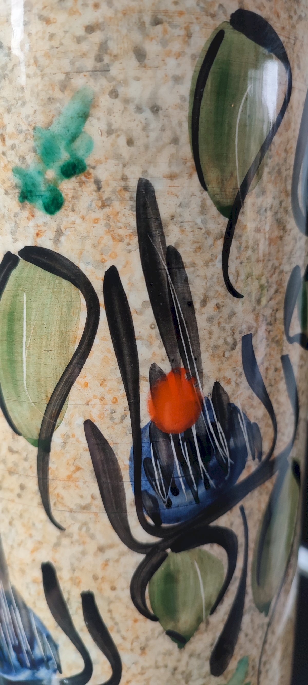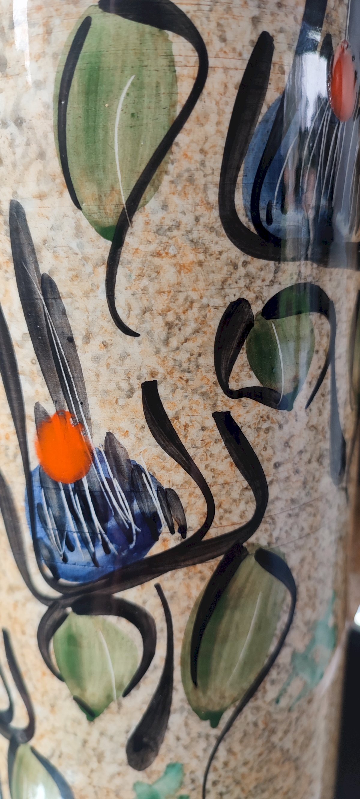 Pièce entièrement façonnée et décorée à la main, motif floral stylisé bleu, orange et vert sur fond moucheté typiques des années 60.