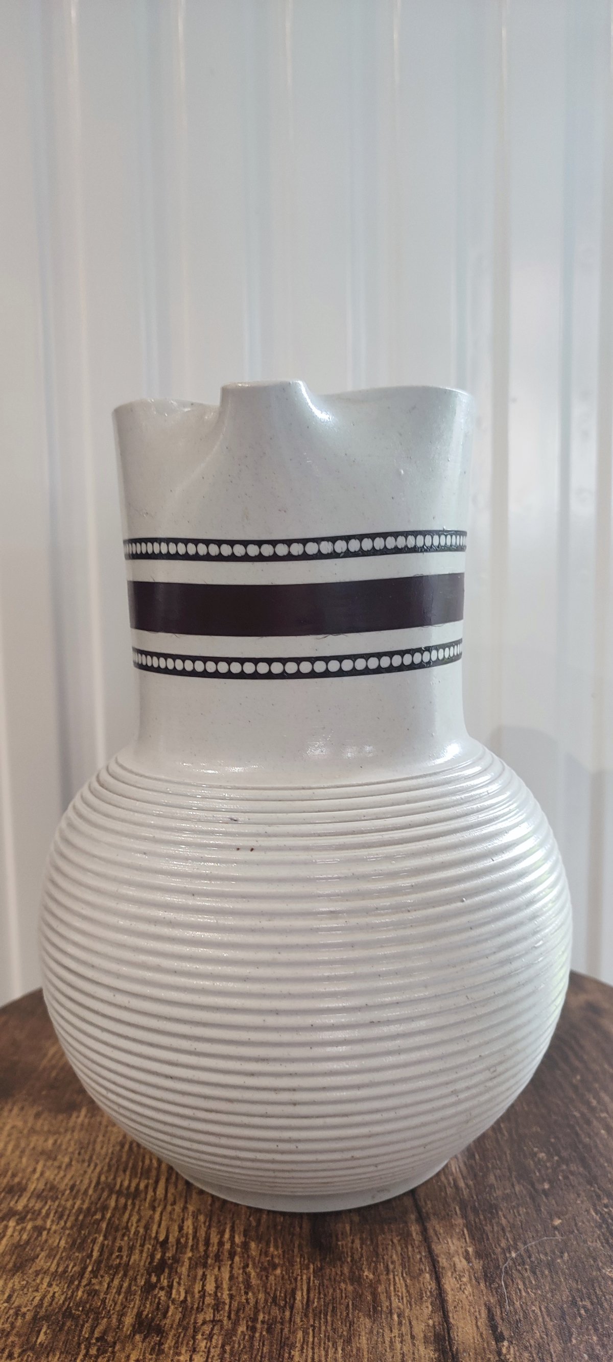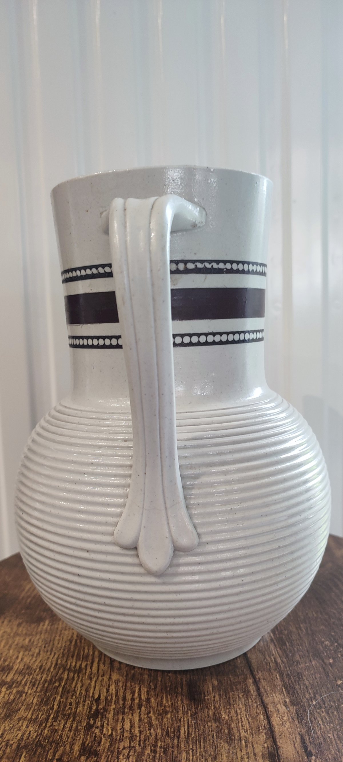Grand pichet en grès vernissé à décor moulé de fines côtes horizontales et de bandes émaillées chocolat , ponctuées de pois blancs . Tons blanc craie et chocolat .