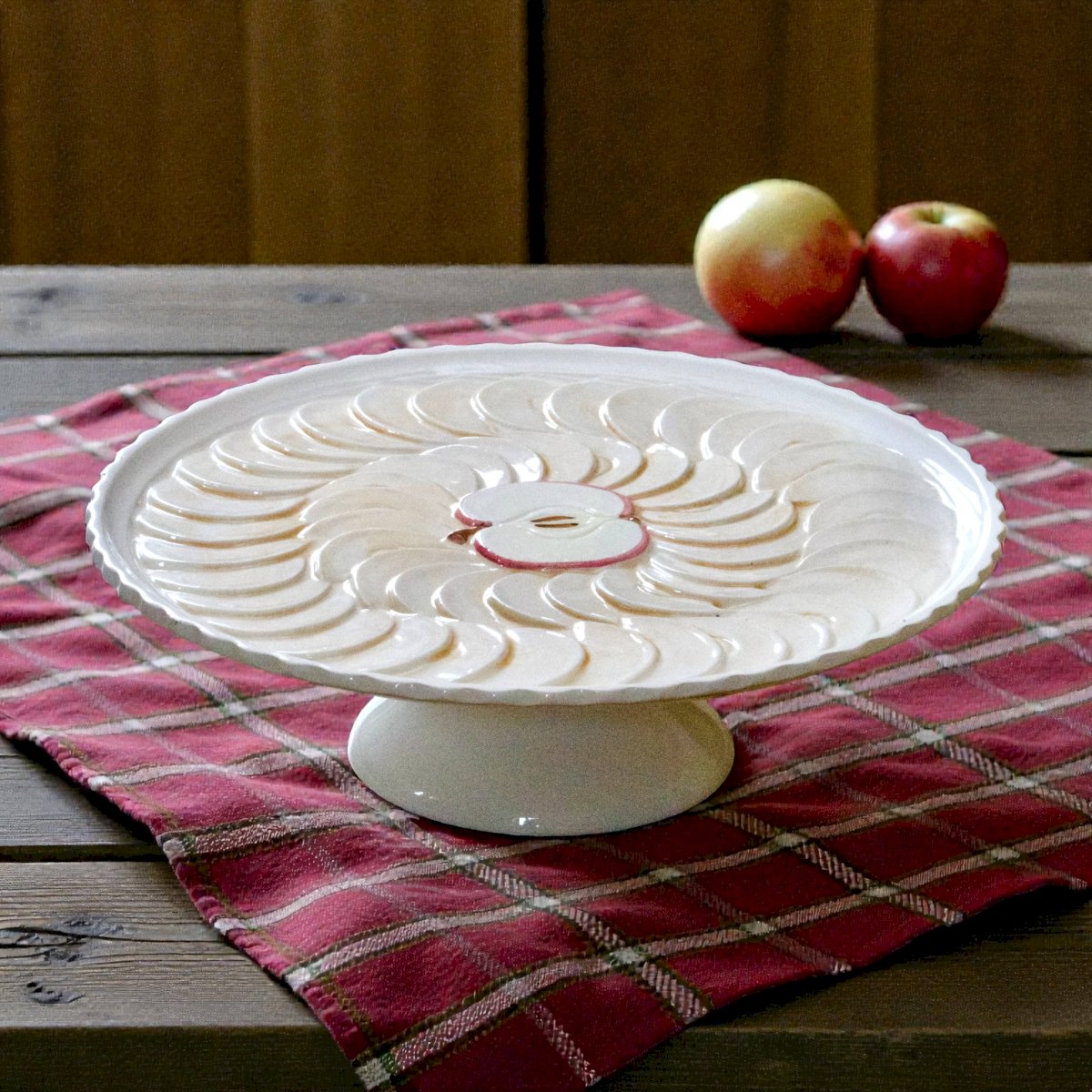 Grand plat à tarte vintage sur piédouche en barbotine tarte aux pommes