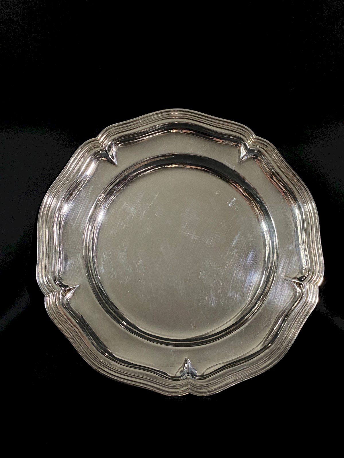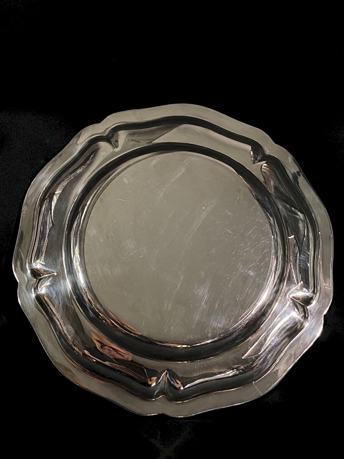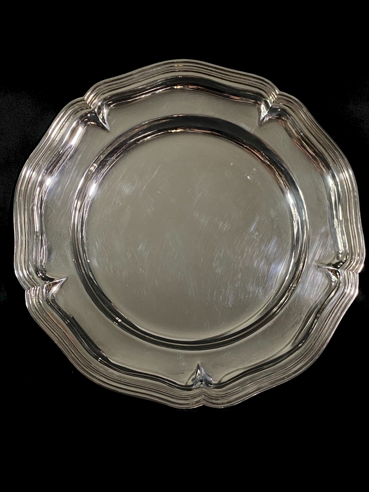 Grand plat rond en métal argenté signé Apollo modèle filet style Louis XV