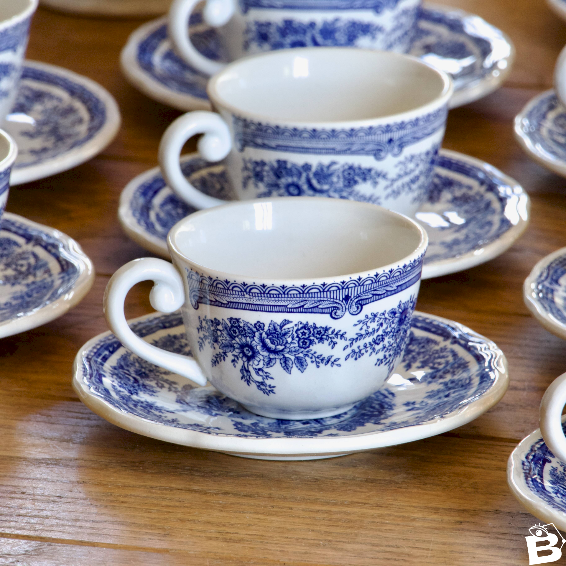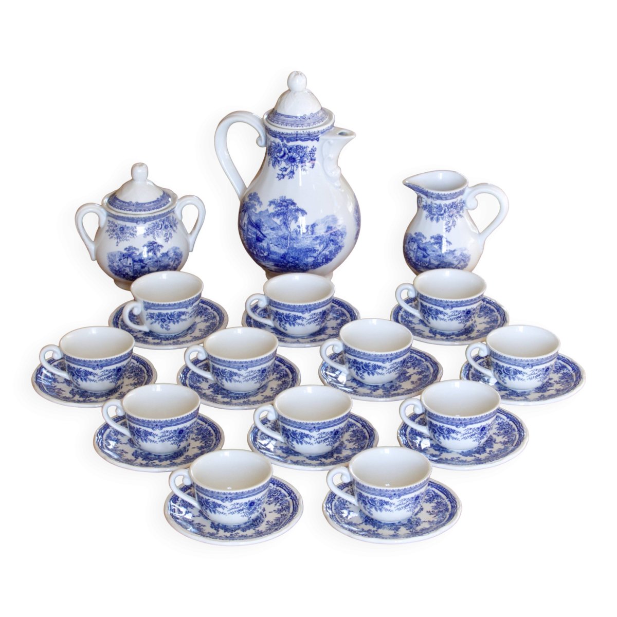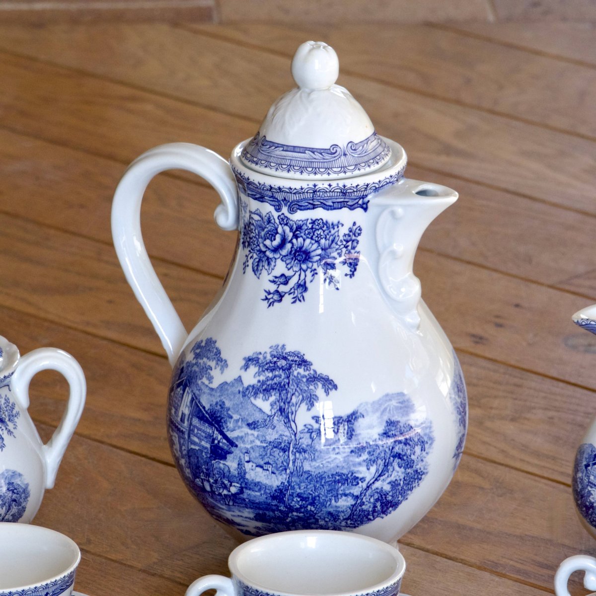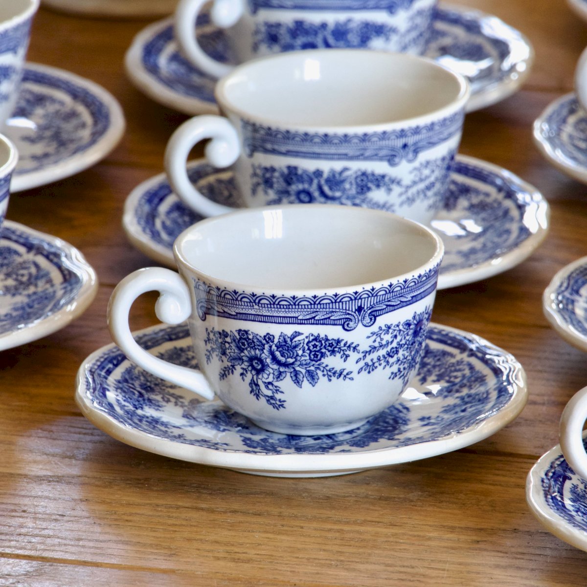 Magnifique et grand service à café / thé ancien en faïence de Luneville collection “English Style”.Service composé de 12 tasses, 12 sous-tasses, 1 grande cafetière, 1 grand sucrier et 1 pot-à-lait / crémier.Joli et riche décor champêtre bleu profond.Marli en frise néoclassique et rebord végétal aux fleurs élégantes.En très bon état, belle brillance, aucun fêle.Une tasse a une mini égrenure visible en dernière photo, ainsi que le bout du bec de la cafetière.Nous disposons du service complet (assiettes plates, creuses, à dessert, et différents grands plats), voir nos autres annonces ou nous écrire si intéressé par un lot.À noter que seules les assiettes à dessert sont estampillées, sûrement un oubli du fabricant.? Tasse: 8 X 5 cm.Cafetière: 26 X 19 cm.Sucrier: 15 X 15 cm.Pot à lait: 13, 5 X 9 cm.✨ Envoi très soigné.✨ Nous avons d'autres annonces en ligne, n'hésitez pas à jeter un coup d'oeil !10/25.