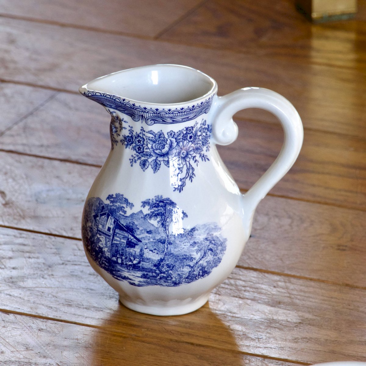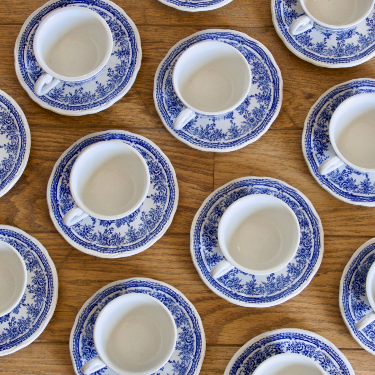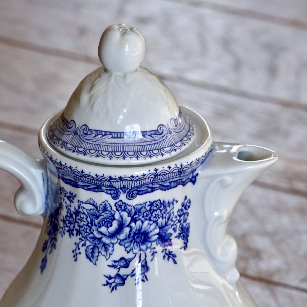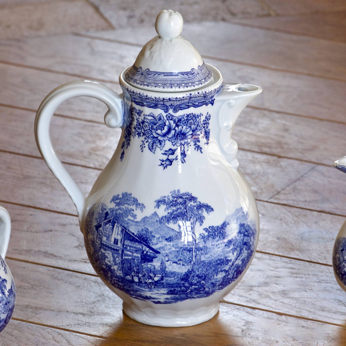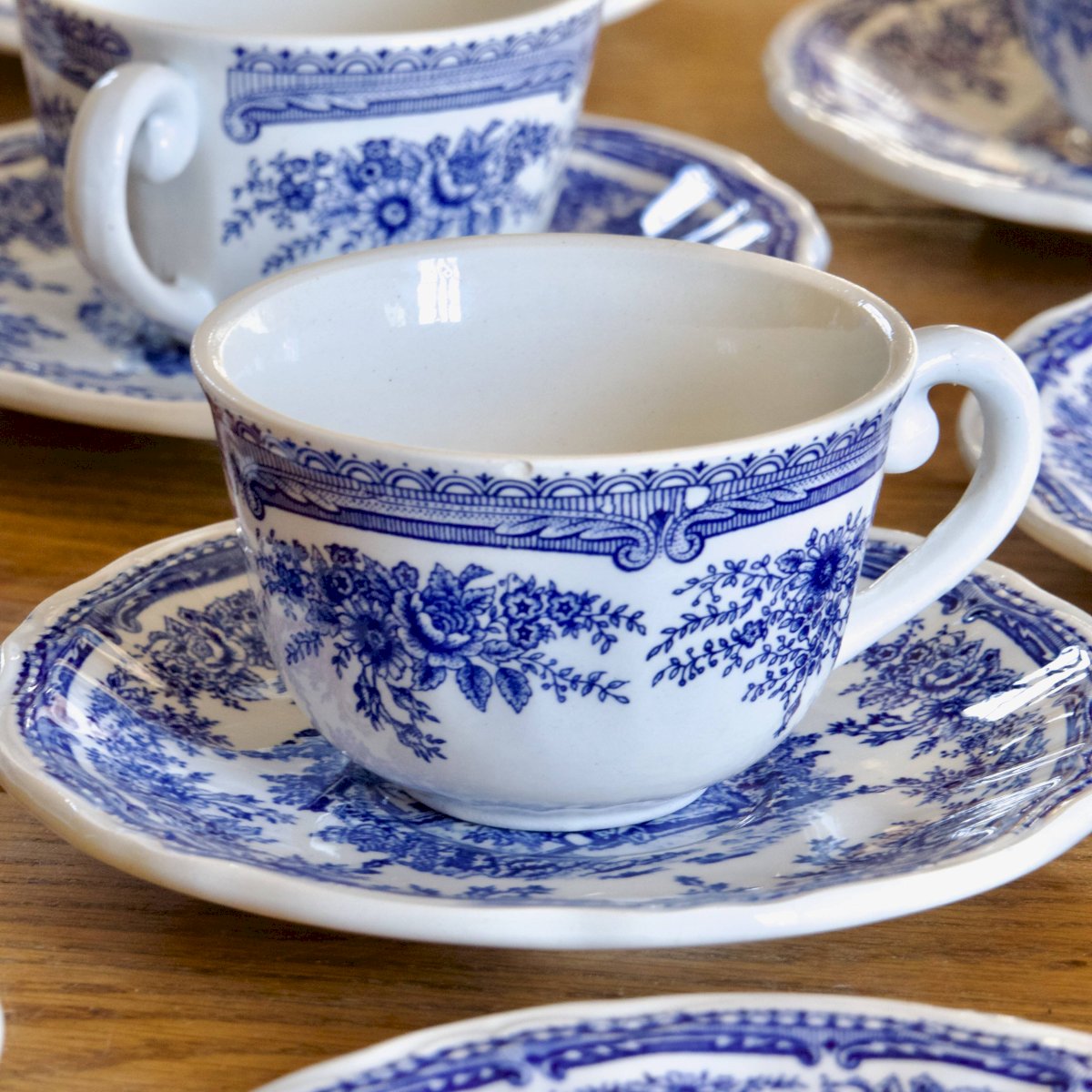 Magnifique et grand service à café / thé ancien en faïence de Luneville collection “English Style”.Service composé de 12 tasses, 12 sous-tasses, 1 grande cafetière, 1 grand sucrier et 1 pot-à-lait / crémier.Joli et riche décor champêtre bleu profond.Marli en frise néoclassique et rebord végétal aux fleurs élégantes.En très bon état, belle brillance, aucun fêle.Une tasse a une mini égrenure visible en dernière photo, ainsi que le bout du bec de la cafetière.Nous disposons du service complet (assiettes plates, creuses, à dessert, et différents grands plats), voir nos autres annonces ou nous écrire si intéressé par un lot.À noter que seules les assiettes à dessert sont estampillées, sûrement un oubli du fabricant.? Tasse: 8 X 5 cm.Cafetière: 26 X 19 cm.Sucrier: 15 X 15 cm.Pot à lait: 13, 5 X 9 cm.✨ Envoi très soigné.✨ Nous avons d'autres annonces en ligne, n'hésitez pas à jeter un coup d'oeil !10/25.