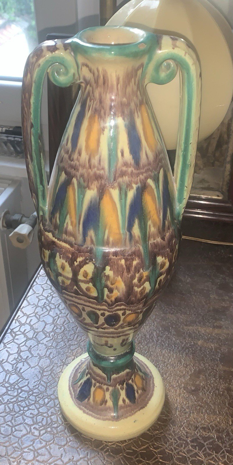 Grand vase en céramique Nabeul Tunisie Période art déco Atelier à déterminer Très bel état Un petit manque d'émail à l'ouverture Hauteur:35,5cm Diamètre maxi:12,5cm Diamètre à l'ouverture:5cm Pays de fabrication:Tunisie