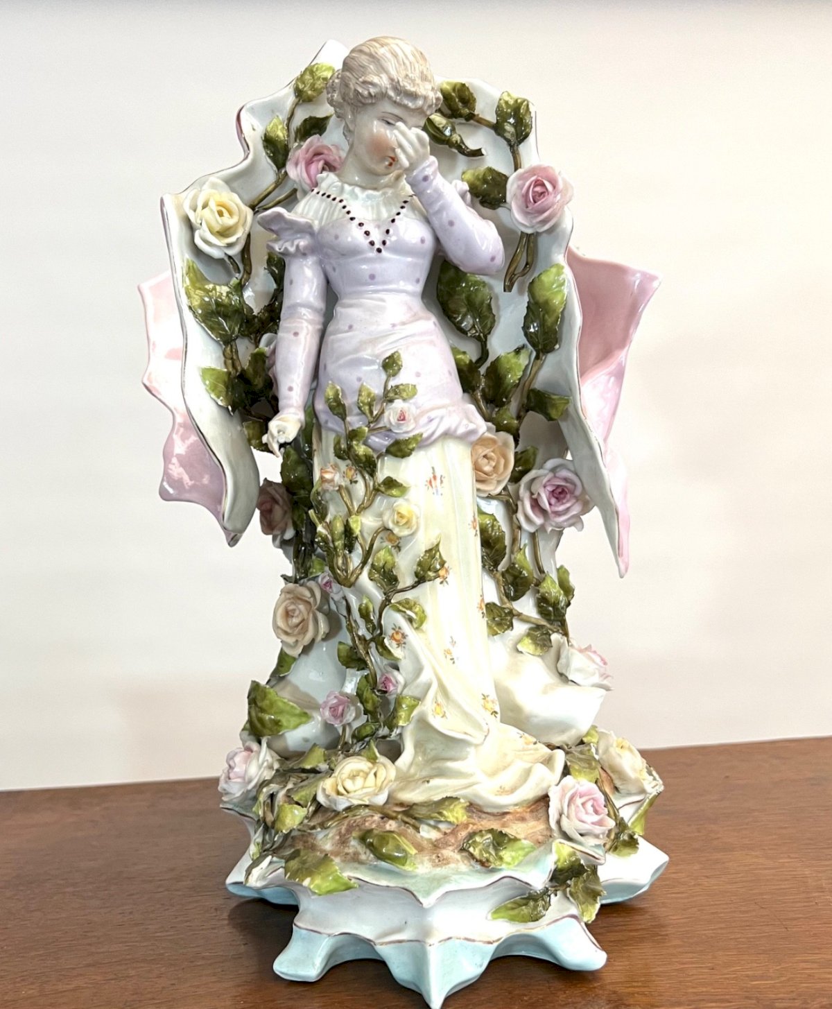 Grand Vase Art Nouveau Allemand Femme Roses Porcelaine vers 1900