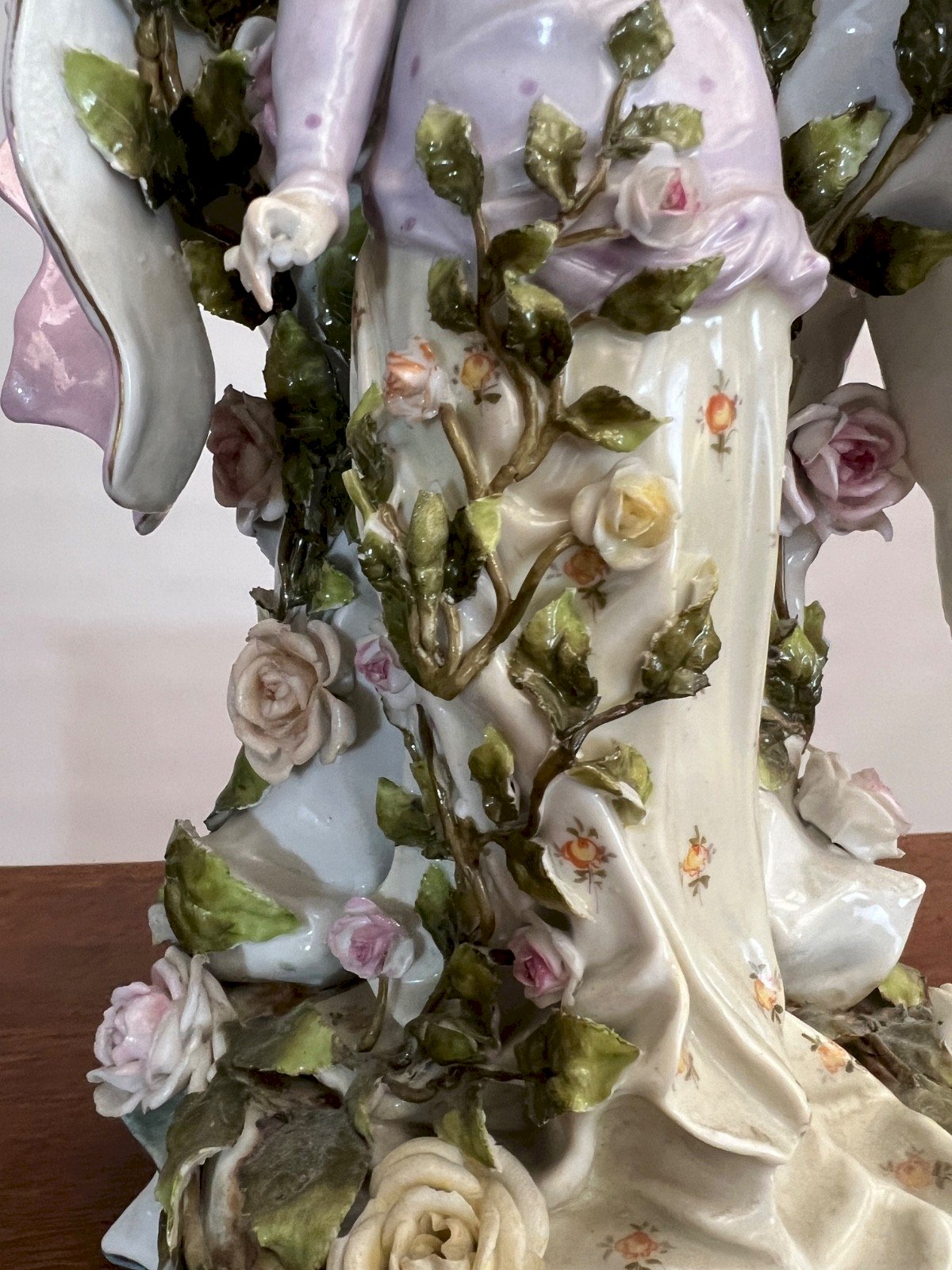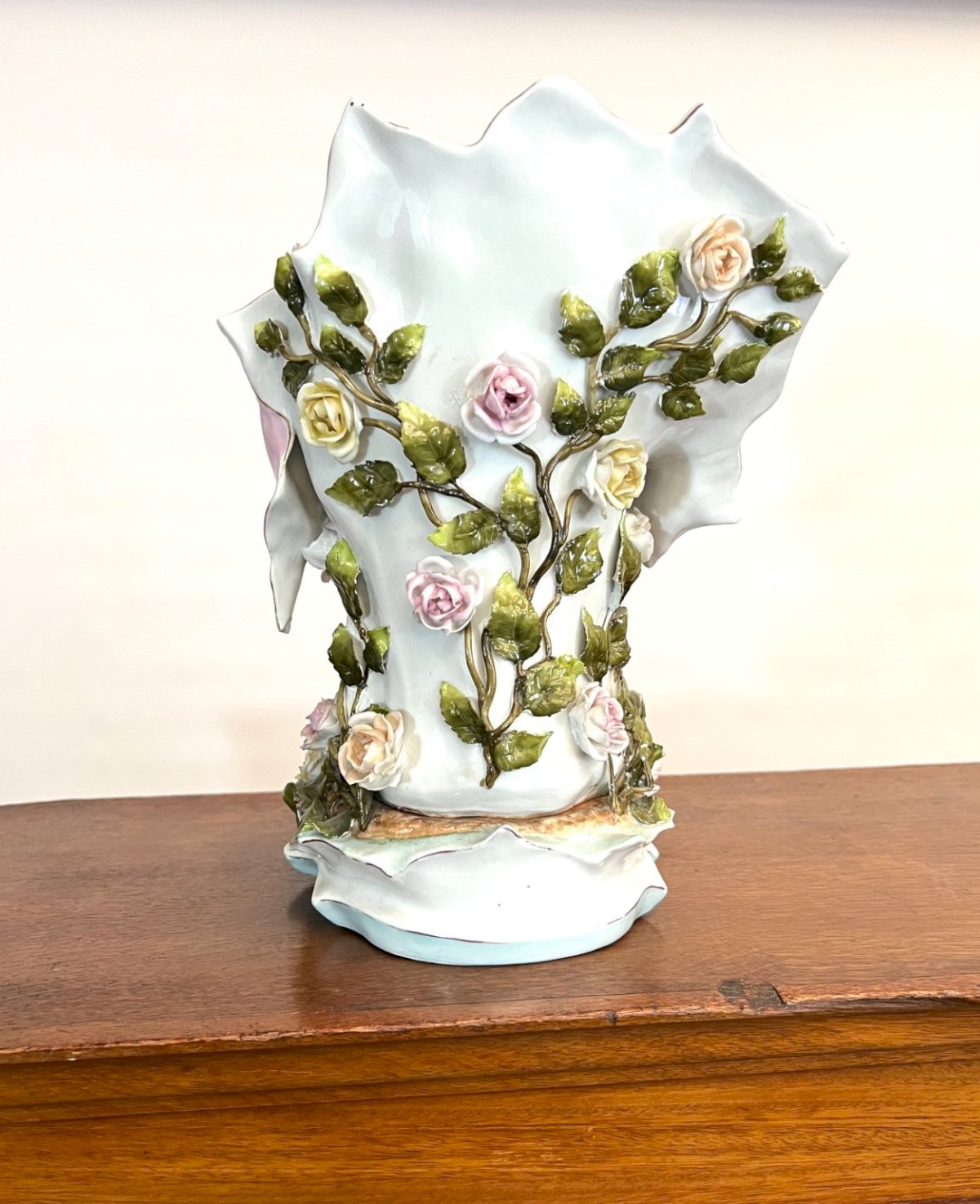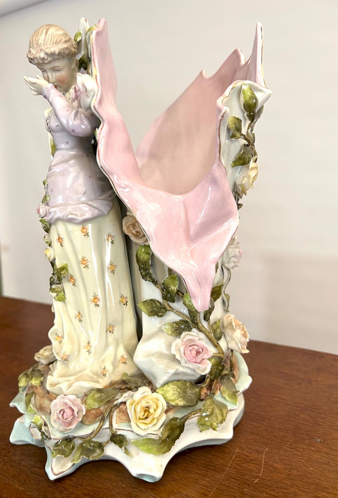 Grand vase figuratif Art Nouveau en porcelaine allemande – vers 1900 Superbe et imposant vase figuratif en porcelaine allemande, attribué à la région de Thuringe (dans l’esprit des productions de Sitzendorf), vers 1900. Cette pièce sculpturale représente une jeune femme élégamment vêtue, dans une attitude pensive, semblant lire les lignes de sa main. Elle est entourée d’un tourbillon de roses en relief et de feuillages finement modelés dans des tons pastel doux (rose poudré, ivoire, vert tendre). Le travail de modelage est particulièrement soigné : Expression délicate du visage Chevelure finement sculptée Drapé fluide typique de l’Art Nouveau Décor floral en fort relief L’arrière forme une élégante réserve en forme de coquille, constituant la partie vase. État Bon état ancien. Petites pertes discrètes sur certaines feuilles et pétales Deux doigts manquants à une main Pas de fêle ni de restauration visible Structure saine et stable Les défauts restent peu visibles en présentation et n’altèrent pas l’impact décoratif de la pièce. Dimensions Hauteur : 29 cm (11,4 inches) Largeur : 16 x 16 cm (6,3 x 6,3 inches) Poids : 1,7 kg Pièce décorative de caractère, idéale pour collectionneur d’Art Nouveau ou décoration d’intérieur raffinée. Envoi soigné et sécurisé. Type:vase Origine:allemagne Sous-type:Vase figuratif Pays d'origine:Allemagne Matière:Porcelaine Style:art nouveau
