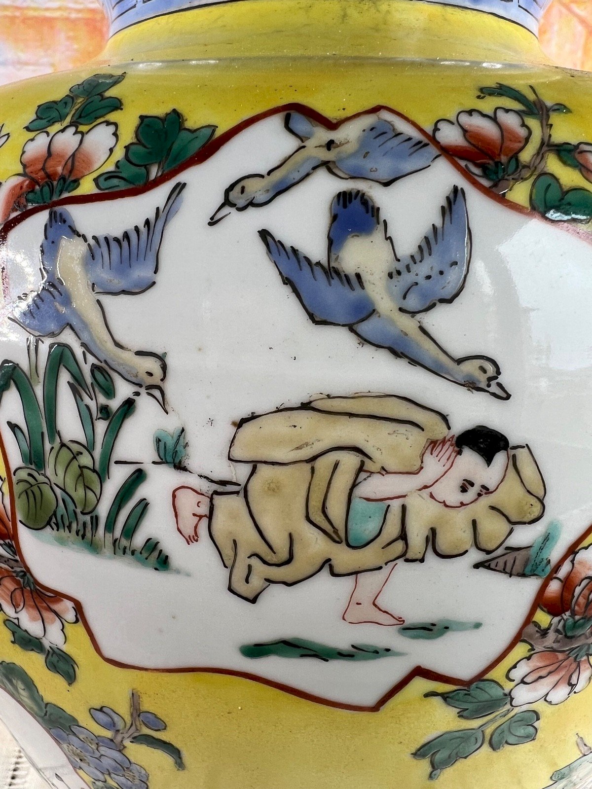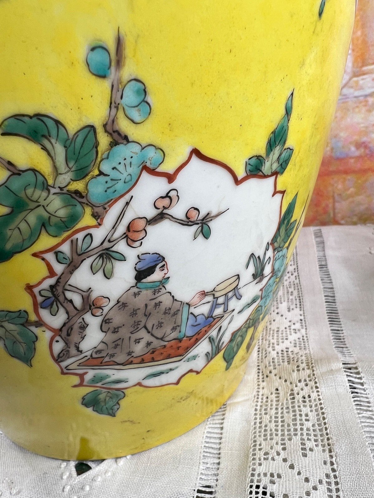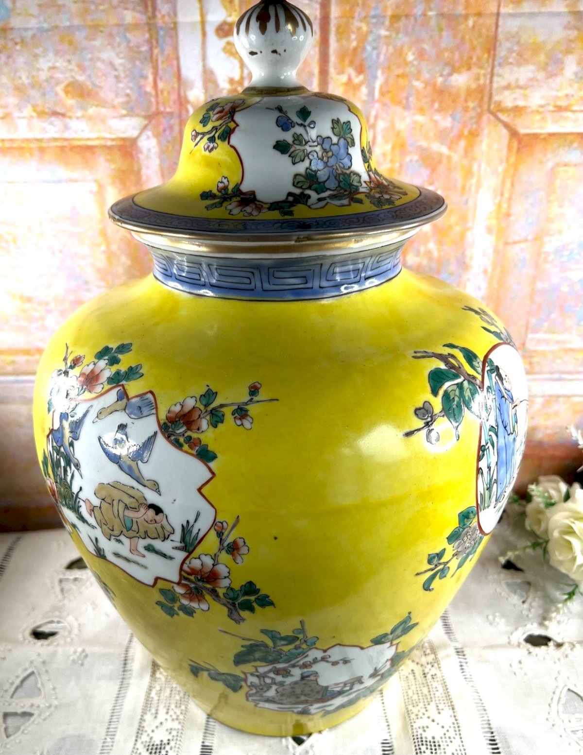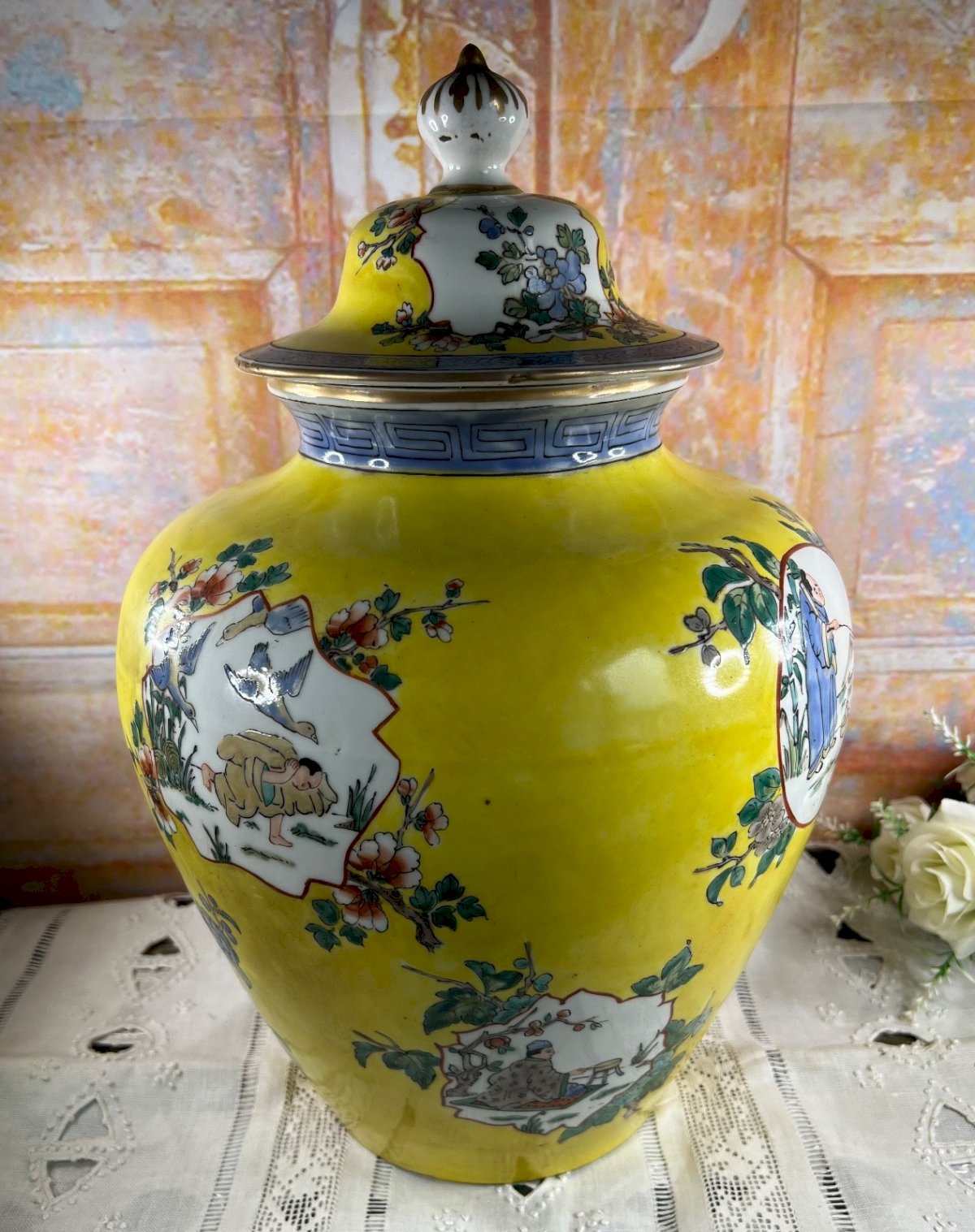 Superbe grand vase couvert en porcelaine émaillée polychrome, décoré à la main dans la palette dite Famille Jaune, avec scènes de vie, enfants, fleurs et oiseaux dans des cartouches fleuris sur fond jaune impérial éclatant. Une frise grecque bleue souligne le col, et le couvercle bombé se termine par un élégant bouton de prise. Au revers, la pièce porte une marque apocryphe de Qianlong, typique des porcelaines de belle qualité réalisées pendant la période républicaine (vers 1920–1940). Ce vase allie la finesse de la porcelaine chinoise traditionnelle à une esthétique décorative raffinée, parfaite pour une décoration intérieure élégante ou une collection d’art asiatique. Origine :  Chine Époque :  vers 1920–1940 (période républicaine) Matière :  porcelaine émaillée et peinte à la main Style :  Famille Jaune Décor :  scènes de personnages, fleurs et frises géométriques Hauteur :  40 cm (15,75 in) État :  excellent état général, très légères traces du temps, sans fêle ni éclat Marque :  marque apocryphe de Qianlong sous la base Pièce décorative d’une grande élégance, alliant couleur, symbolisme et tradition. Elle peut être exposée seule sur un piédestal ou mise en valeur par paire dans un intérieur classique ou contemporain. vase chinois ancien, porcelaine famille jaune, vase couvert chinois, porcelaine de chine, décor impérial, qianlong, république de chine, porcelaine peinte main, art asiatique, décoration orientale, grand vase chinois, céramique asiatique, vase jaune Pays d'origine:Chine