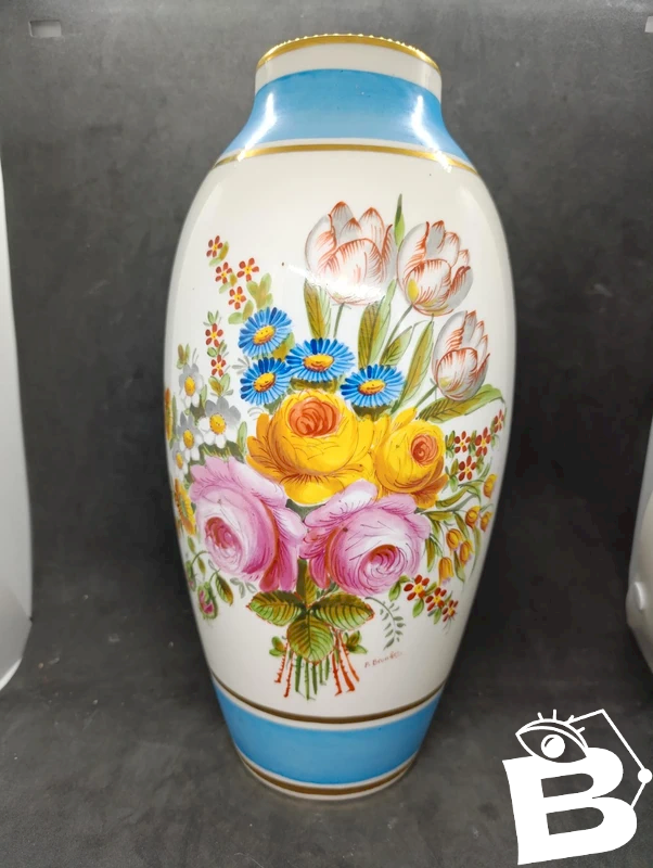 grand vase en porcelaine de limoges à decor floral fait main signé P. Brunhes en bon