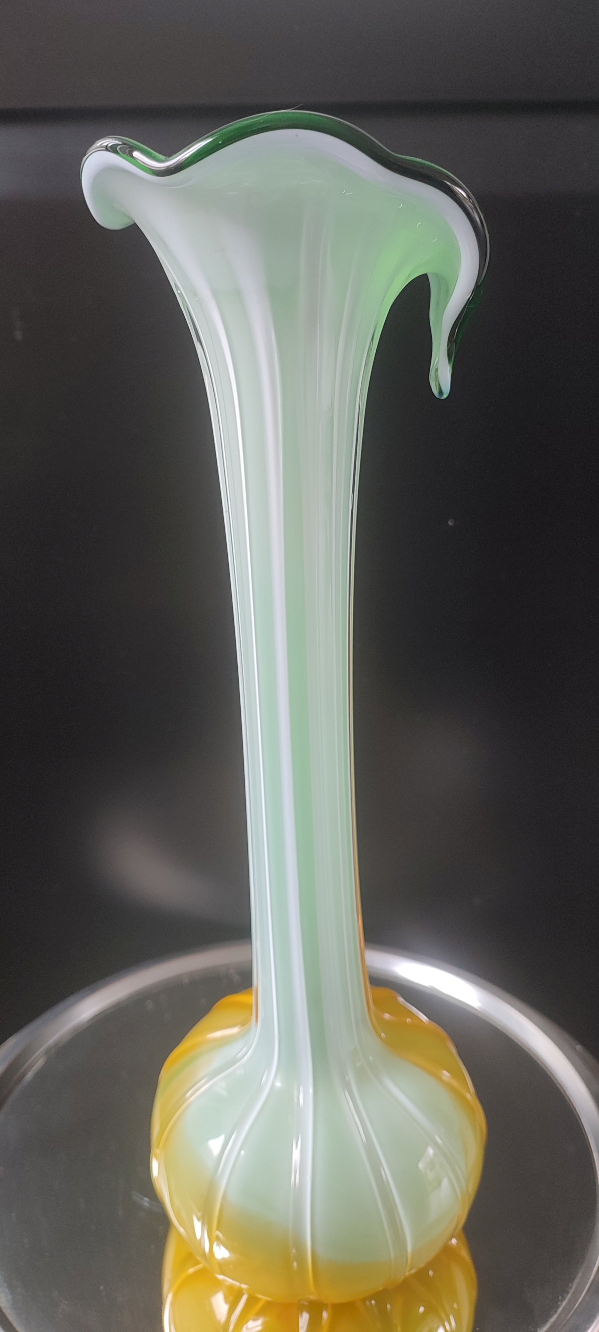Élégant Grand Vase Soliflore "Calla" vintage en verre d Art soufflé/opaline de Murano/Italie - Au design floral en forme de fleur d Arum à longue tige. Haut 41 cm