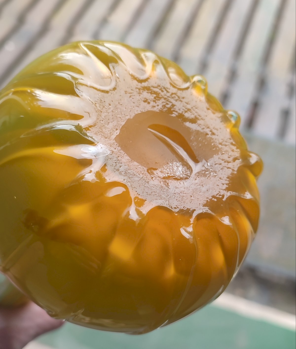 Grand vase en verre soufflé , Verrerie artistique années 70. Jaune/Vert Floral,Végétal/Rayé