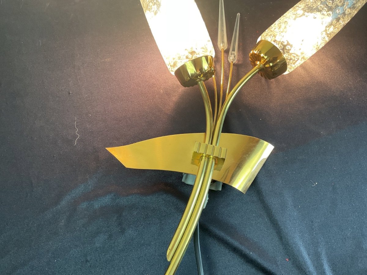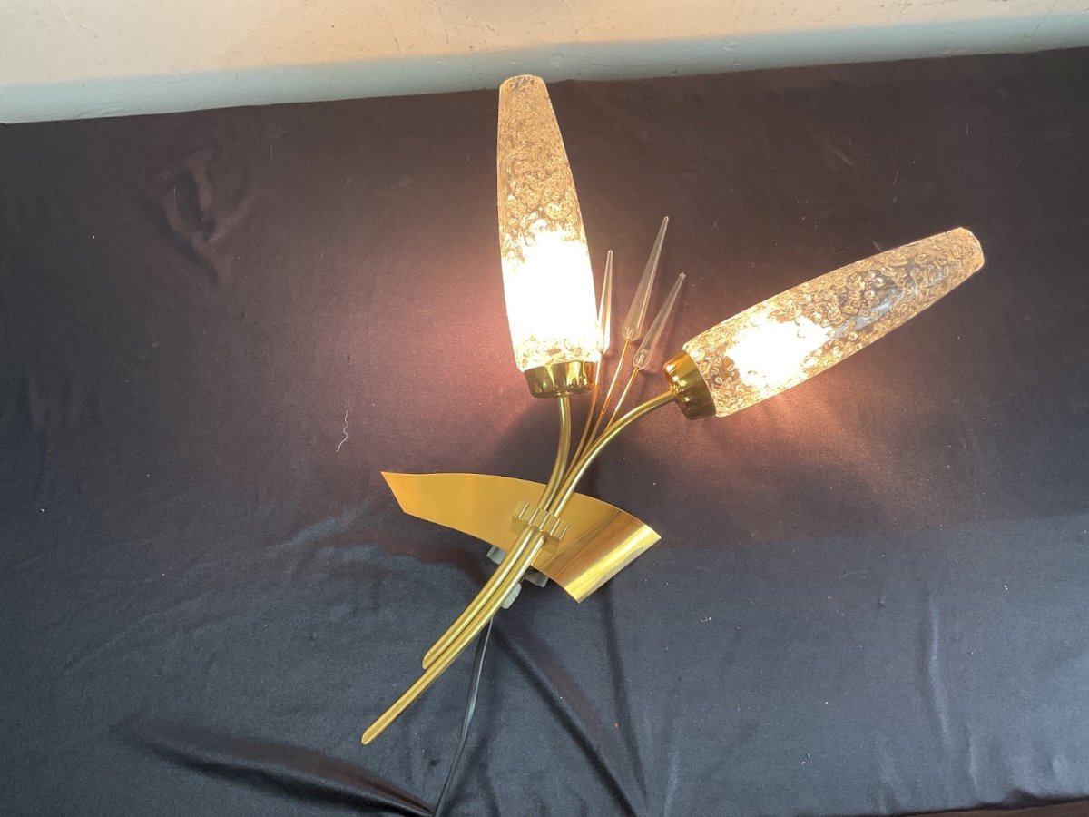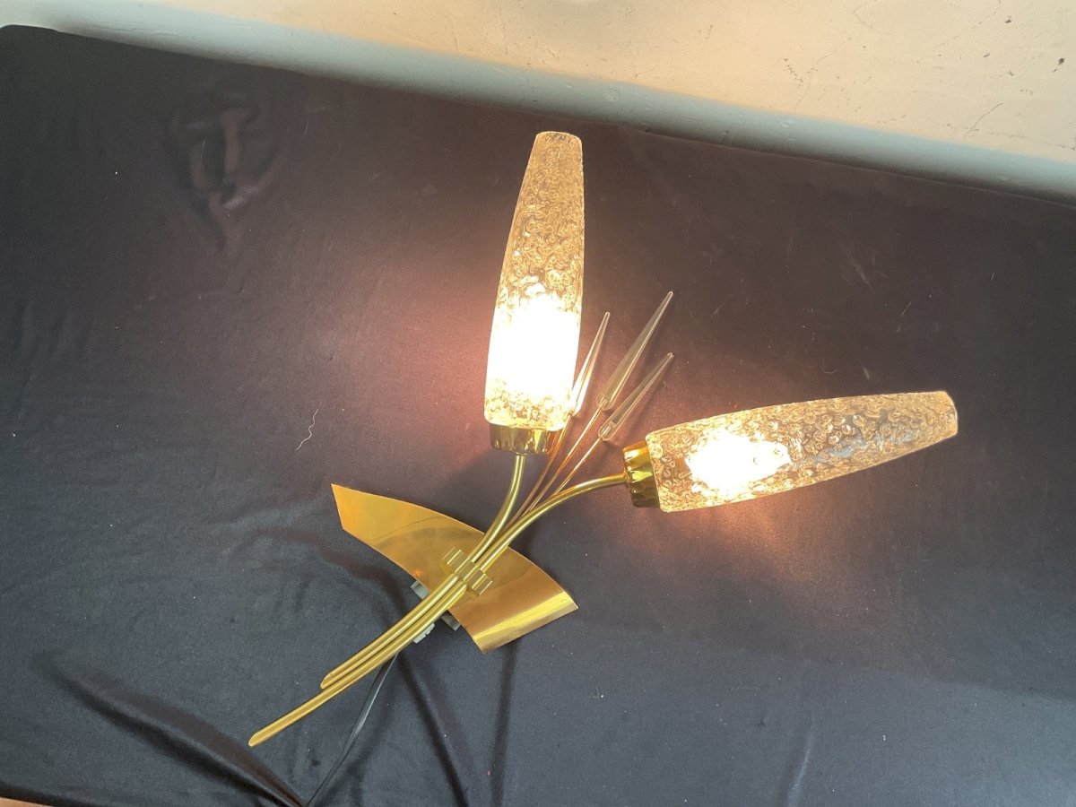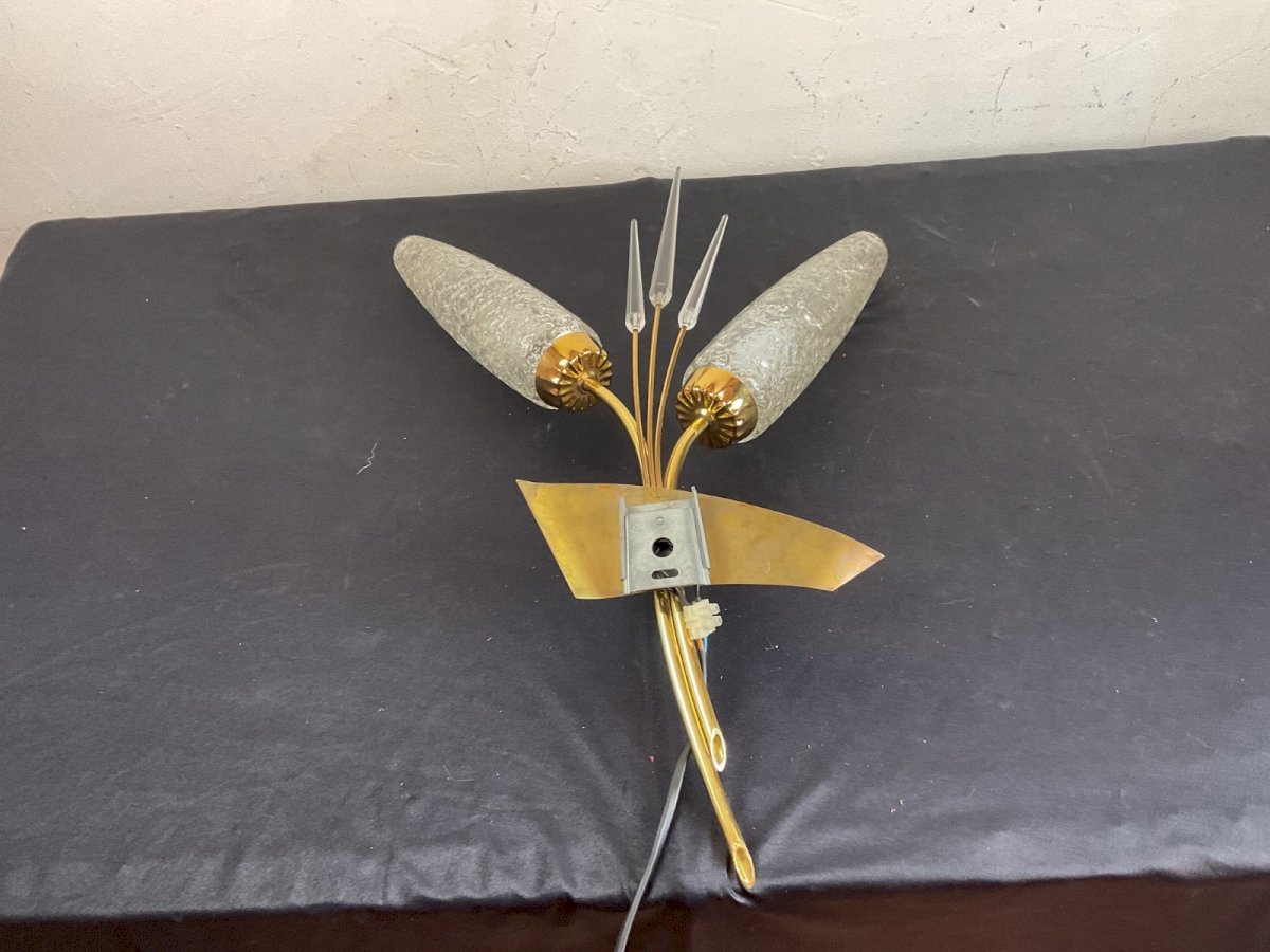 GRANDE APPLIQUE MODERNISTES MAISON Arlus EN LAITON Hauteur : 48 cm Largeur : 35 cm Type:Applique Marque:A Attribuer Période:1950 Moderniste Forme-Libre Sous-type:Intérieure Couleur dominante:dore Matière:Laiton Caractéristiques:A vis