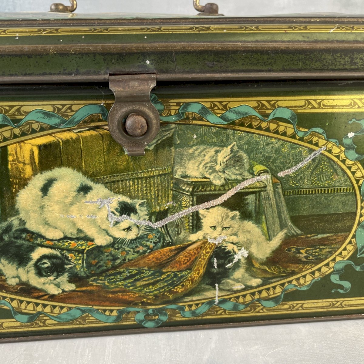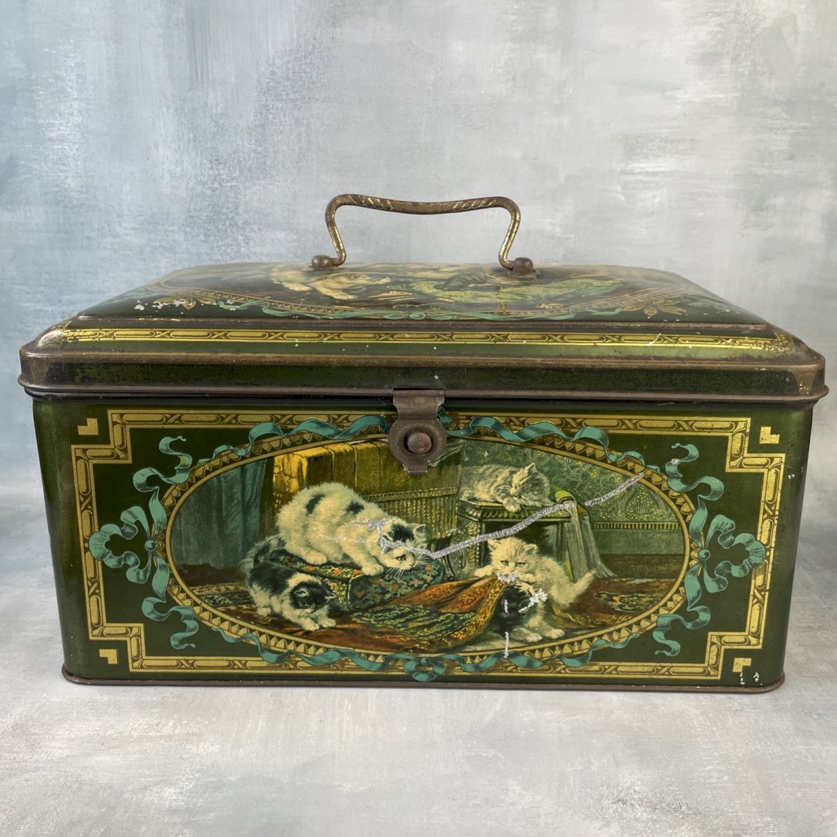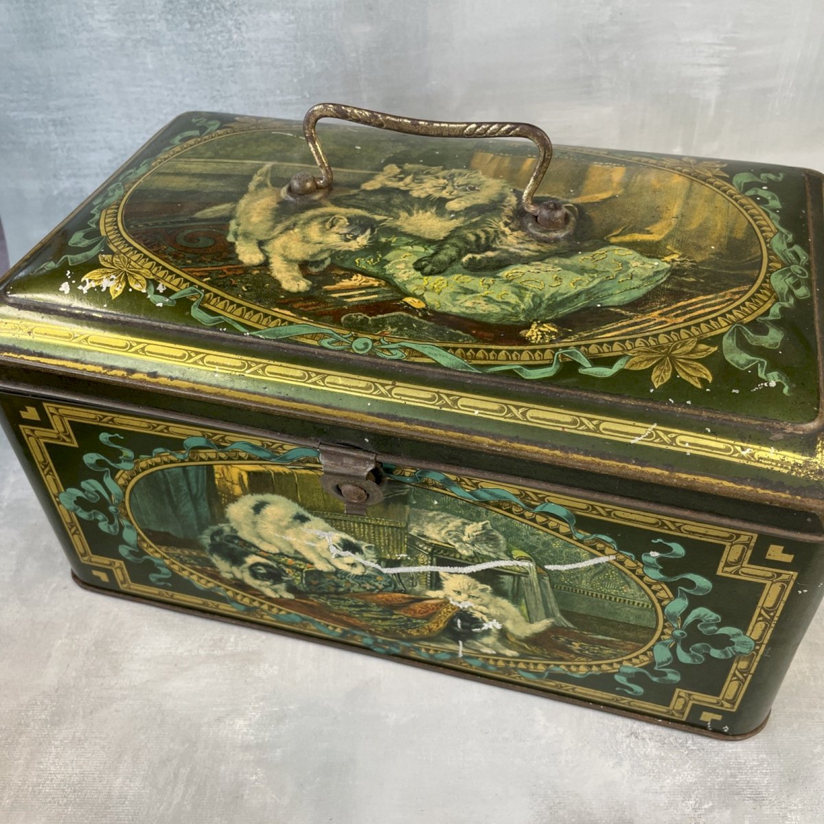 Grande boite coffre en tôle litho lithographiée à décor de chats chattons