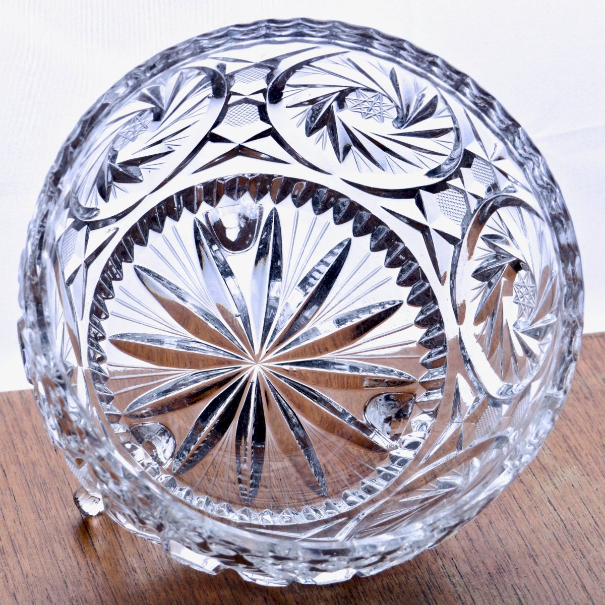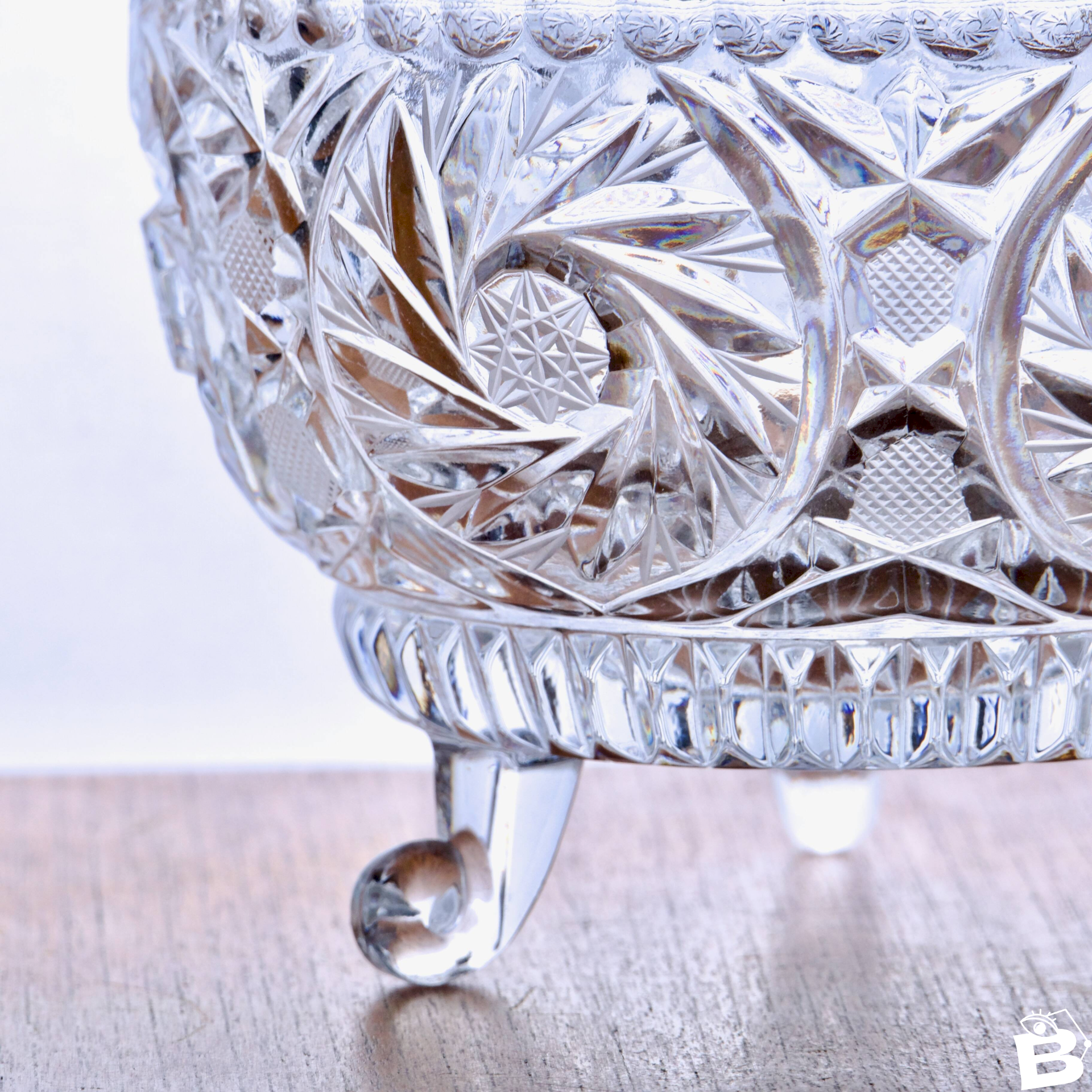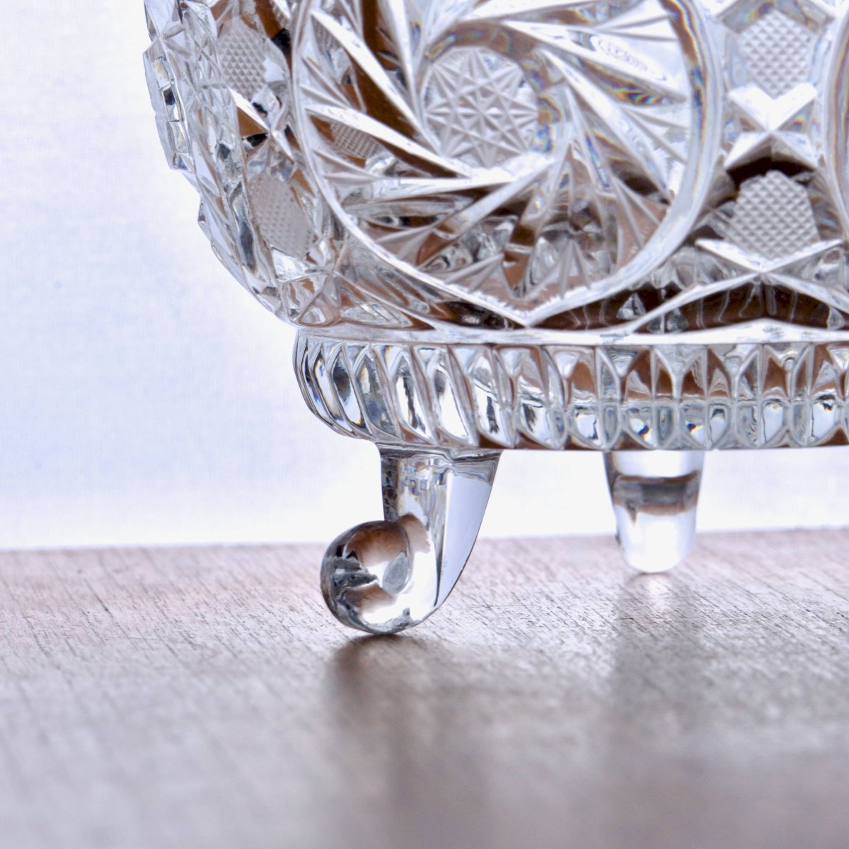 Magnifique Grande Bonbonnière en cristal de Bohème finement taillé tripode/reposant sur 3 pieds en forme de spirale - Richement décorée de motifs feuillus/croisillons/étoiles sophistiquées & formes géométriques 20 x 17,5 cm