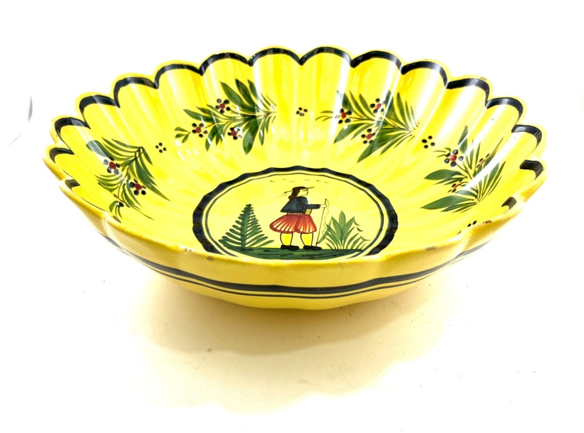 Magnifique  grande coupe ancienne en faïence de Quimper , décorée à la main d’un  breton traditionnel  au centre, entouré d’un motif floral vert et rouge sur un fond  jaune éclatant . Une pièce emblématique du savoir-faire breton, typique de la maison  Henriot Quimper . Cette large coupe, aux bords festonnés, peut se présenter en  centre de table , ou s’accrocher au mur pour une  décoration rustique et colorée . ? Détails : Diamètre :  33 cm Hauteur :  10 cm Poids :  1,5 kg Époque : milieu du XXᵉ siècle État : bon état général, petit  éclat d’émail  sur la bordure et  léger fêle  (voir photos) Signature : non visible (travail attribué à Henriot Quimper) Envoi soigné et sécurisé, avec double protection. ? Pourquoi on l’aime : Cette coupe incarne tout le charme de la  faïence bretonne artisanale  : un jaune solaire, un décor naïf et des lignes pleines de vitalité. Parfaite pour  illuminer une cuisine , une  maison de bord de mer  ou un  intérieur campagne chic . Pays d'origine:France