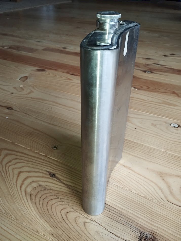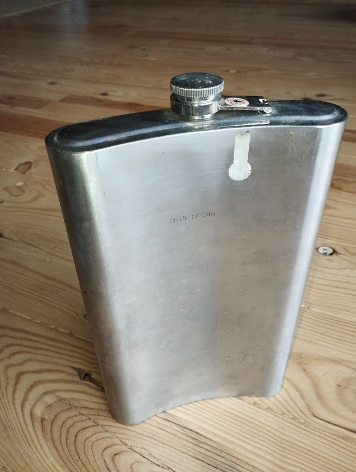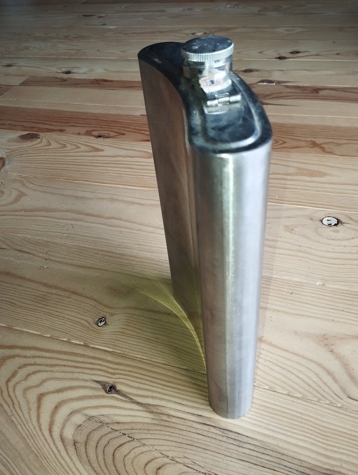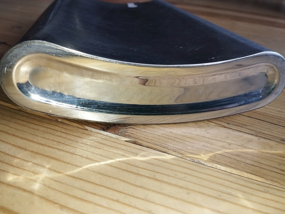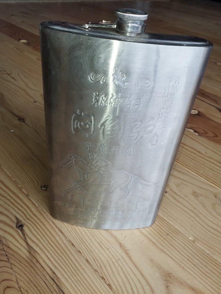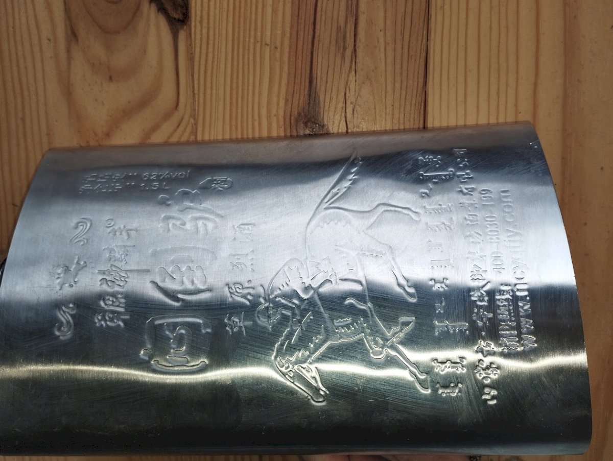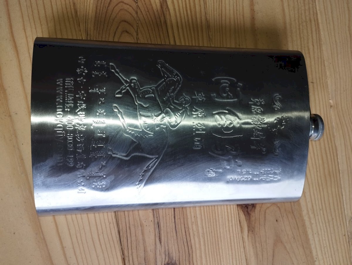 Imposante flasque décorative en acier inoxydable, de grand format (environ 35 cm), richement gravée de motifs et d’inscriptions chinoises, y compris sous la base.