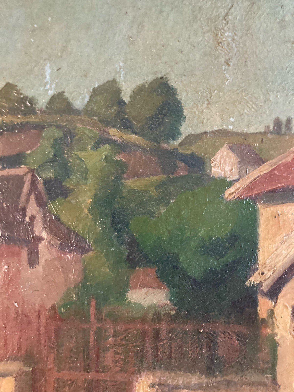 Grande Peinture 1920 Huile Carton Paysage École Française Village Ancien
