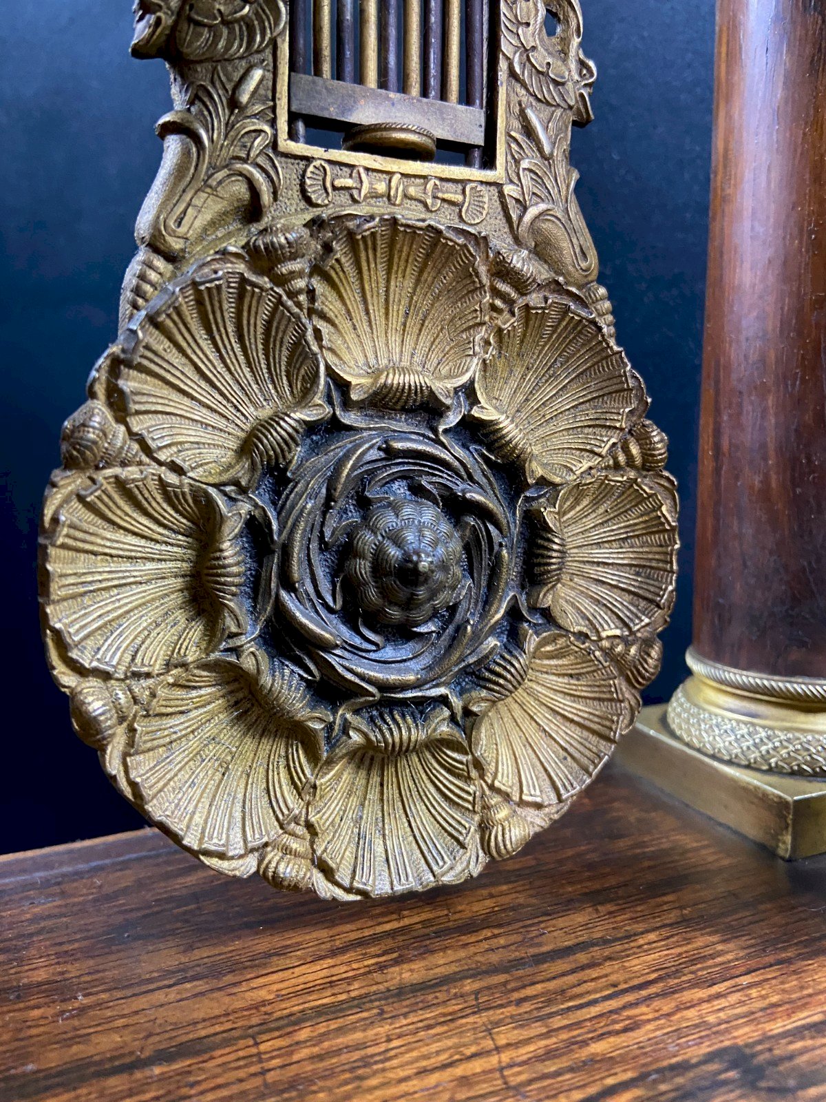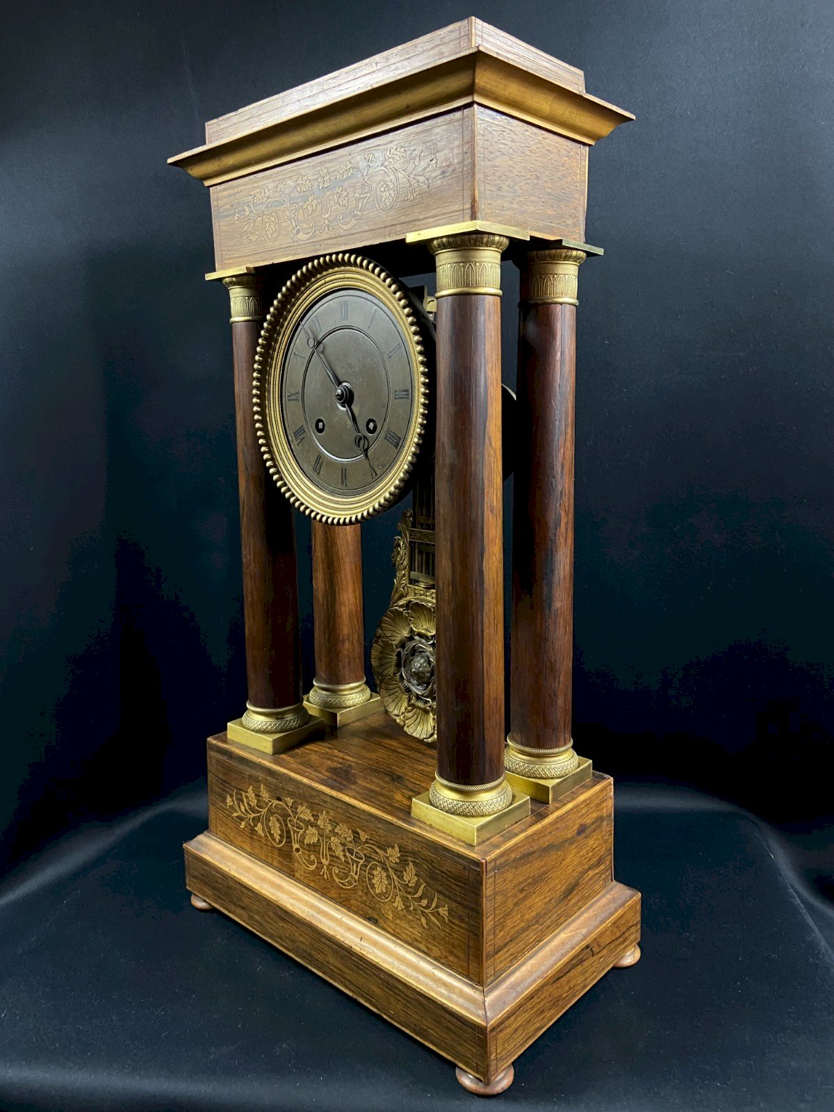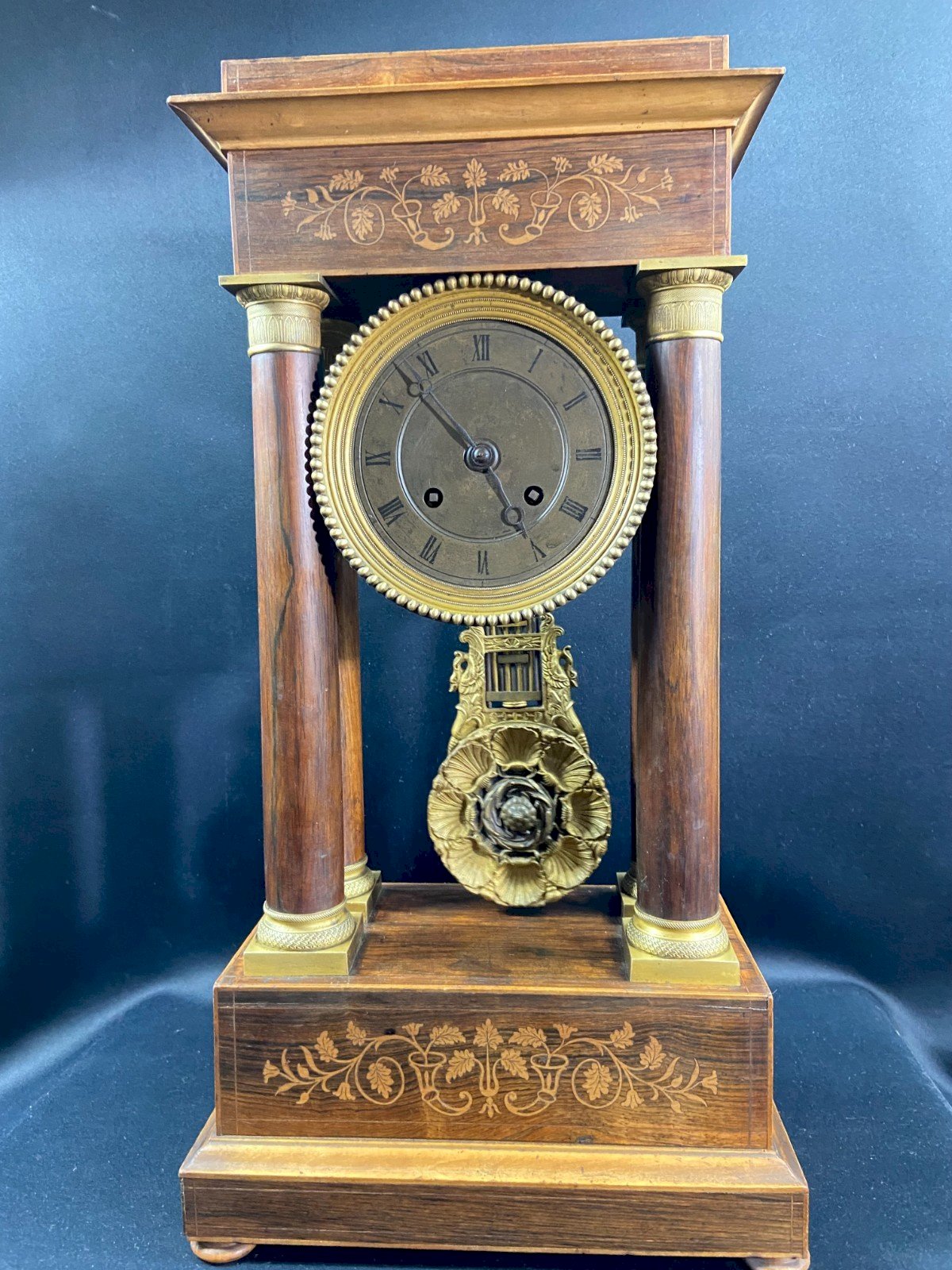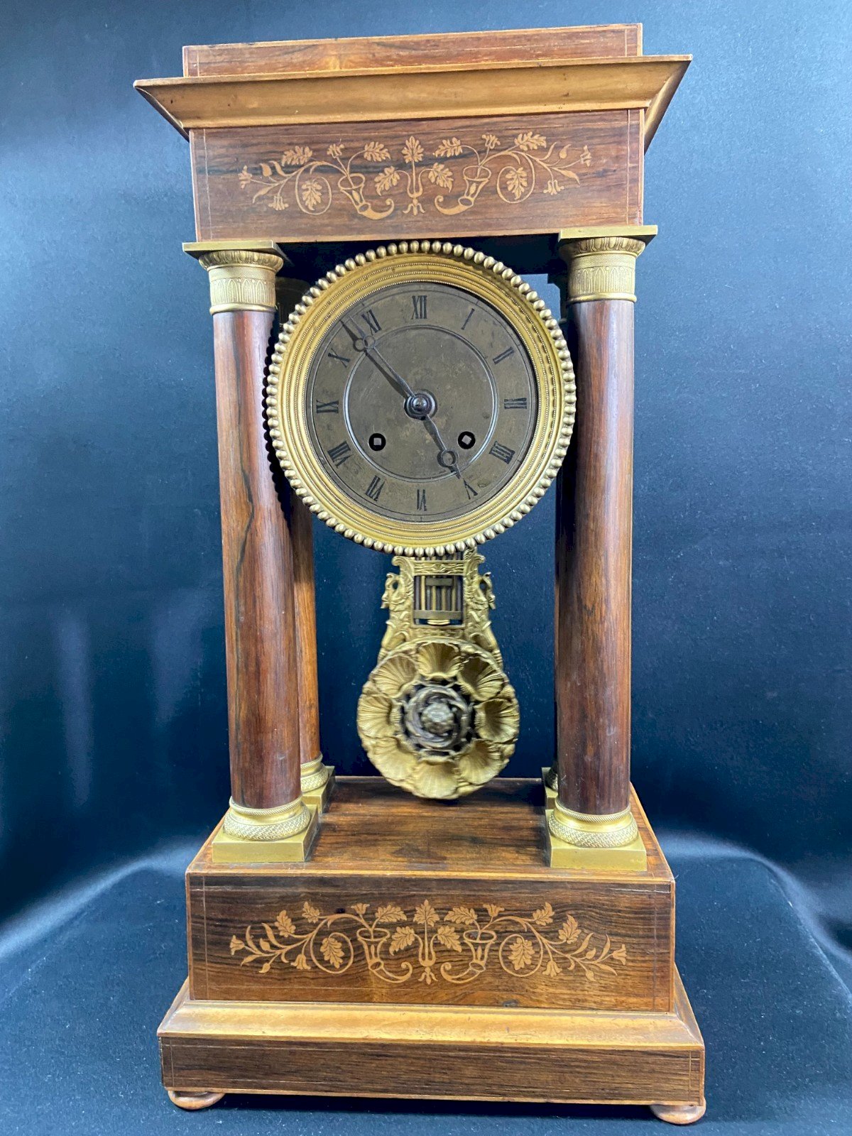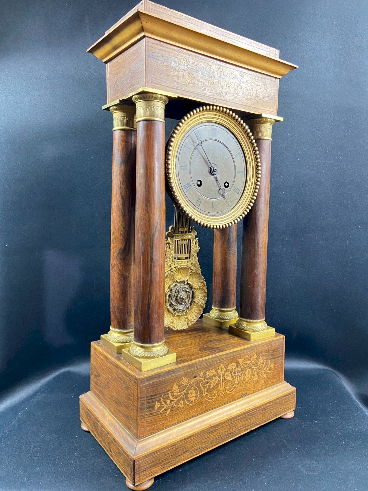 Grande pendule portique XIXe palissandre marqueté citronnier et bronze Charles X