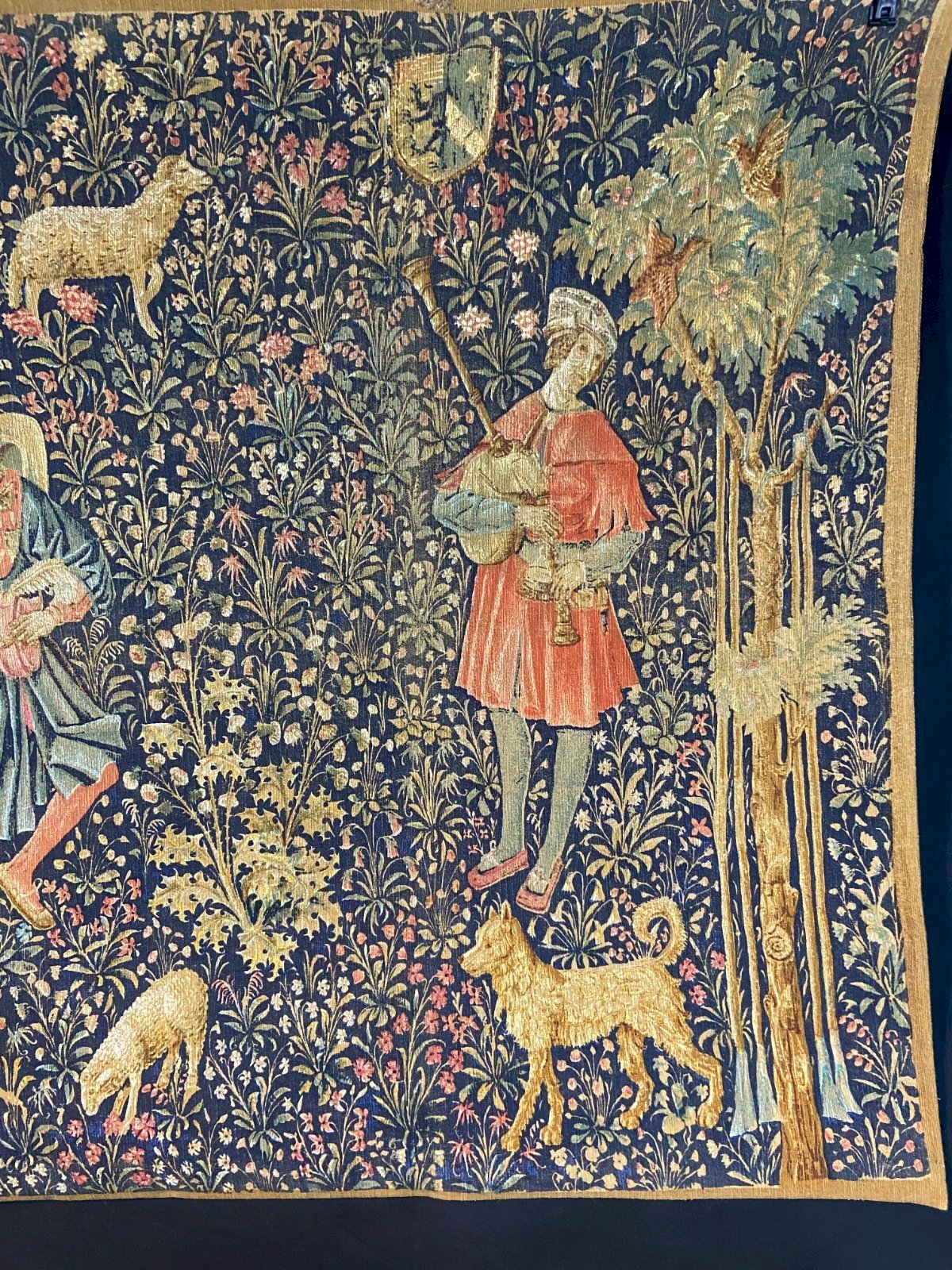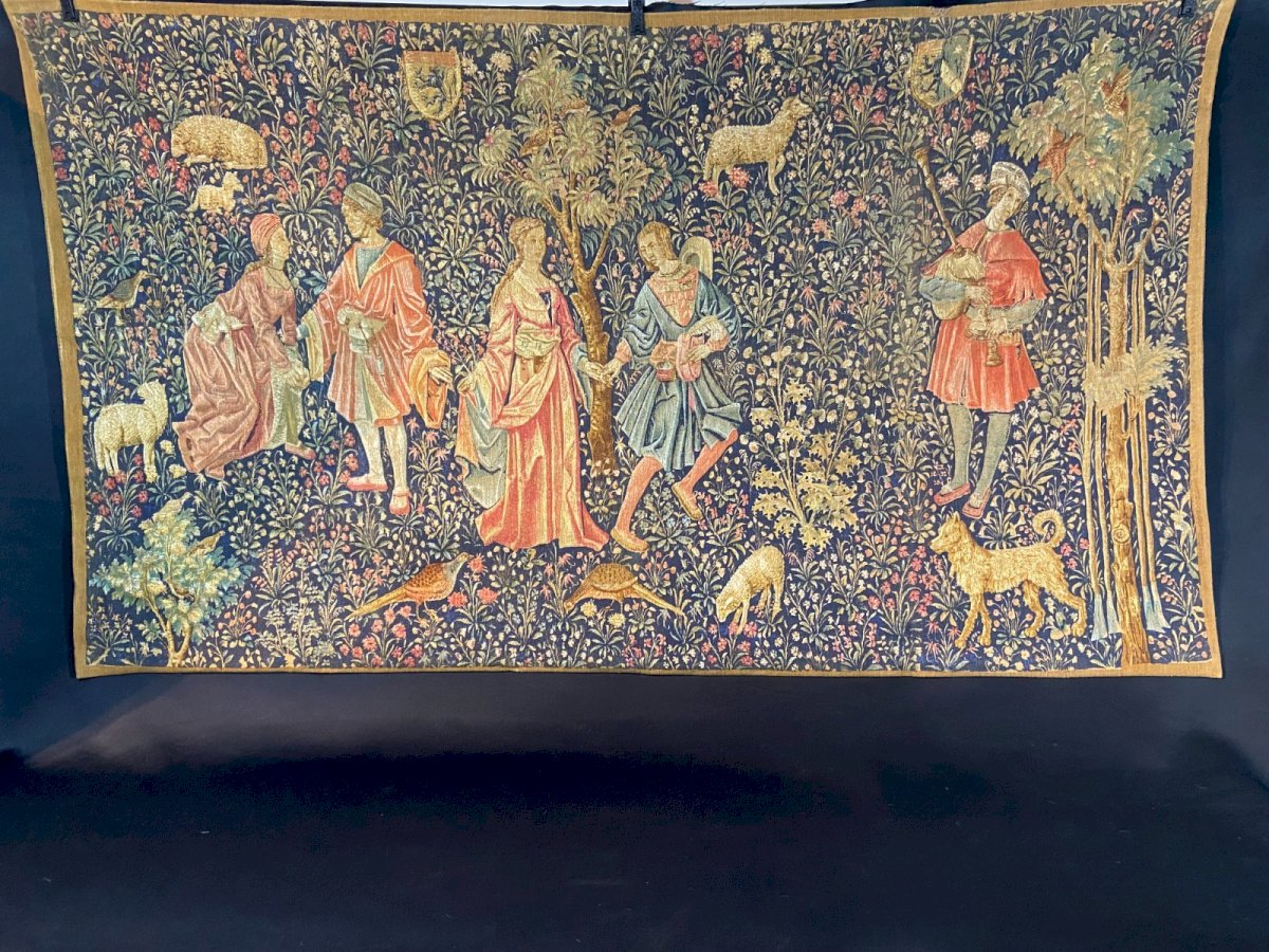 Grande tapisserie tirée d'une oeuvre du XVe siècle, titrée La Danse exposée au Musée du Louvres. Exemplaire réalisé par Artis Flora Dimensions max : 189,8 x 109,8 cm Poids : 1911 grammes Présence de 6 éléments de suspension Je ne signalerais qu'une discrète retouche en bordure supérieure  Envoi ultra sécurisé à destination du monde entier Retrait des commandes possible sur rendez-vous, 7 rue Notre-Dame 18000 Bourges. Possibilité de groupage au sein d'un même colis : merci de bien vouloir me contacter préalablement afin que je puisse calculer vos frais de transport optimisés. Pays d'origine:France Couleur dominante:Bleu Matière dominante:Laine Forme:Rectangle