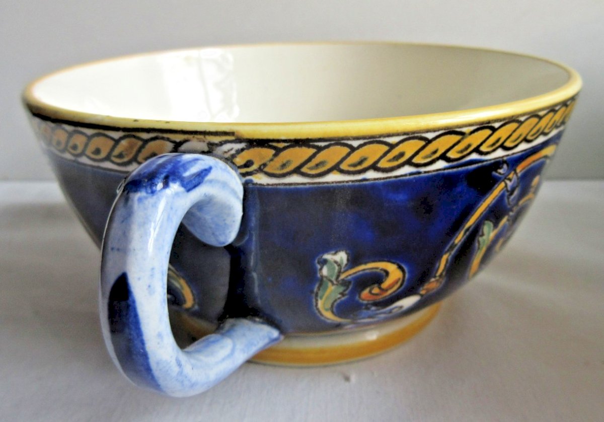 Grande tasse signée GIEN, style Renaissance, 3 personnages et arabesques