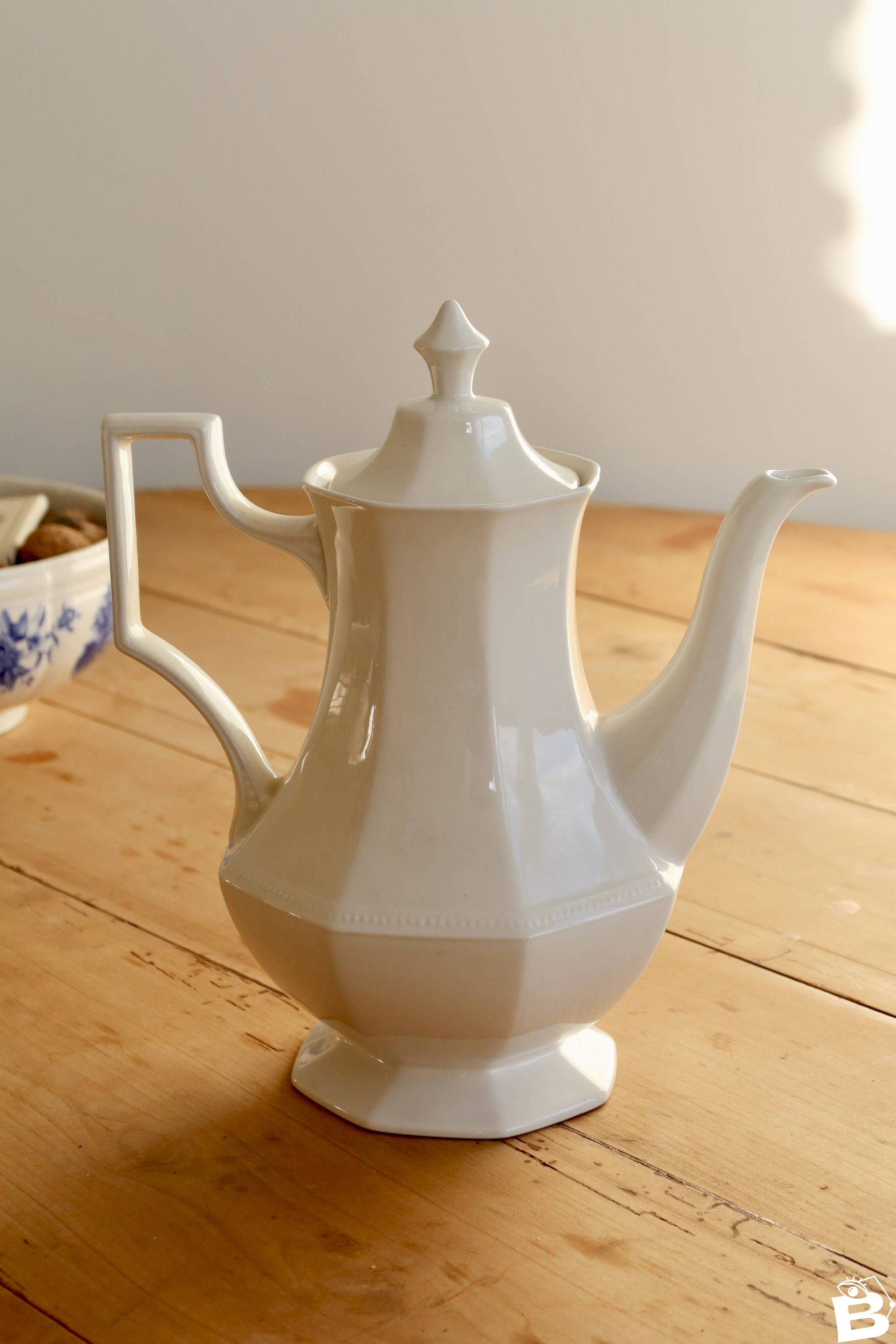Silhouette facettée, anse angulaire, long bec verseur et frise perlée en léger relief soulignent son style classique intemporel.