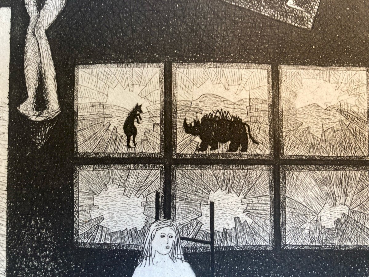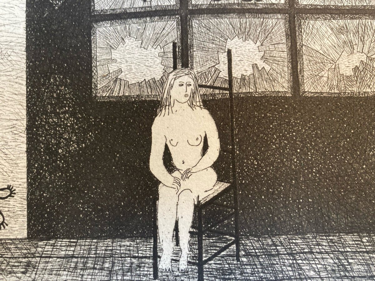 Gravure 1970 Antoine Agra Surréaliste Surréalisme Rhinocéros pointe sèche Femme