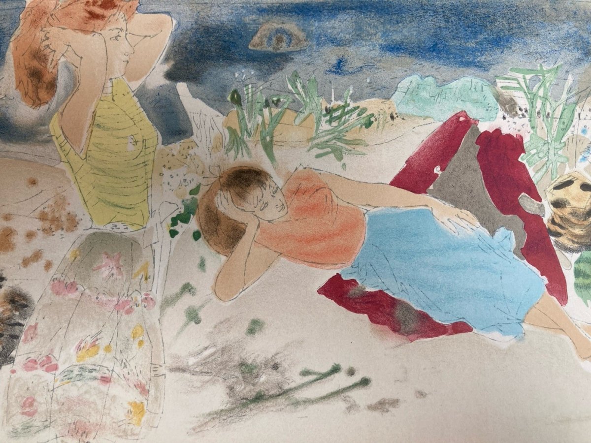 Gravure Lithographie 1950 Ancien La Plage Mer Méditerranée Art À Identifier XXe