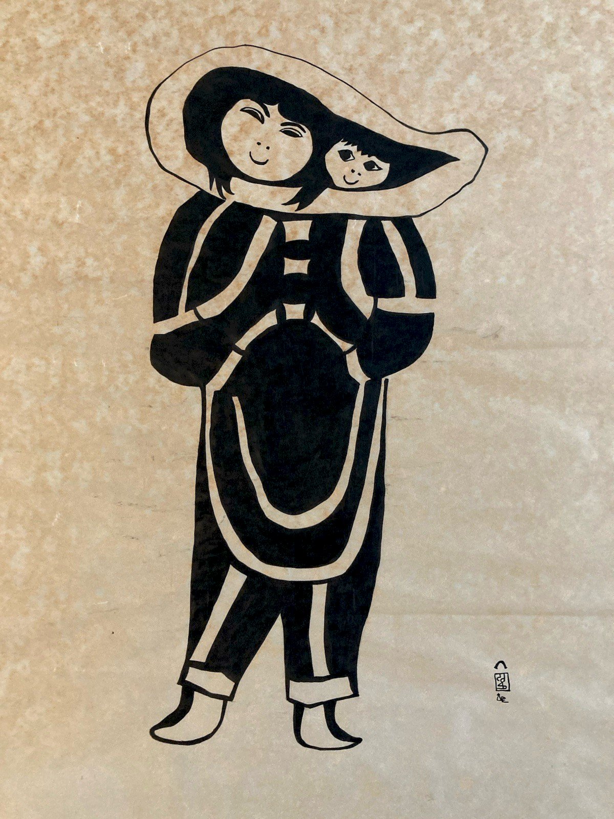 La gravure Young Woman (Jeune Femme) de l’artiste inuit Shekoaloak est une œuvre rare et précieuse, tant par sa qualité artistique que par son importance historique dans l’émergence de l’art graphique inuit contemporain. ⸻ ? Présentation de l’œuvre : Young Woman (1959) Réalisée en 1959, Young Woman est une gravure sur pierre (stonecut)L’œuvre fait partie de la toute première collection officielle de gravures publiée par le Cape Dorset Print Studio, marquant un tournant dans l’histoire de l’art inuit.   La composition met en scène une jeune femme debout, représentée avec une grande simplicité formelle et une élégance linéaire. Le style épuré, caractéristique des premières gravures de Cape Dorset, reflète une esthétique moderniste influencée par les traditions visuelles inuites. Cette gravure a été présentée dans des ventes aux enchères spécialisées, notamment chez Waddington’s à Toronto, où elle a été estimée entre 3 000 et 5 000 dollars canadiens. Elle est également référencée dans les bases de données de l’art inuit, comme celle de la Galerie nationale du Canada.  ⸻ ? Biographie de l’artiste : Shekoaloak (ca. 1940–1959) Shekoaloak était un artiste inuit originaire de Kinngait (anciennement Cape Dorset), dans l’actuel Nunavut. Né vers 1940, il est décédé prématurément en 1959, à l’âge d’environ 19 ans. Malgré sa courte vie, il a contribué de manière significative à l’émergence de l’art graphique inuit moderne.  Son œuvre Young Woman est l’une des rares gravures connues de lui, ce qui rend cette pièce d’autant plus précieuse. Elle témoigne de la vitalité artistique de la communauté de Cape Dorset à la fin des années 1950, période durant laquelle des artistes comme Kenojuak Ashevak, Pitseolak Ashoona et Tudlik ont également commencé à se faire connaître.  Shekoaloak a participé à la première collection de gravures publiée par le Cape Dorset Print Studio en 1959, aux côtés d’autres artistes pionniers. Cette initiative, soutenue par James Houston, visait à promouvoir l’art inuit auprès d’un public plus large et à offrir de nouvelles opportunités économiques aux artistes du Nord canadien.  ⸻ ? Importance historique et artistique Young Woman est bien plus qu’une simple gravure : elle représente un moment fondateur de l’histoire de l’art inuit contemporain. En tant que l’une des premières œuvres publiées par le Cape Dorset Print Studio, elle incarne l’émergence d’une nouvelle forme d’expression artistique, mêlant traditions inuites et techniques modernes de gravure. La rareté des œuvres de Shekoaloak, combinée à la qualité esthétique de Young Woman, en fait une pièce particulièrement recherchée par les collectionneurs et les institutions muséales. Elle est régulièrement présentée dans des expositions consacrées à l’art inuit et figure dans des collections publiques et privées de renom. ⸻ ? Références et ressources complémentaires • Waddington’s Auction House : catalogue de la vente aux enchères de mai 2013, incluant Young Woman de Shekoaloak.  • First Arts : présentation détaillée de l’œuvre Young Woman (1959). • ArtValue.ca : informations sur les ventes aux enchères et la valeur des œuvres de Shekoaloak. • Galerie nationale du Canada : base de données des artistes inuits, La gravure est en très bon état général, Style:1940-1960 Genre:Art brut, Outsider art Caractéristiques:Sur Papier Thème:Personnage