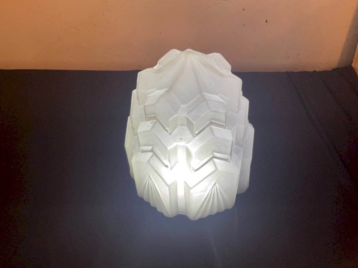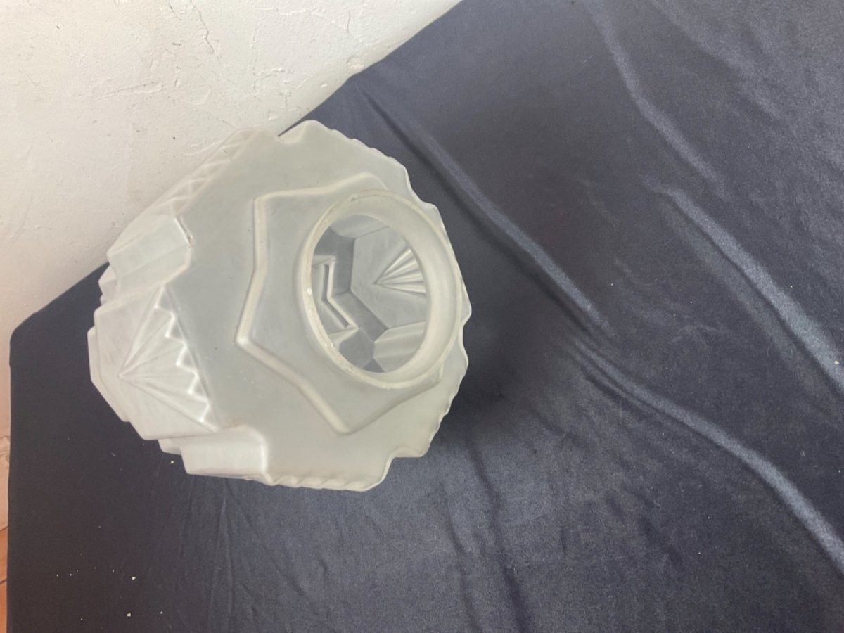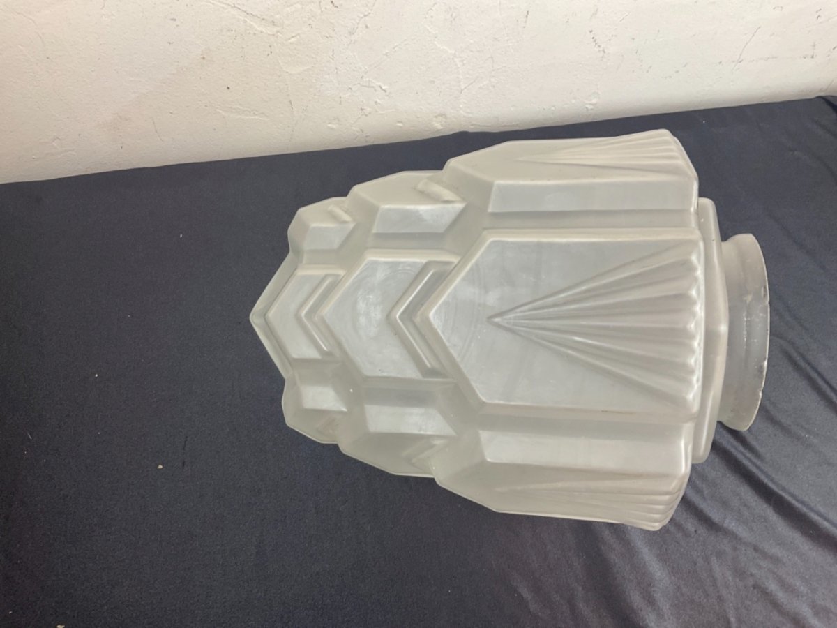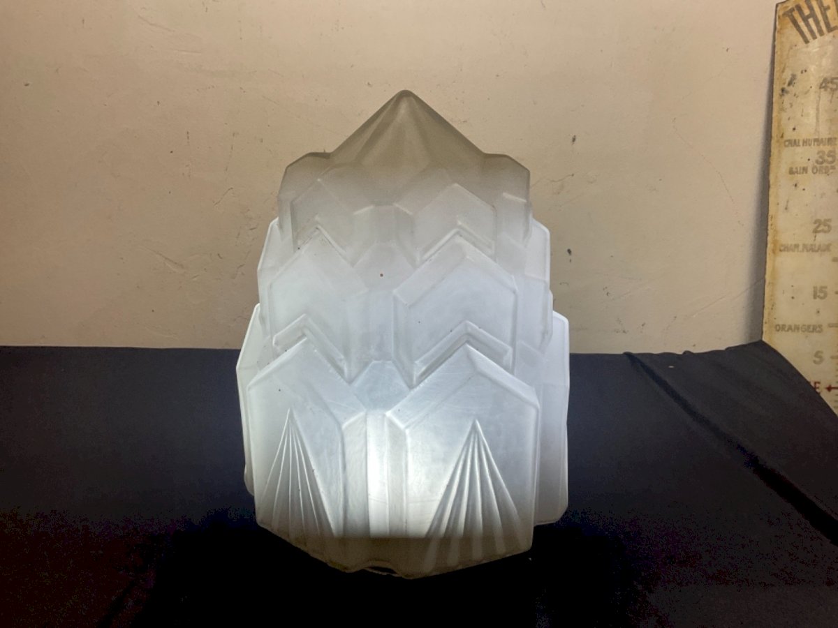 Gros GLOBE lustre  PLAFONNIER ART DÉCO Blanc 1930/50  BUILDING SKYSCRAPER Hauteur : 28 cm Diamètre : 20 cm Type:Plafonnier Période:Art Déco Couleur dominante:Blanc Matière:Verre