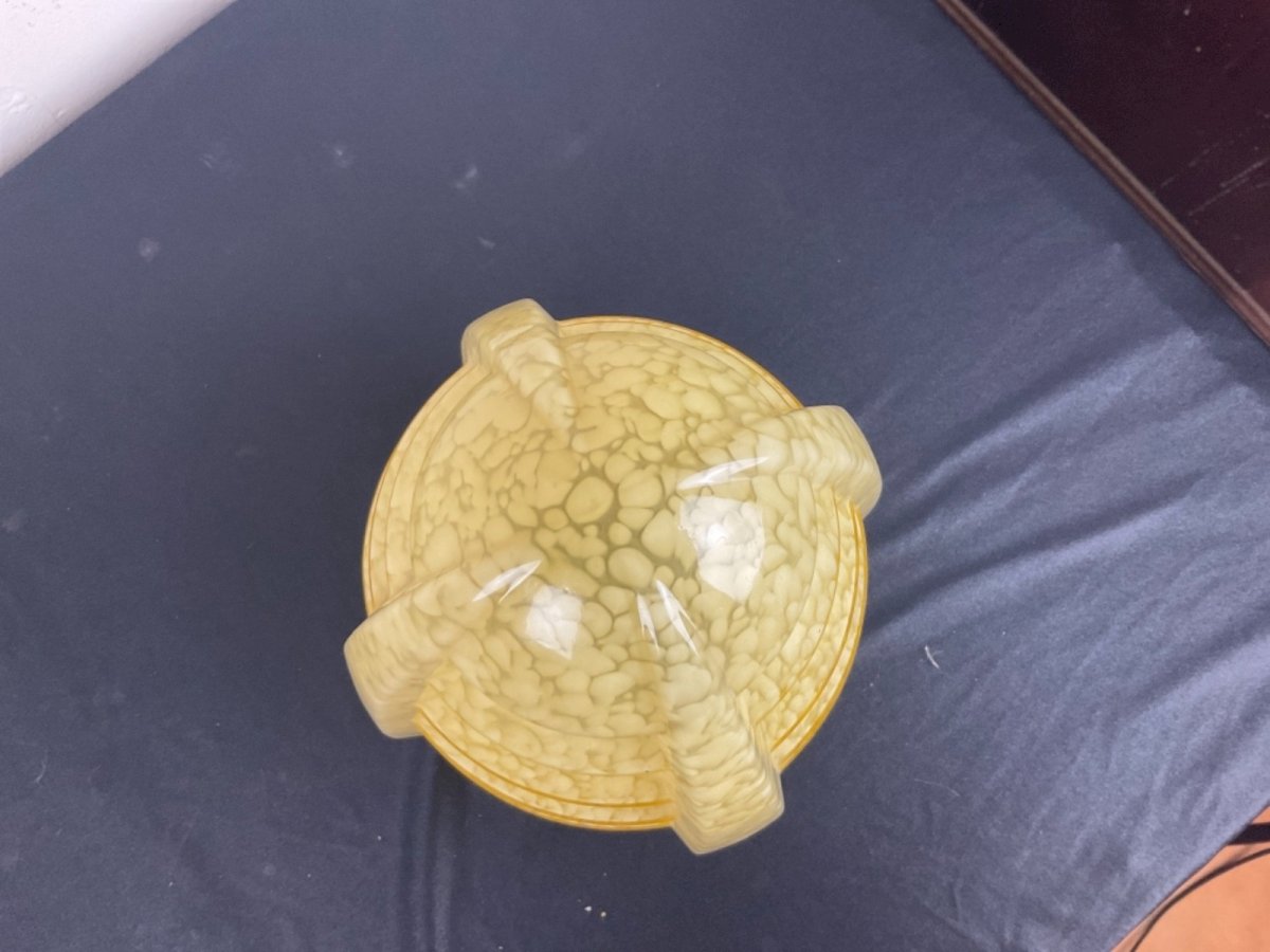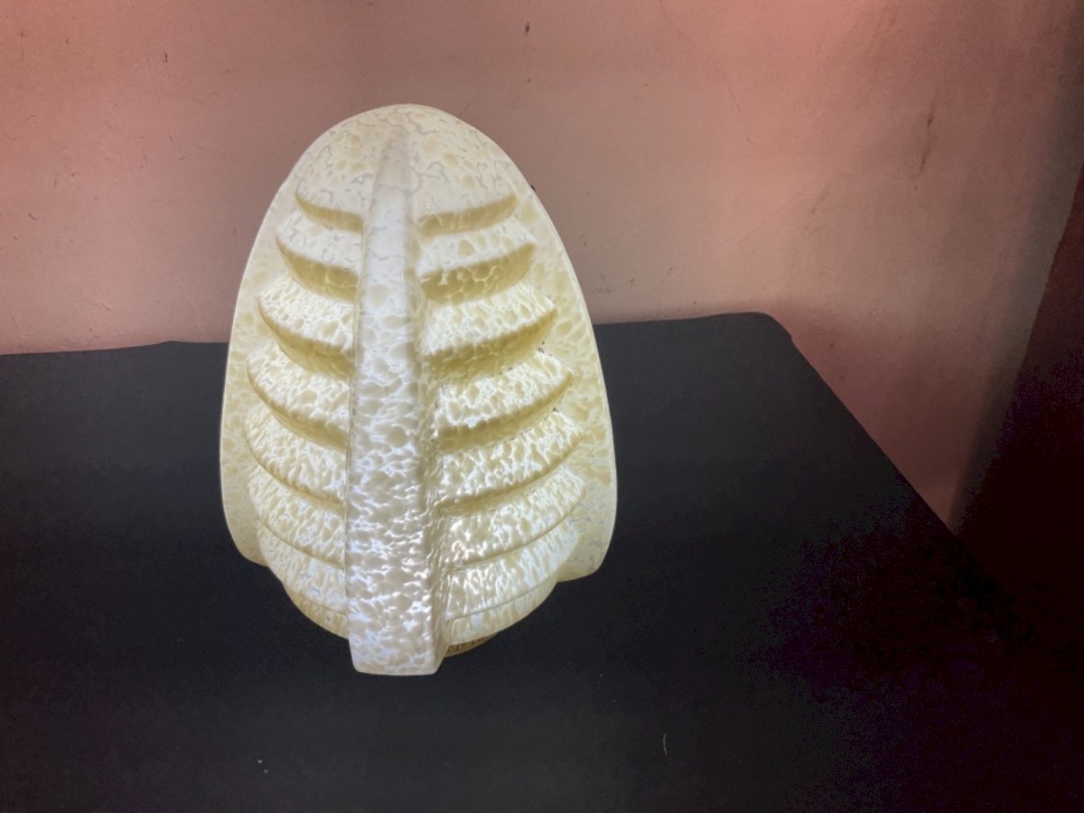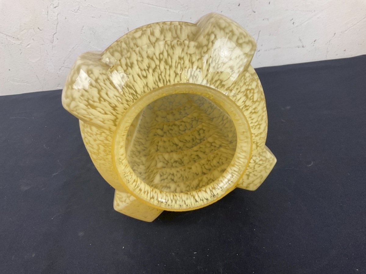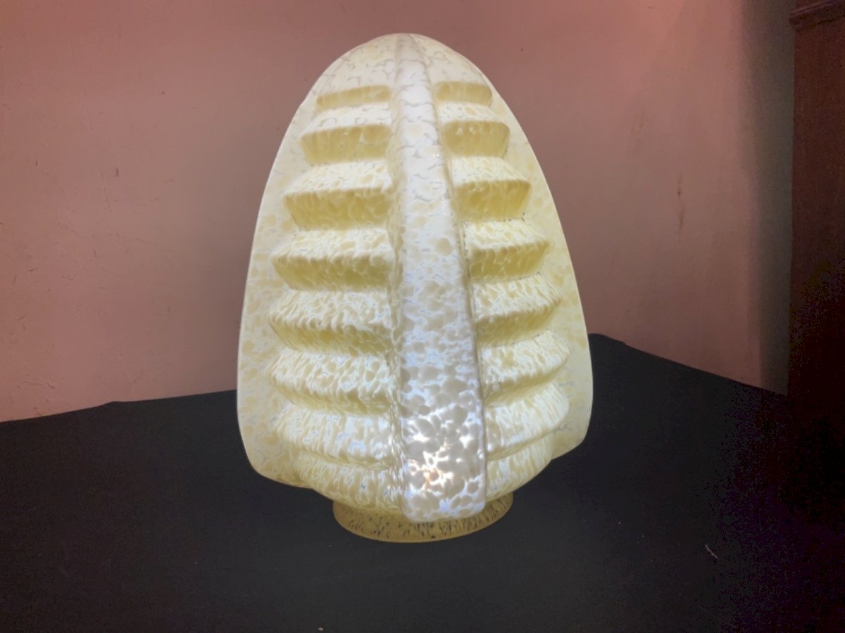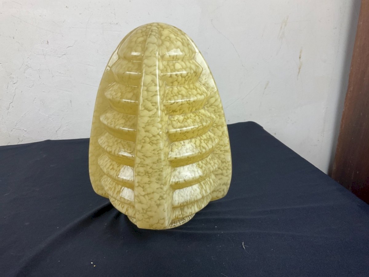 Gros GLOBE obus lustre PLAFONNIER ART DÉCO 1930  BUILDING SKYSCRAPER Probablement Verrerie Clichy  Hauteur : 24,5 cm Largueurs : 18 cm Type:Plafonnier Période:Art Déco Couleur dominante:mouchetter Matière:Verre