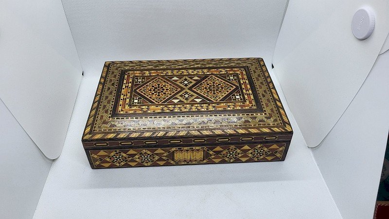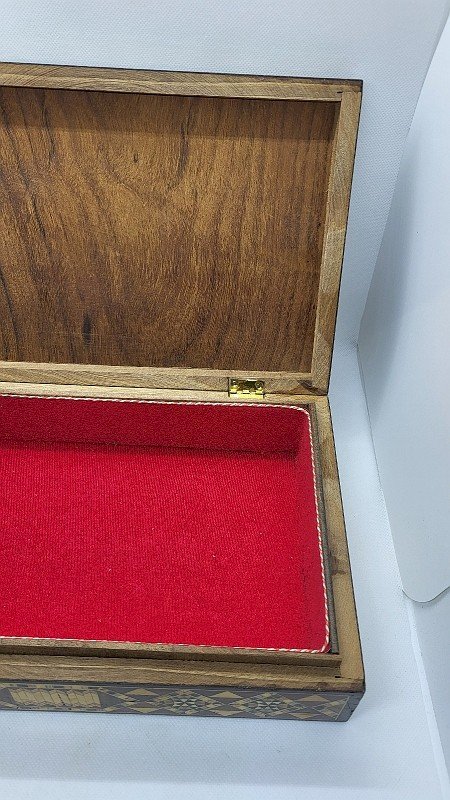 jolie et grosse boîte en bois marqueterie Damasquiné elle est en très bon état il y a un très beau travail elle mesure 29.5 cm de large sur 19.5 cm de profondeur et 7 cm de haut Type:Objet de vitrine, Décoratif Pays d'origine:France métropolitaine Sous-type:Boîte Matière:Bois