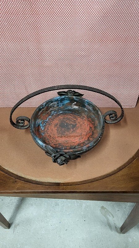 GROSSE COUPE CENTRE DE TABLE EN PATE DE VERRE ET FER FORGE ART DECO